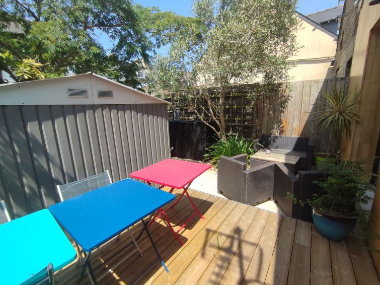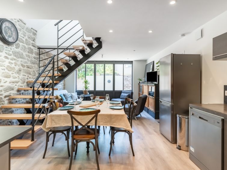 "Les Minquiers", 4-room apartment 100 m2 on 2 levels, on the ground floor. Fully renovated, beautiful and tasteful furnishings: large living/dining room with TV (flat screen). 1 room with panoramic window with 1 french bed (1 x 160 cm, length 200 cm), hand-basin and shower. Exit to the terrace.