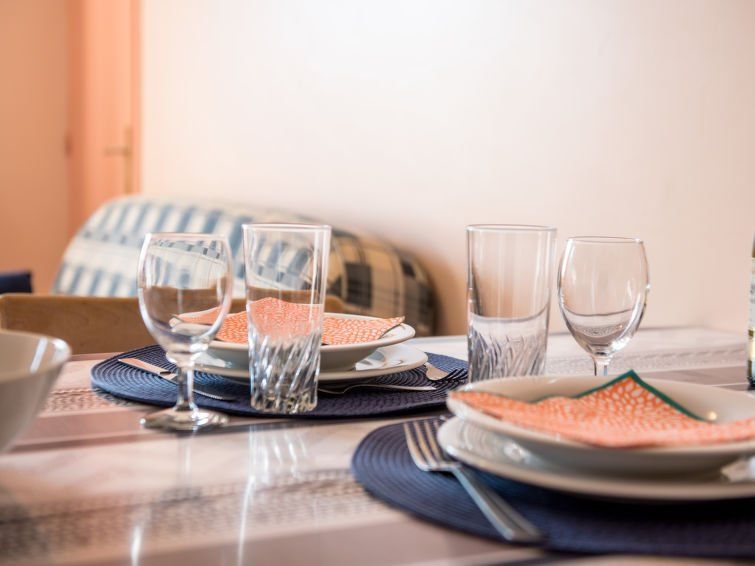 1-room studio 43 m2 on 2 levels, on the ground floor. Beautiful furnishings: living/dining room with TV (flat screen). Open kitchen (4 hot plates, oven, electric coffee machine). Upper floor: open gallery with sloping ceilings with 2 beds (90 cm, length 190 cm). Shower/WC. Small patio 8 m2.