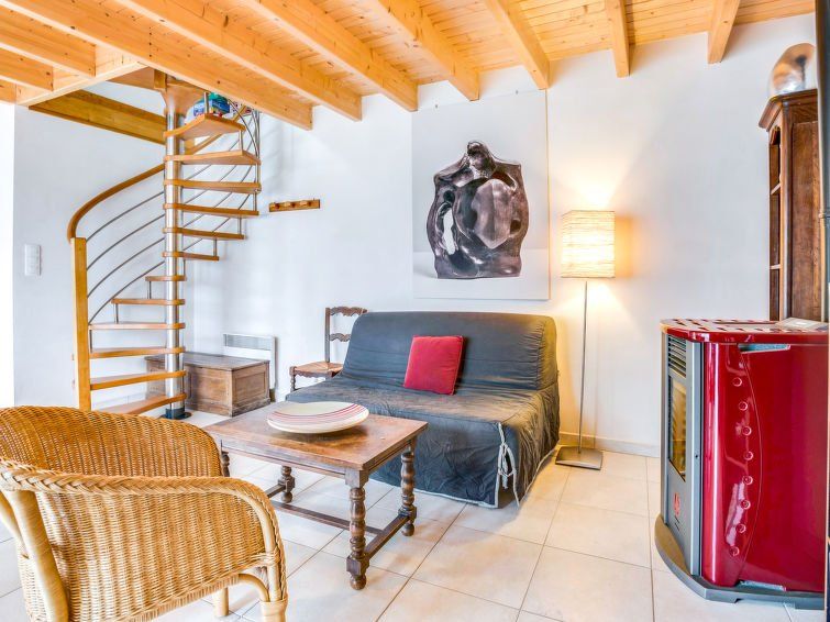 3-room house 50 m2 on 2 levels. Object suitable for 2 adults + 2 children. Living/dining room with hi-fi system and wood-burning stove. Exit to the garden. Open kitchen (3 hot plates, dishwasher, freezer, electric coffee machine, combination microwave). Upper floor: (spiral staircase), 1 room with 1 french bed (140 cm, length 190 cm), TV and DVD.