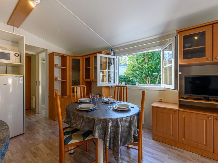"La Spatule", 3-room mobile home 36 m2. Comfortable furnishings: living/dining room. Exit to the terrace. 1 room with 1 double bed (140 cm, length 190 cm). 1 room with 2 beds (80 cm, length 190 cm). Kitchenette (4 hot plates, toaster, kettle, microwave, electric coffee machine). Shower, sep.