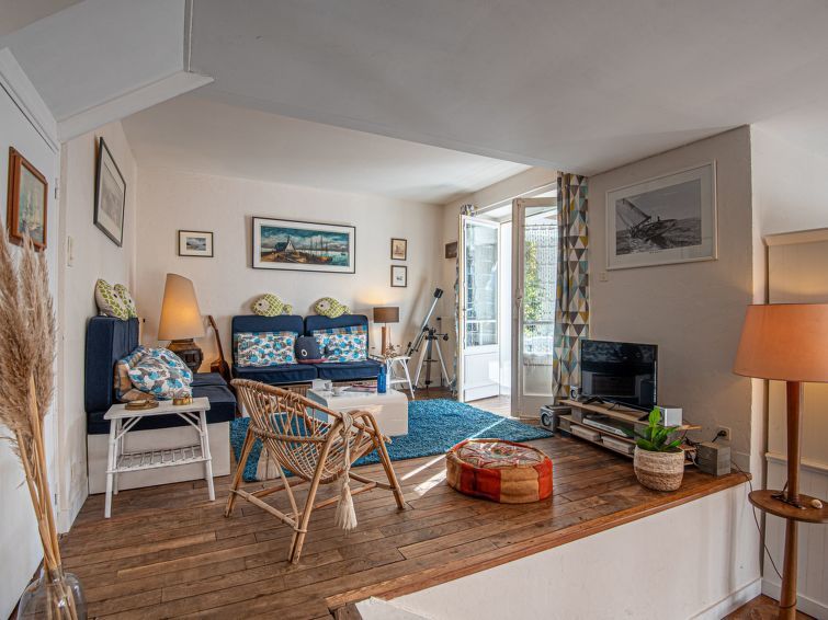 3-room house 60 m2 on 2 levels, on the upper ground floor. Beautiful furnishings: living/dining room, on 2 levels with TV (flat screen), DVD. Exit to the balcony. Small kitchen (oven, dishwasher, 4 ceramic glass hob hotplates, toaster, kettle, microwave, electric coffee machine). Exit to the garden.