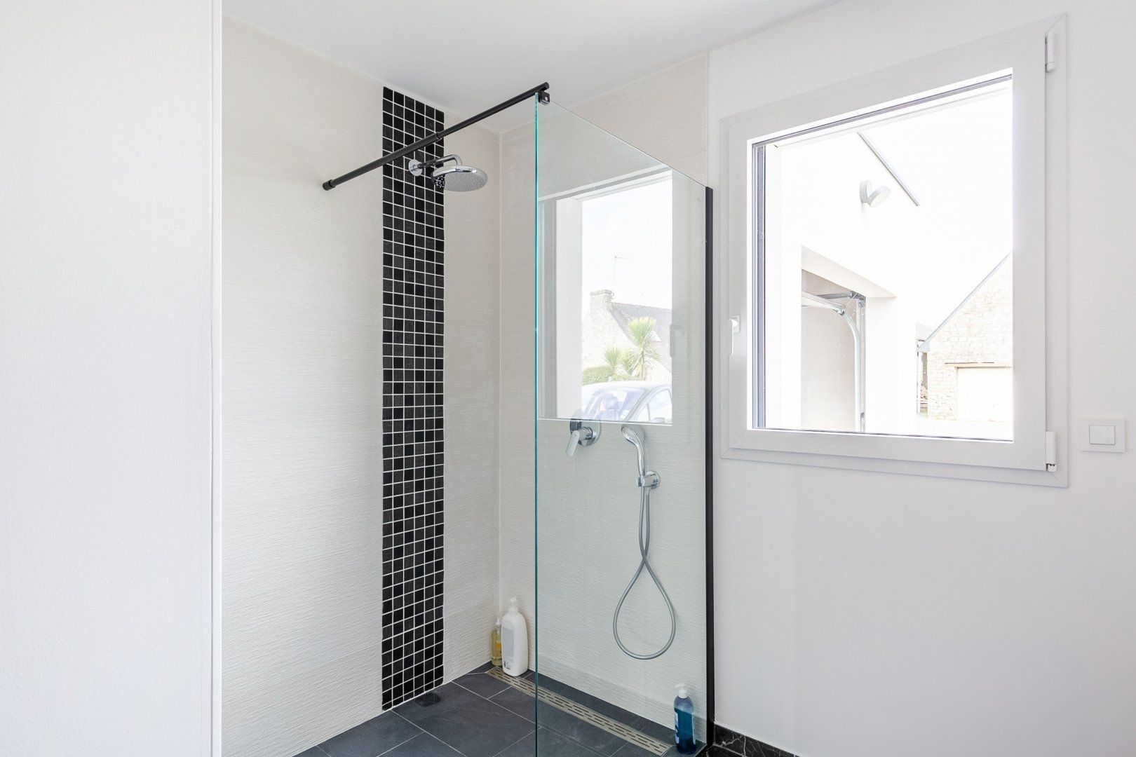 Walls of windows allow the light to fill the open living space – perfect for spending your mornings at the sleek dining table with a fresh spread of coffee and local jams. After you’ve read a few chapters of your holiday book on the plump leather sofa, head out for a walk along the GR34 path and discover the circuit around Roscouré wood.