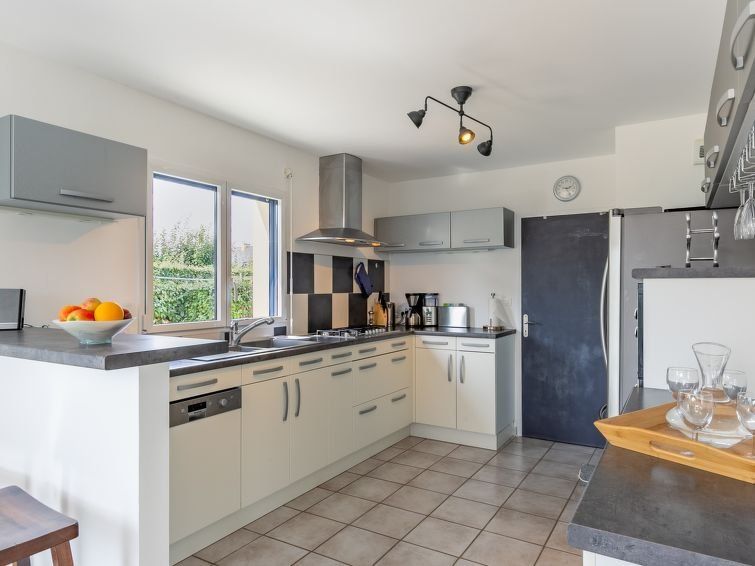 "Ker Simor Ty Mer", 5-room house 120 m2 on 2 levels. Bright, comfortable and tasteful furnishings: living/dining room with Scandinavian wood stove and dining table. Exit to the terrace. 1 room with 1 french bed (160 cm), shower. Open kitchen (oven, dishwasher, 5 gas rings, toaster, kettle, microwave, freezer, electric coffee machine).