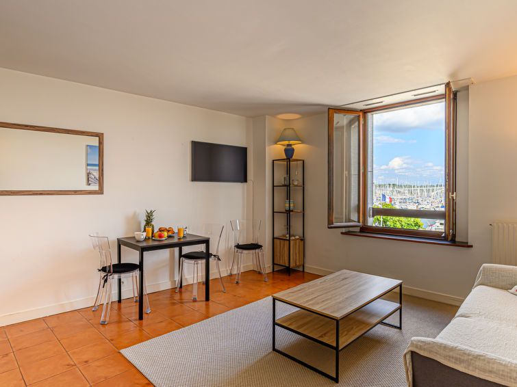 "Le Quai", 2-room apartment 37 m2 on 2nd floor. Fully, comfortable furnishings: living/dining room with 1 double sofabed (1 x 140 cm, length 190 cm). 1 room with 1 french bed (1 x 160 cm, length 200 cm). Kitchen (oven, dishwasher, 4 gas rings, toaster, kettle, electric coffee machine, Capsules for coffee machine (Nespresso) extra).