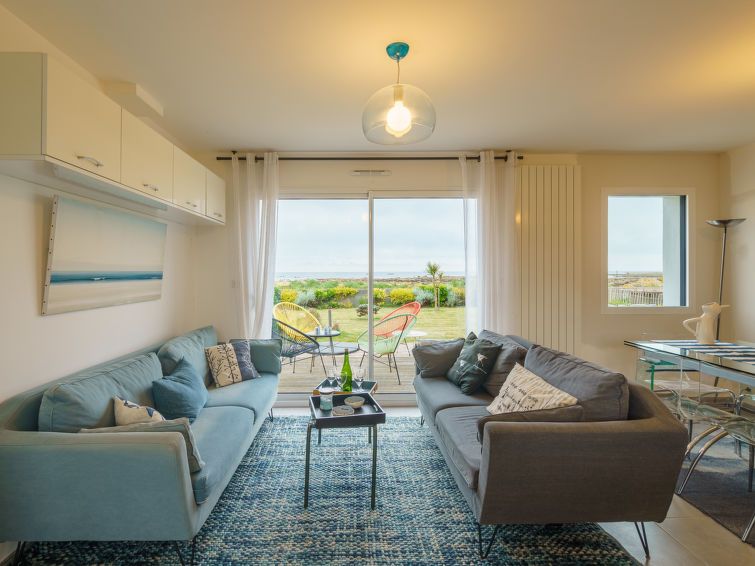 "Les pieds dans l'eau", 4-room house 90 m2 on 2 levels, south facing position. Comfortable and beautiful furnishings: living/dining room with dining nook. Exit to the terrace. 1 room with 1 french bed (180 cm, length 200 cm), shower. Open kitchen (oven, dishwasher, 4 ceramic glass hob hotplates, toaster, kettle, microwave, electric coffee machine).