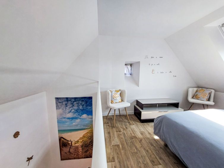 "La Trélennette", 2-room house 45 m2 on 2 levels, south facing position. Object suitable for 2 adults. Beautiful furnishings: living/dining room with dining nook and TV (flat screen), electric heater. Exit to the terrace. Kitchenette (2 induction hot plates, toaster, kettle, microwave, electric coffee machine).