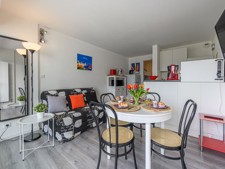 2-room apartment 30 m2 on 1st floor, south facing position. Beautiful furnishings: living room with dining table and TV (flat screen). Exit to the balcony, south facing position. 1 room with 1 french bed (1 x 140 cm, length 190 cm). Entrance hall with 1 x 2 bunk beds (80 cm, length 190 cm).