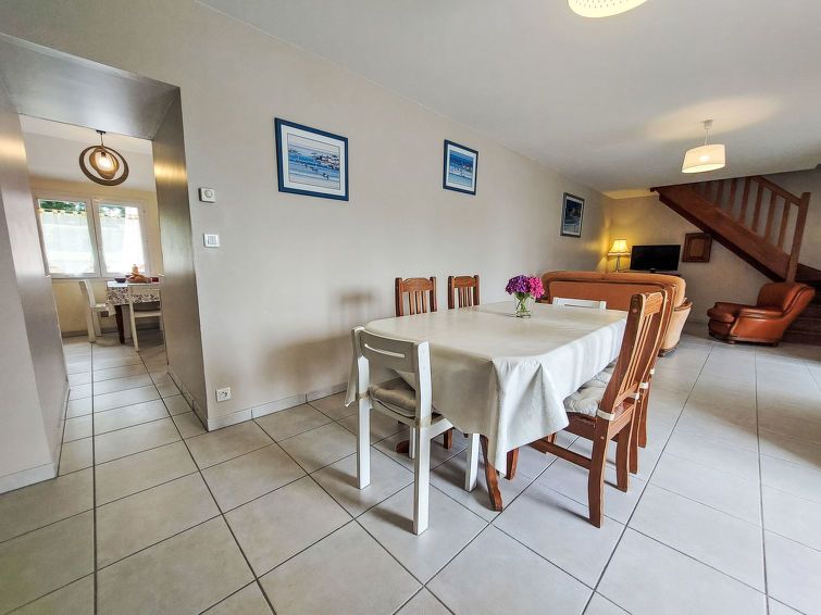 "Le Brieux", 4-room house 98 m2 on 2 levels. Cosy furnishings: living/dining room with open-hearth fireplace (only for decoration), dining table and TV (flat screen). 1 room with 1 french bed (140 cm, length 190 cm). Kitchen (1 hot plate, oven, dishwasher, 3 gas rings, toaster, kettle, microwave, freezer, electric coffee machine).