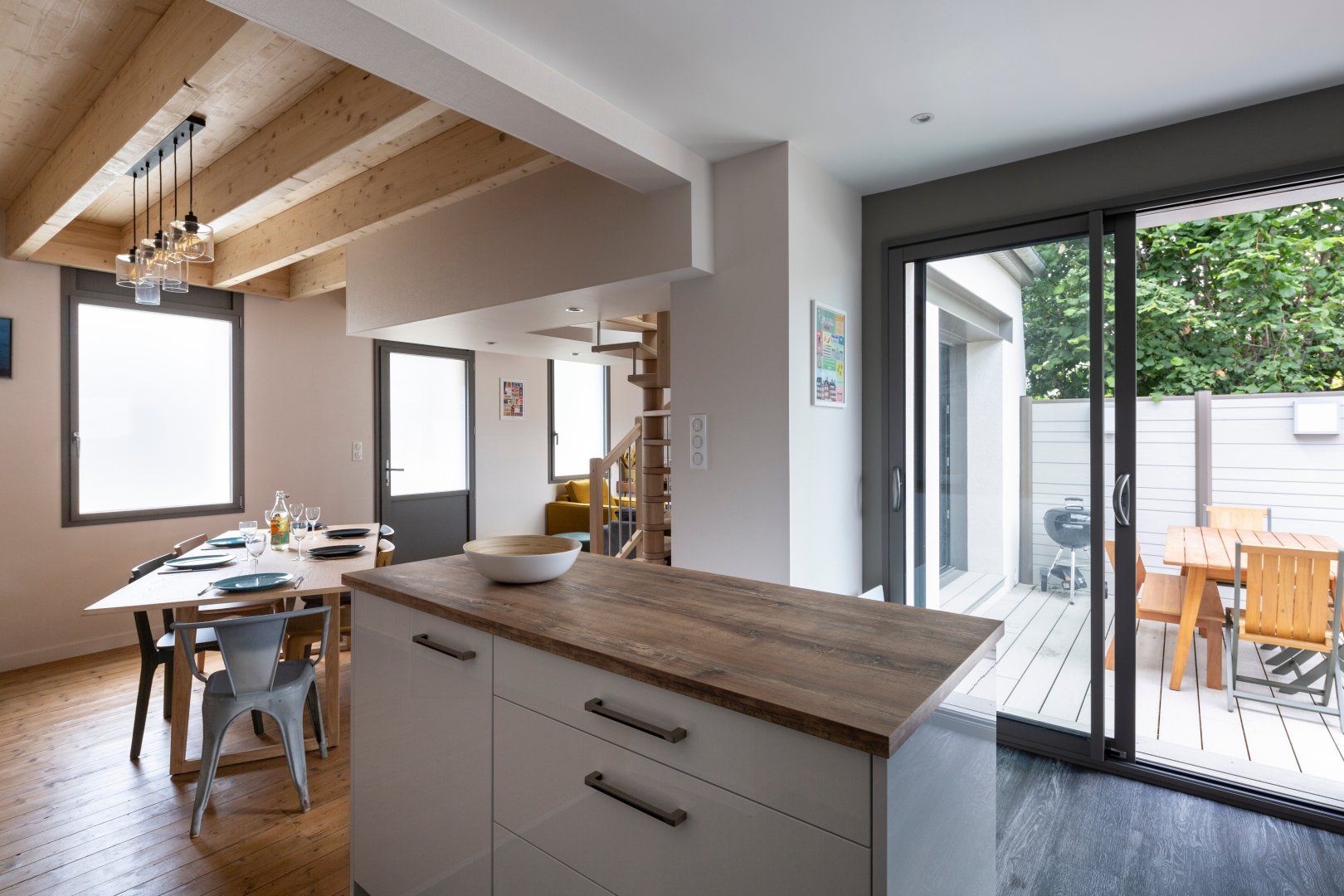 We love the light-filled interior, with a stylish living room where you can kick back and relax with a good movie in the company of your loved ones. The place is filled with warmth, thanks to the wooden floors and ceiling, plush furnishings and elegant details. The sleek modern kitchen will inspire you to create delicious feasts with the fresh produce you can pick up at the famous Place des Lices – share your meals at the large dining table or enjoy an alfresco dinner out on the terrace.