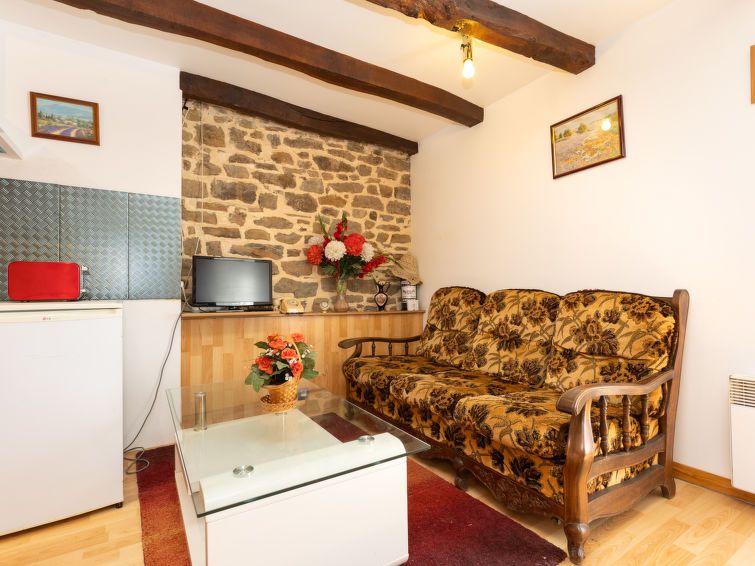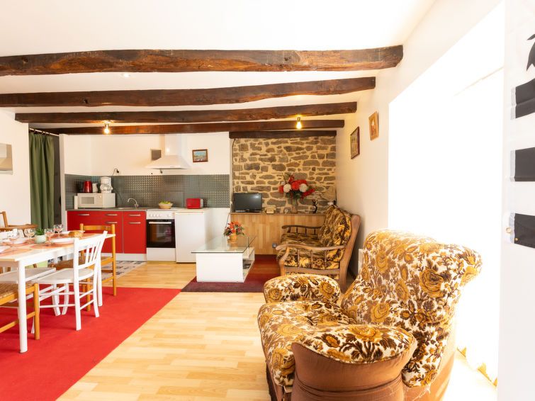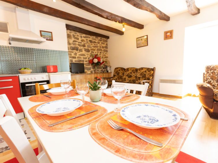 3-room apartment 55 m2 on 1st floor. Practical and rustic furnishings: living/dining room with TV (flat screen). 1 room with 1 french bed (1 x 140 cm, length 190 cm). 1 room with 2 beds (90 cm, length 190 cm). Open kitchen (oven, 4 gas rings, toaster, kettle, microwave, electric coffee machine).