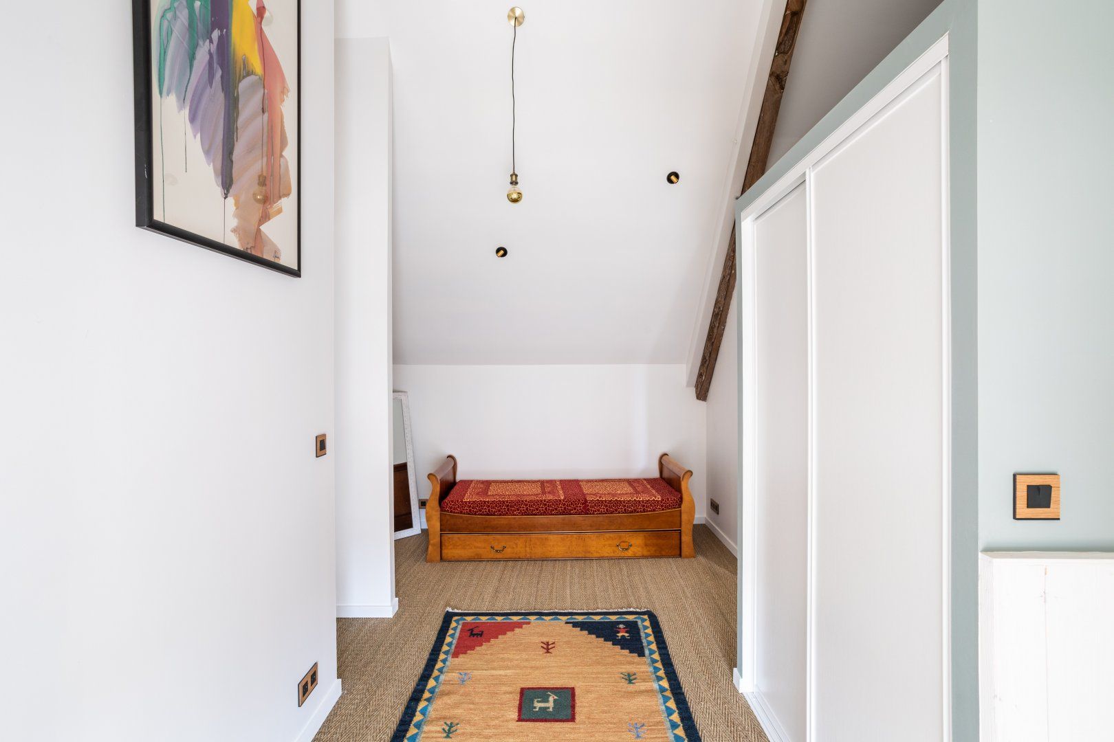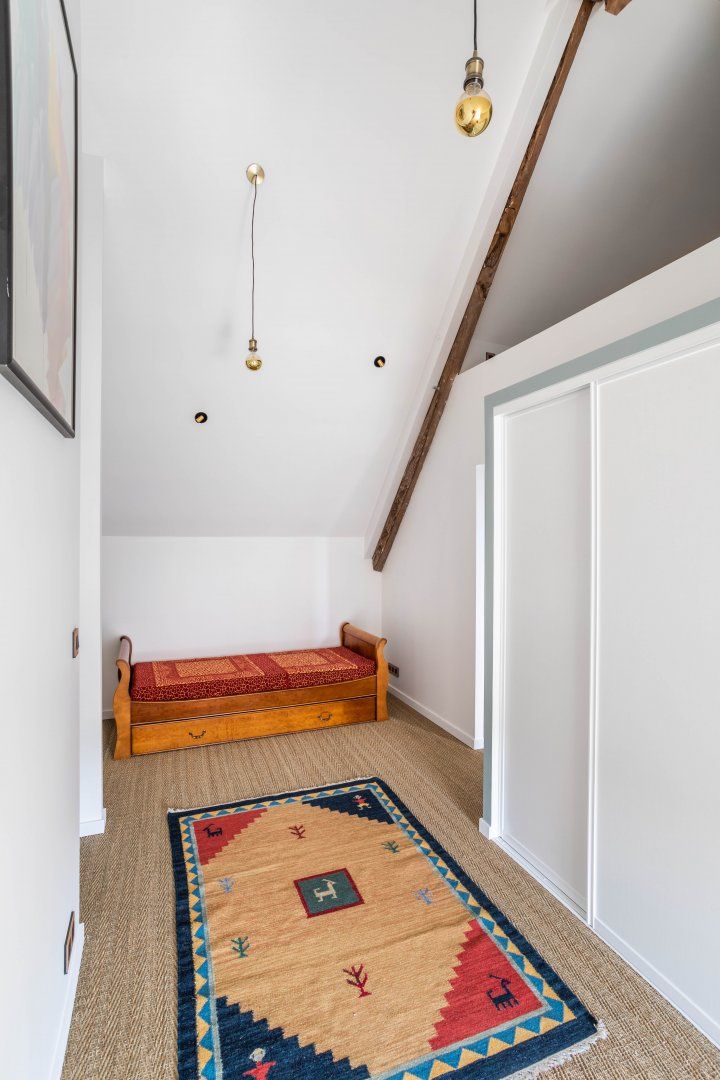 Make your way upstairs and you will find two beautifully decorated bedrooms, each of which is filled with light and a feeling of height, thanks to its sloping loft ceilings that reach up into the eaves of the old building. Old stonework contrasts with cool contemporary wallpaper in the master bedroom, continuing the theme of ‘old-meets-new’ which makes the home so captivating, and an elegant standalone bathtub provides an extra unique touch. Imagine soaking in the bath in the comfort of your bedroom, looking out of the opposite window as dusk falls, before heading back downstairs and out onto the terrace for a glass of wine or an alfresco barbecue as evening turns to night.