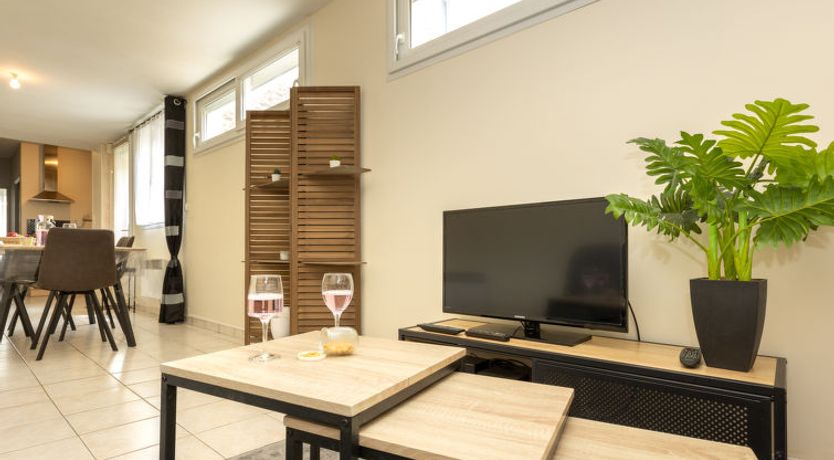 "Ange", 2-room apartment 43 m2, on the ground floor. Comfortable and tasteful furnishings: living/dining room with TV (flat screen). 1 room with 1 french bed (1 x 140 cm, length 190 cm). Open kitchen (oven, 3 induction hot plates, toaster, kettle, microwave, freezer, electric coffee machine).