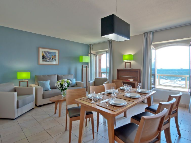 "Reine Marine -T3 Face Mer", 3-room apartment 54 m2. Comfortable and beautiful furnishings: living/sleeping room with 1 double sofabed (140 cm, length 200 cm), dining table and satellite TV. 2 rooms, each room with 2 beds (90 cm, length 200 cm). Kitchenette (oven, dishwasher, 4 ceramic glass hob hotplates, toaster, kettle, microwave, electric coffee machine).