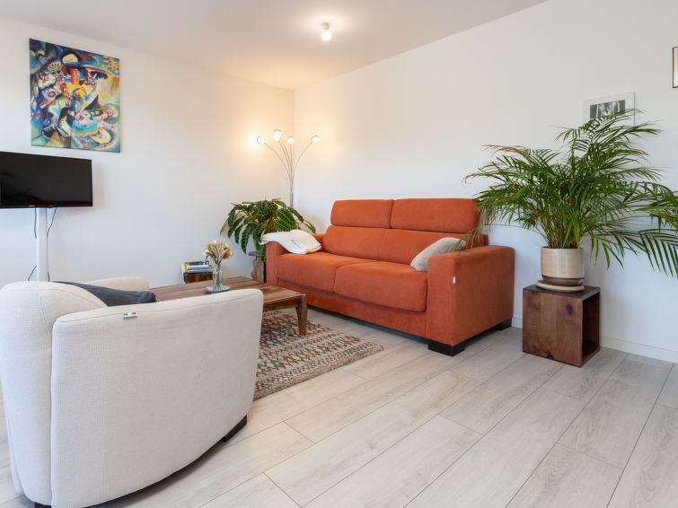 2-room apartment 45 m2 on 2nd floor. Beautiful and tasteful furnishings: large living/dining room with 1 sofabed (140 cm, length 190 cm), TV (flat screen), electric shutters. Exit to the terrace. 1 large room 13 m2 with 1 french bed (1 x 160 cm, length 200 cm). Open kitchen (oven, dishwasher, 3 induction hot plates, toaster, kettle, microwave, freezer, electric coffee machine, Capsules for coffee machine (Nespresso) extra).