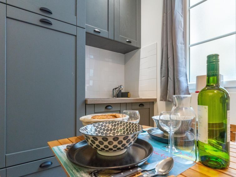 "Le studio St Vincent", 1-room studio 25 m2 on 2nd floor. Fully renovated in 2020, beautiful and tasteful furnishings: living/sleeping room with 1 french bed (1 x 140 cm, length 190 cm). Small, open kitchen (2 induction hot plates, toaster, kettle, freezer, combination microwave) with dining table.