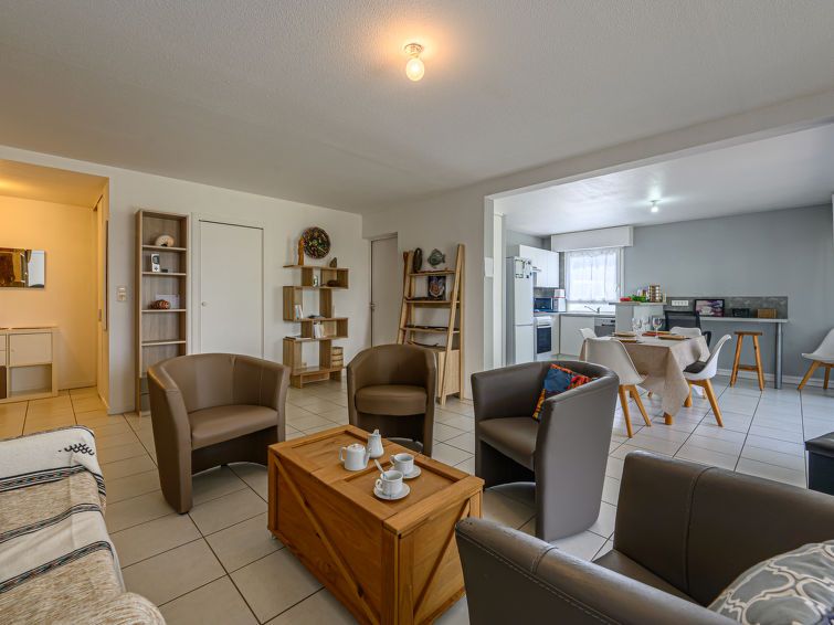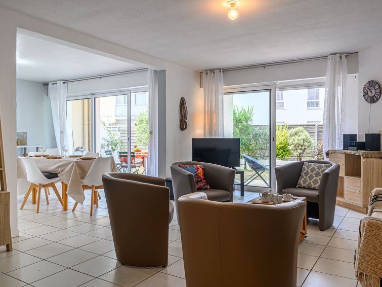 3-room apartment 60 m2, on the ground floor. Comfortable furnishings: living/dining room with TV (flat screen). Exit to the terrace. 1 room with 1 french bed (1 x 140 cm, length 190 cm), shower. 1 room with 1 sofabed (140 cm, length 190 cm), shower. Kitchen (oven, dishwasher, 4 gas rings, toaster, kettle, microwave, electric coffee machine).