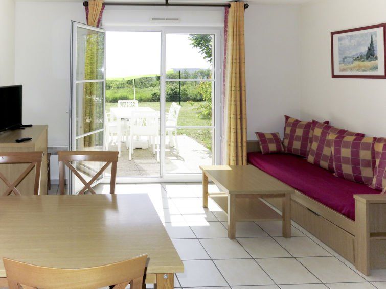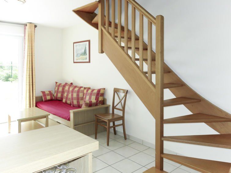 "Les Jardins Renaissance", 3-room house 45 m2 on 2 levels. Practical and cosy furnishings: living/sleeping room with 1 sofabed, 1 pull-out bed, dining table and TV. Kitchenette (dishwasher, 2 ceramic glass hob hotplates, toaster, kettle, microwave, electric coffee machine). Sep. WC.