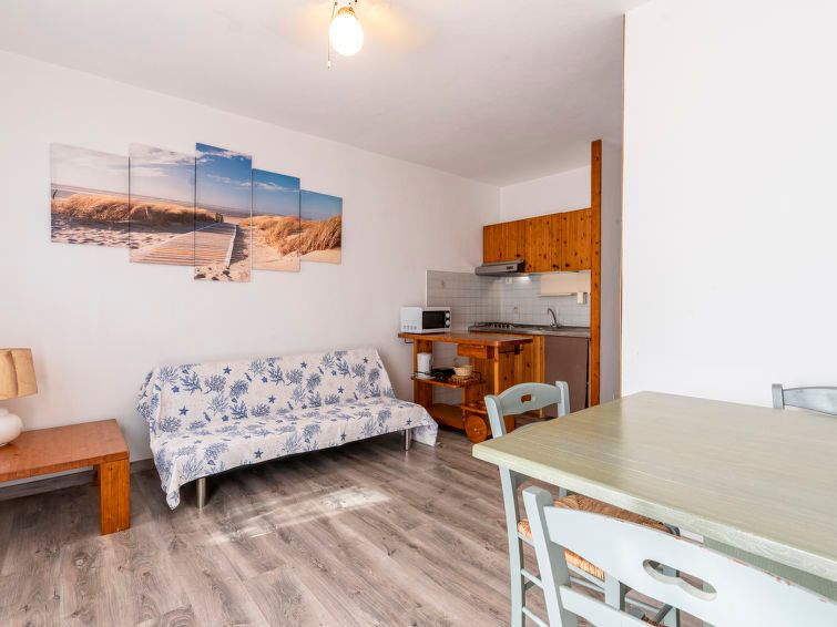 "Villa 12", 3-room terraced house 60 m2. Practical and beautiful furnishings: living/dining room with 1 sofabed (90 cm, length 190 cm), dining table. Exit to the terrace. 1 room with 1 french bed (160 cm, length 190 cm). 1 room with 1 x 2 bunk beds (90 cm, length 190 cm). Open kitchen (4 gas rings, toaster, kettle, microwave).