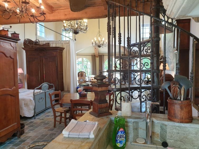 "Maison studio 80m²", 1-room house 80 m2 on 2 levels. Bright, comfortable and tasteful furnishings: living/dining room with dining table and TV can be hired. Exit to the terrace. Kitchenette (2 hot plates, dishwasher, toaster, kettle, microwave, electric coffee machine). 2 showers/WC.