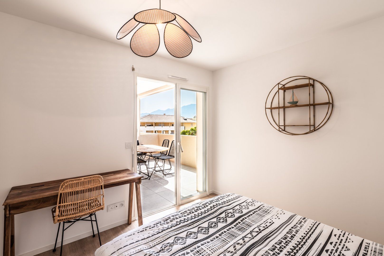 We love the seaside style of this home, bringing the beauty of Calvi's pristine coastline indoors. It's the ultimate holiday home, packed with cheer and joy that'll brighten your days to no end. The sunny, south-facing terrace is the cherry on top, continuing the contemporary, boho design. We do love the interior, but we can imagine lots of morning coffees, lunches, dinners, and evening drinks will go on around this outdoor table. And with a mountainous view like that, who can blame you?