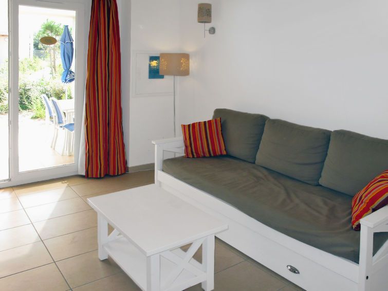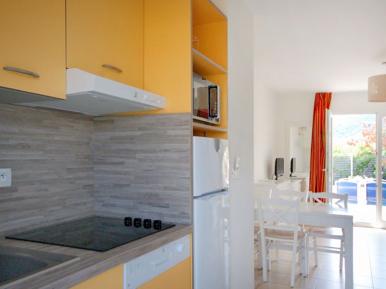 "Odalys Référence Les Villas Bel Godère", 2-room terraced house 33 m2 on 2 levels. Bright, modern furnishings: living/sleeping room with 1 double sofabed, dining table and TV can be hired. Exit to the terrace. 1 room with 1 french bed. Small, open kitchen (dishwasher, 2 ceramic glass hob hotplates, microwave, electric coffee machine).