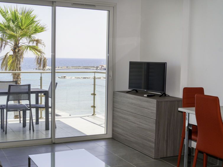 "T2 vue cap", 2-room apartment 40 to 44 m2. Comfortable furnishings: living/dining room with 1 double sofabed (140 cm, length 190 cm), TV (flat screen), air conditioning. Exit to the terrace. 1 room with 1 french bed (140 cm, length 190 cm). Kitchenette (oven, 2 induction hot plates, kettle, microwave, electric coffee machine).
