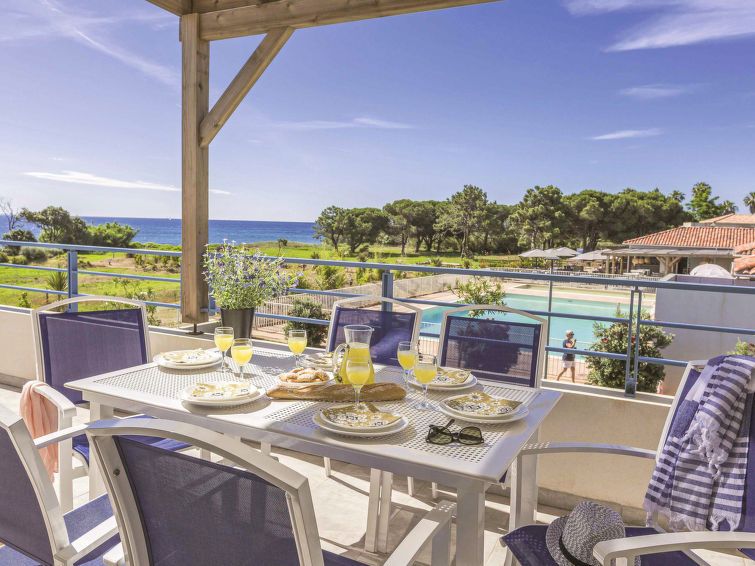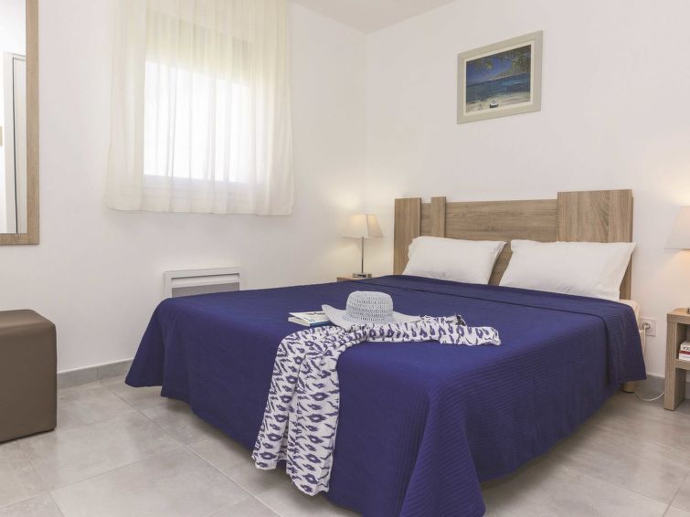 "Résidence Odalys Référence Acqua Bella", 2-room apartment 31 to 34 m2. Bright, modern furnishings: living/sleeping room with 1 pull-out bed (2 pers.), dining table, TV can be hired and air conditioning. Exit to the terrace. Open gallery with 1 double bed. Kitchenette (dishwasher, 2 ceramic glass hob hotplates, microwave, freezer, electric coffee machine).