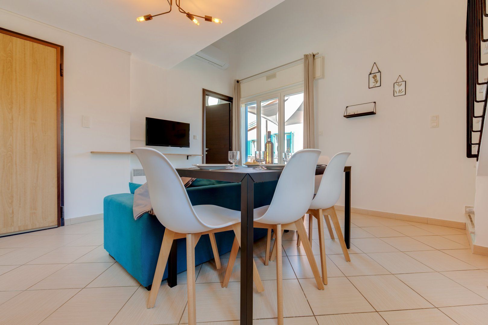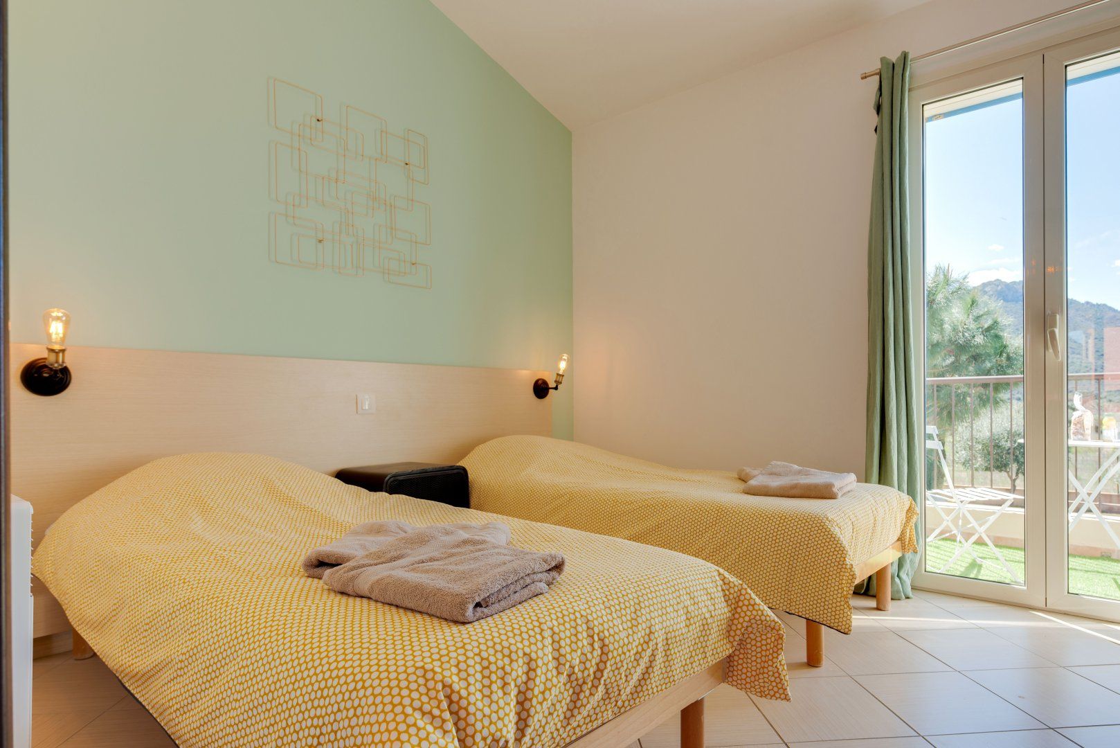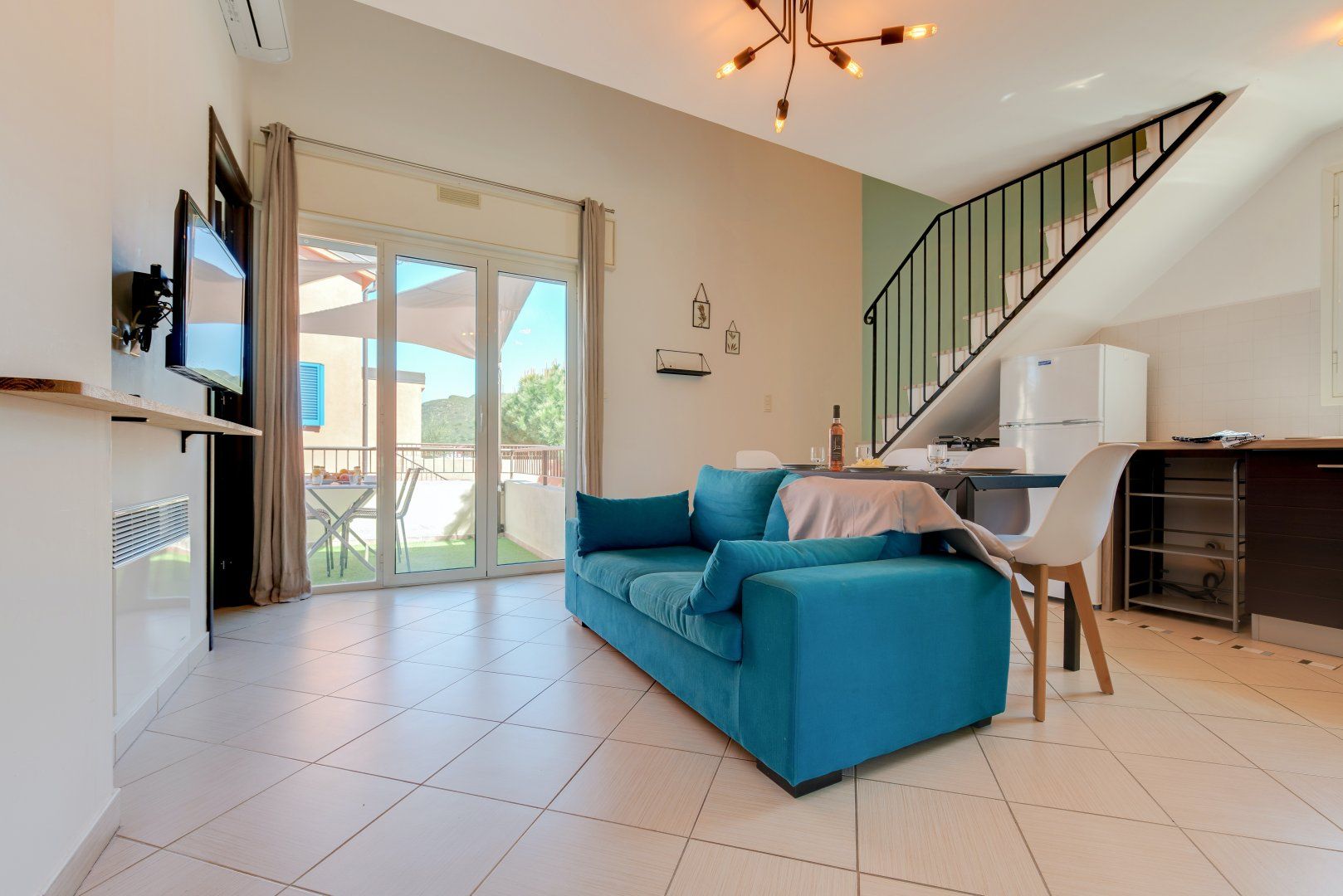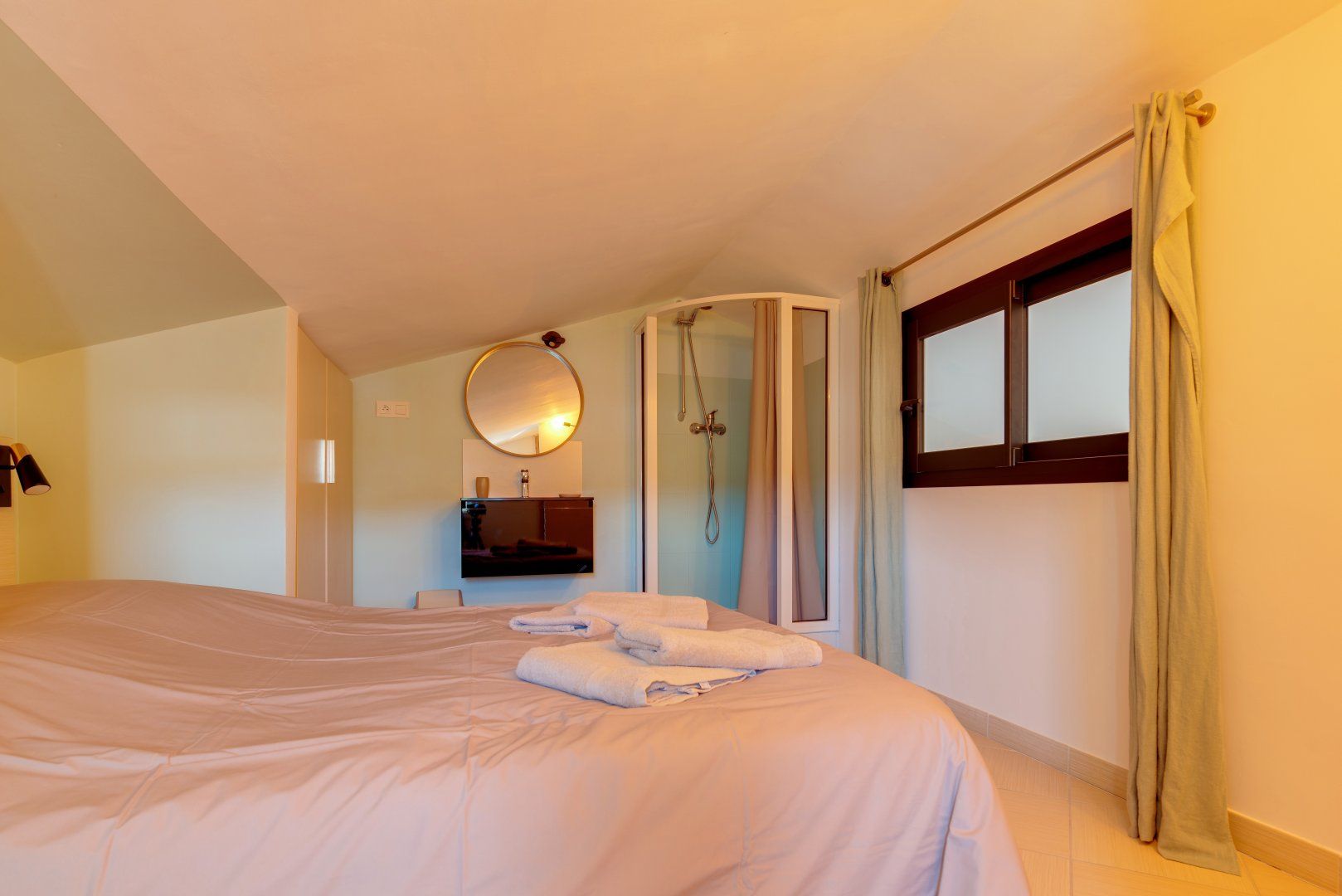 Its central living room and kitchen acts as the hub of the home, with the twin bedroom and main bathroom leading off it. Large bifold doors open out onto a balcony shaded by canvas sails to keep you from getting scorched beneath cloudless Corsican skies. Meanwhile, there's a double bedroom upstairs, complete with its own shower and basin.
