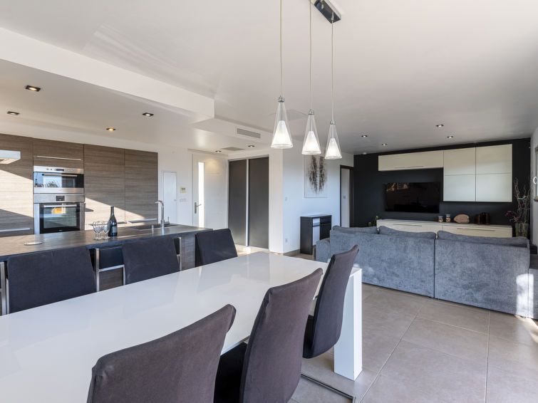 "Casa Caminu", 4-room semi-detached house 90 m2 on 2 levels. Modern furnishings: living/dining room with panoramic window with dining table, separate WC and TV (flat screen), electric shutters. Exit to the terrace. Open kitchen (3 hot plates, oven, dishwasher, toaster, kettle, microwave, freezer, electric coffee machine, Capsules for coffee machine (Tassimo) extra).