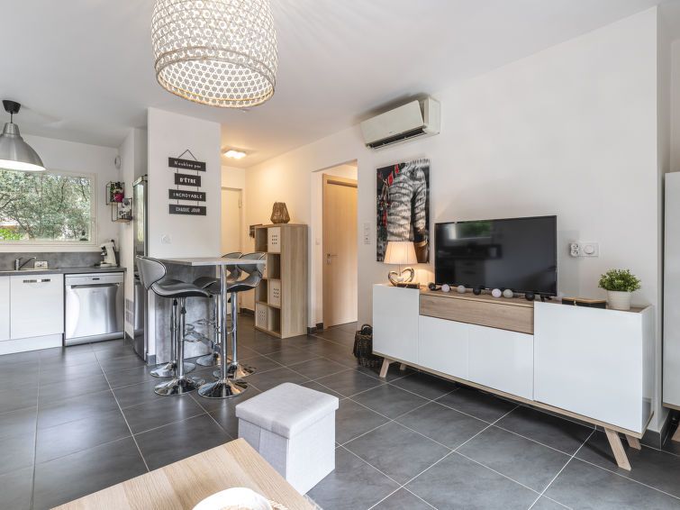 "Clos Vignola", 2-room apartment 49 m2, on the ground floor. Living/dining room with panoramic window with 1 double sofabed, dining table and TV (flat screen). Exit to the terrace. 1 room with 1 french bed (160 cm, length 200 cm). Kitchenette (oven, dishwasher, 4 ceramic glass hob hotplates, toaster, kettle, microwave, freezer, electric coffee machine, Capsules for coffee machine (Senseo) extra).