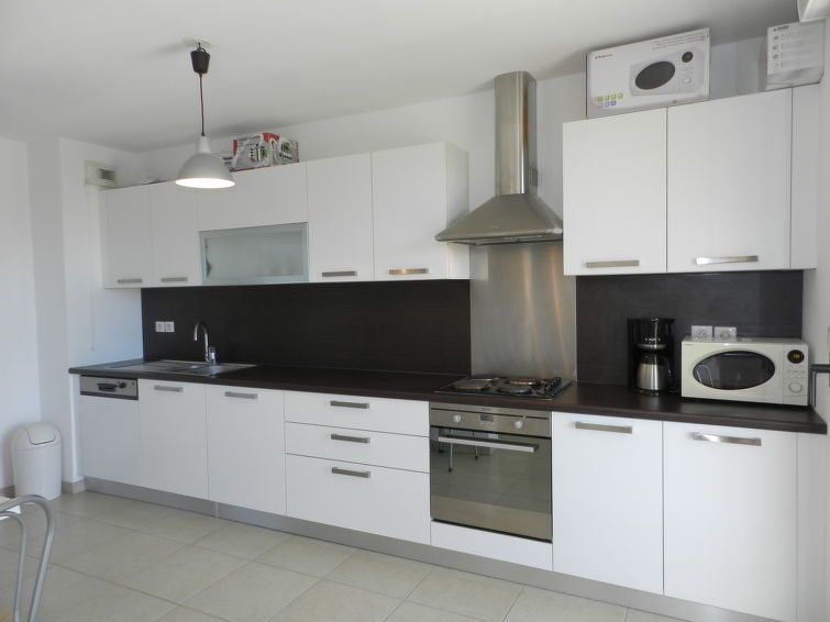 4-room apartment 84 m2 on 1st floor. Spacious and bright, modern furnishings: living/dining room with TV, flat screen, DVD and air conditioning. Exit to the balcony. 2 rooms, each room with 1 french bed (1 x 140 cm, length 190 cm). 1 room with 2 beds (90 cm, length 190 cm). Open kitchen (2 hot plates, oven, dishwasher, microwave, freezer, electric coffee machine).