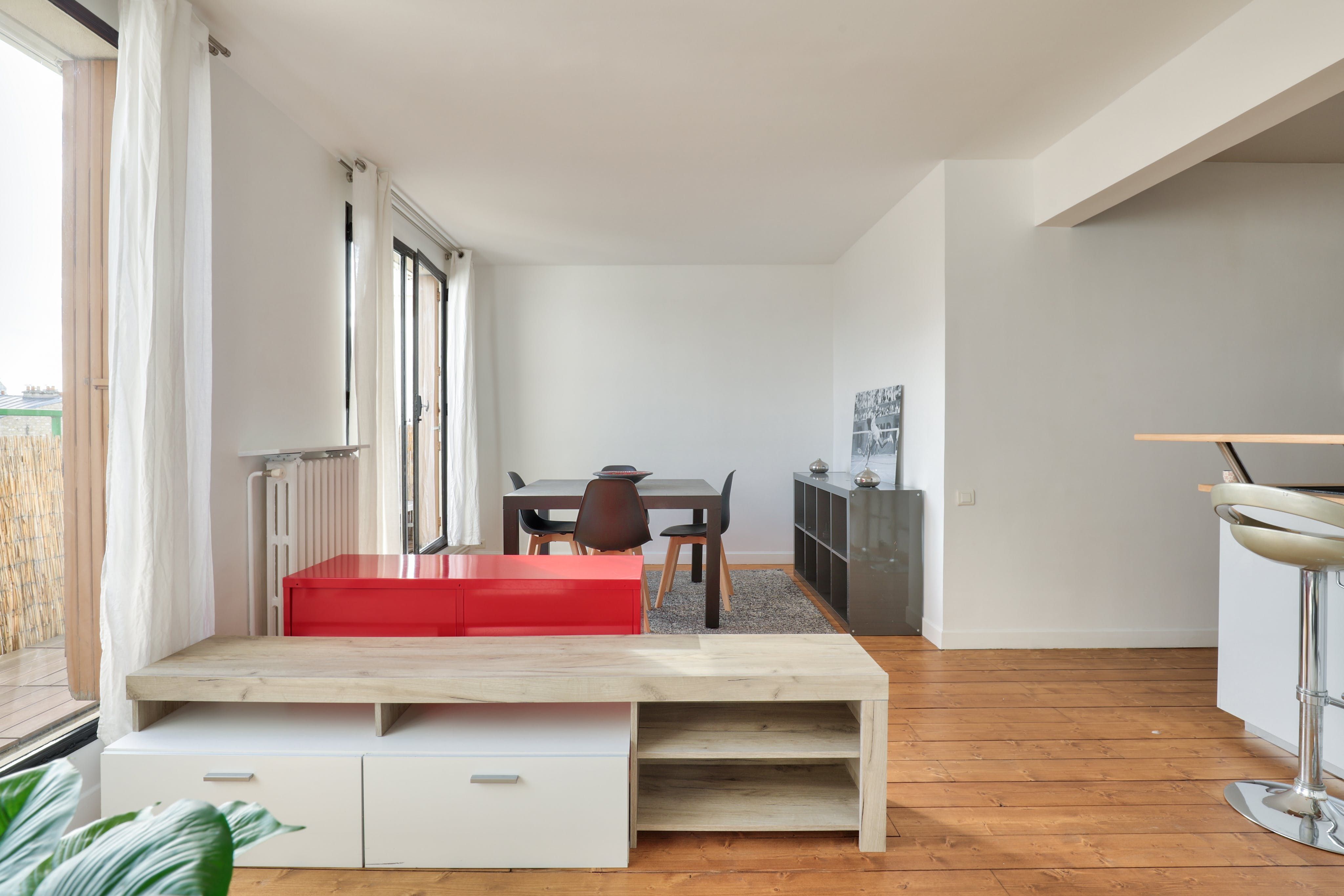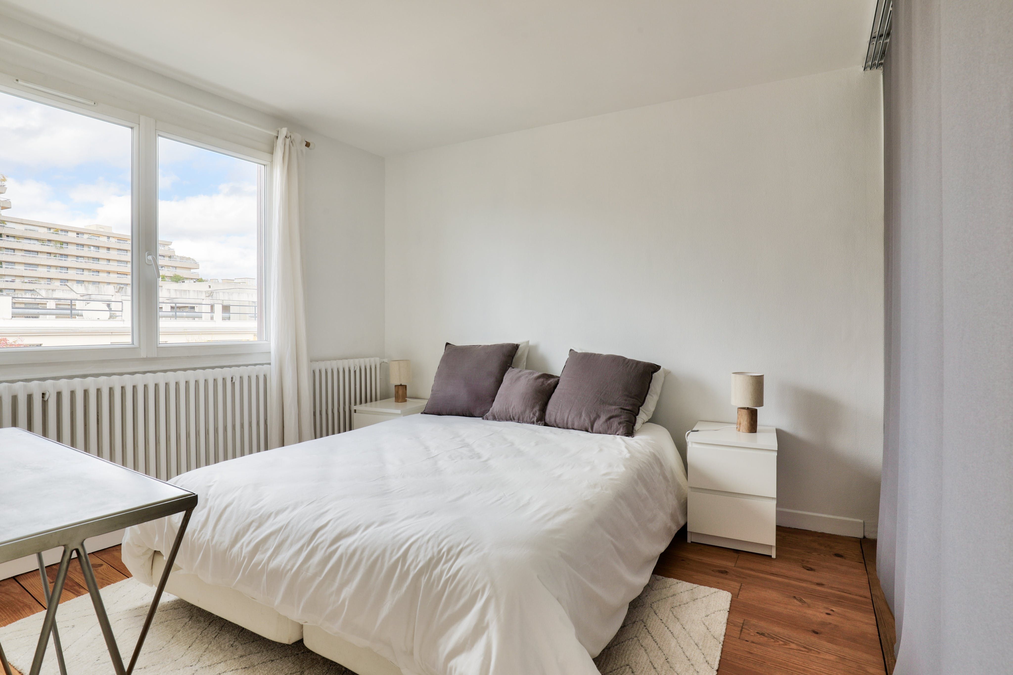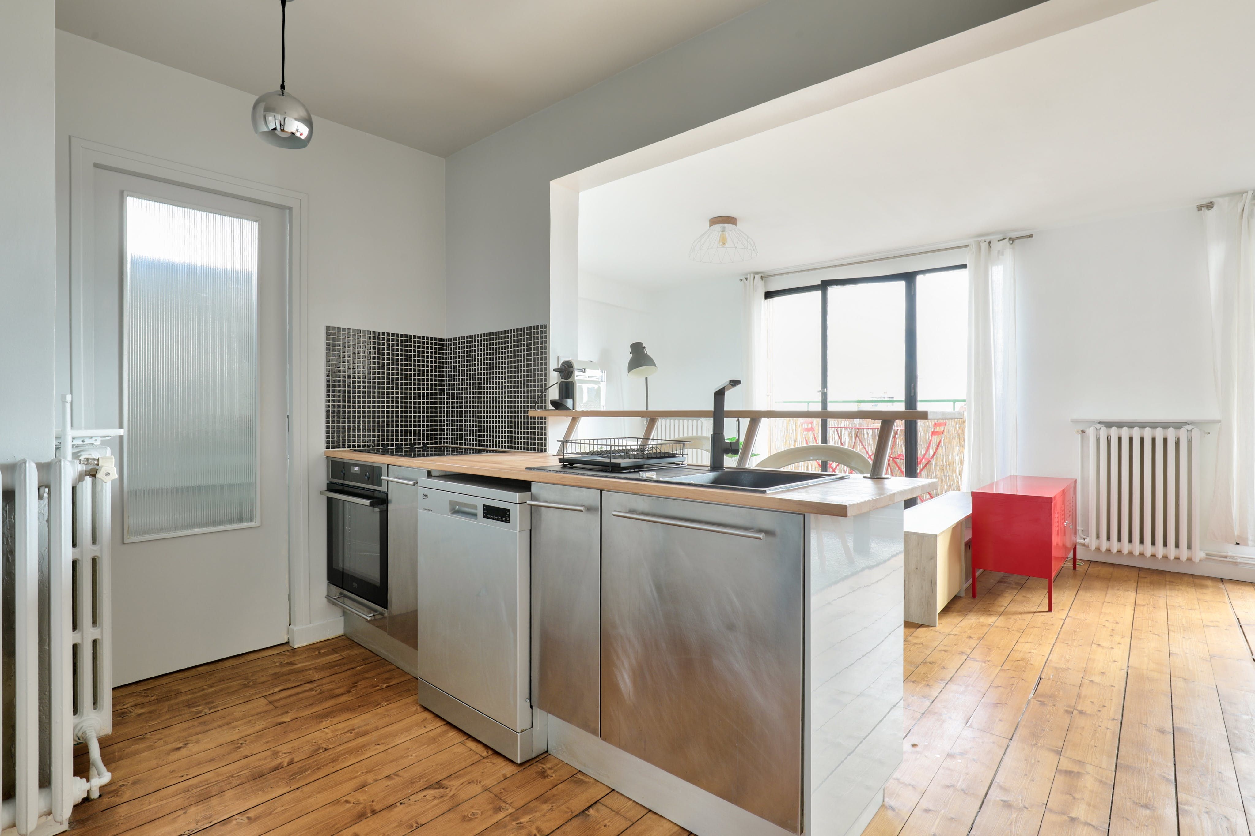 Located in Boulogne-Billancourt, this apartment is within walking distance of an array of eateries, shops and public transport. Marcel Sambat station on the Paris Métro Line 9 is around a five-minute walk, while the Eiffel Tower is a fifteen-minute drive and Chateau de Versailles is about twenty minutes in the car. Back at this modern apartment, French doors open up onto a narrow balcony with a table, chairs and sun loungers – the ideal spot for a glass of wine. Just one thing to note – there's a step up to the bath, so this place may not be suitable for those with mobility issues.
