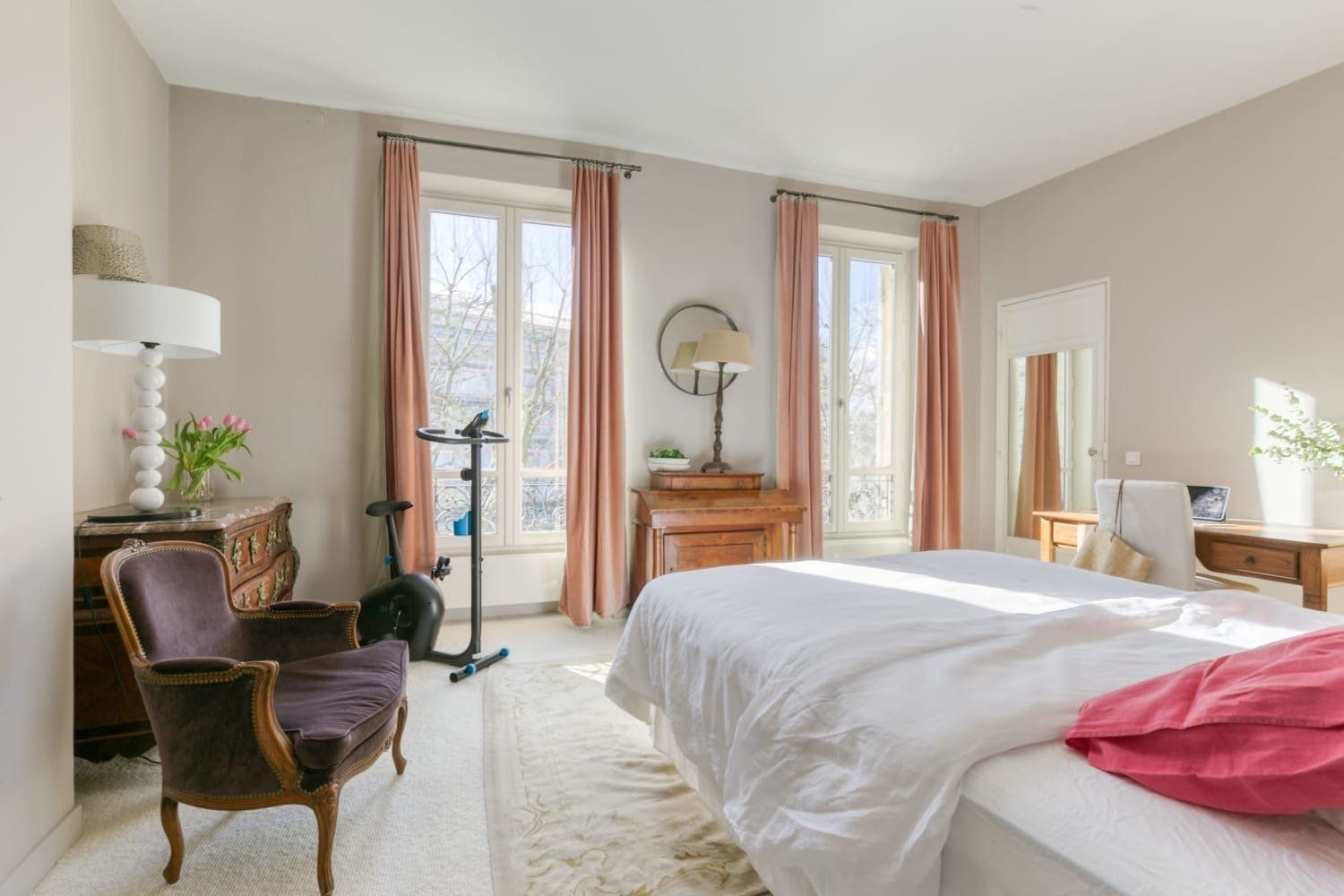 The three bedrooms boast equally beautiful French windows – particularly the main bedroom – and two of them provide desk spaces as well should you need to catch up on work.