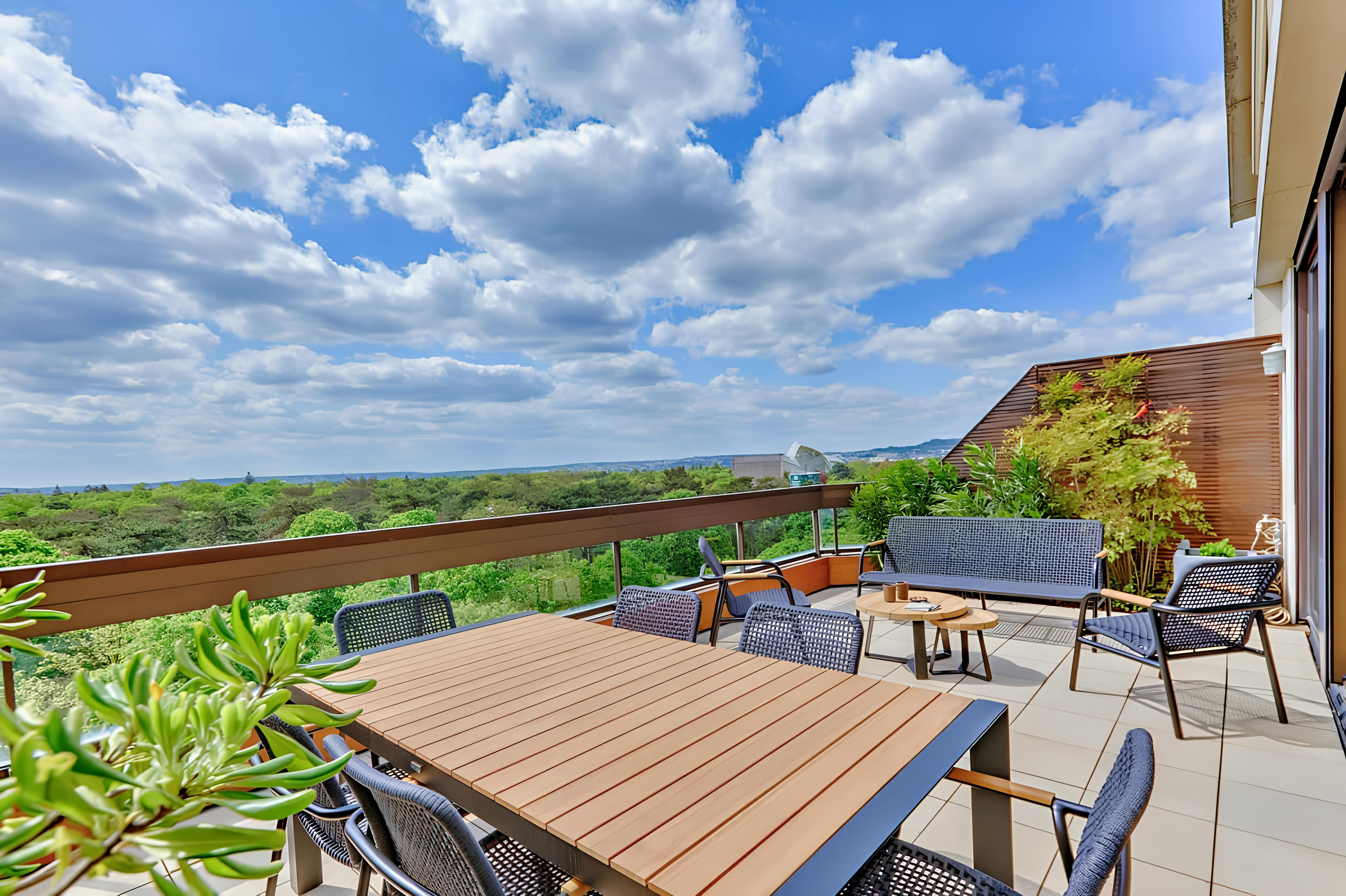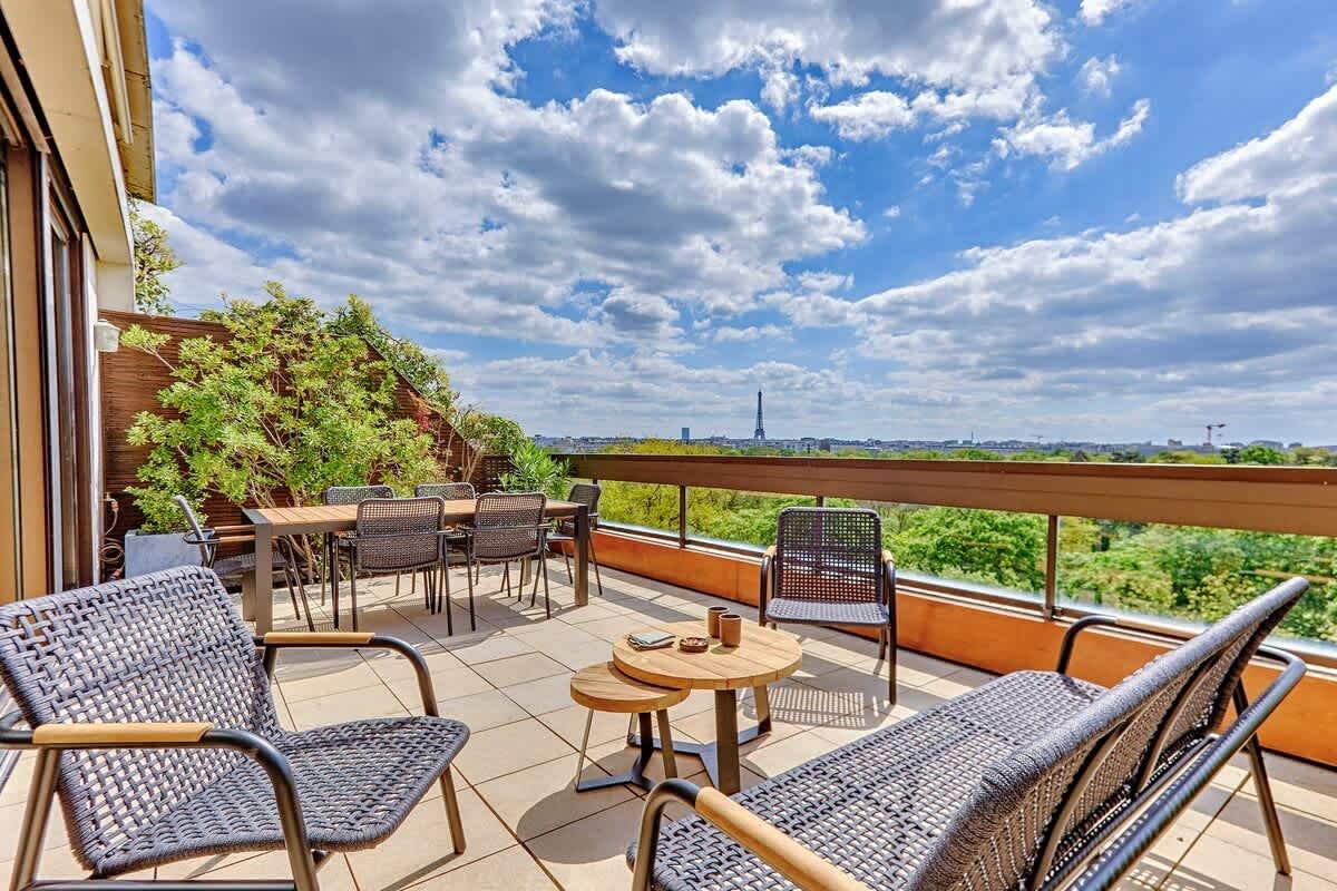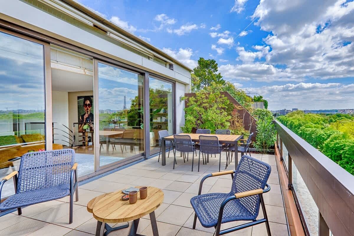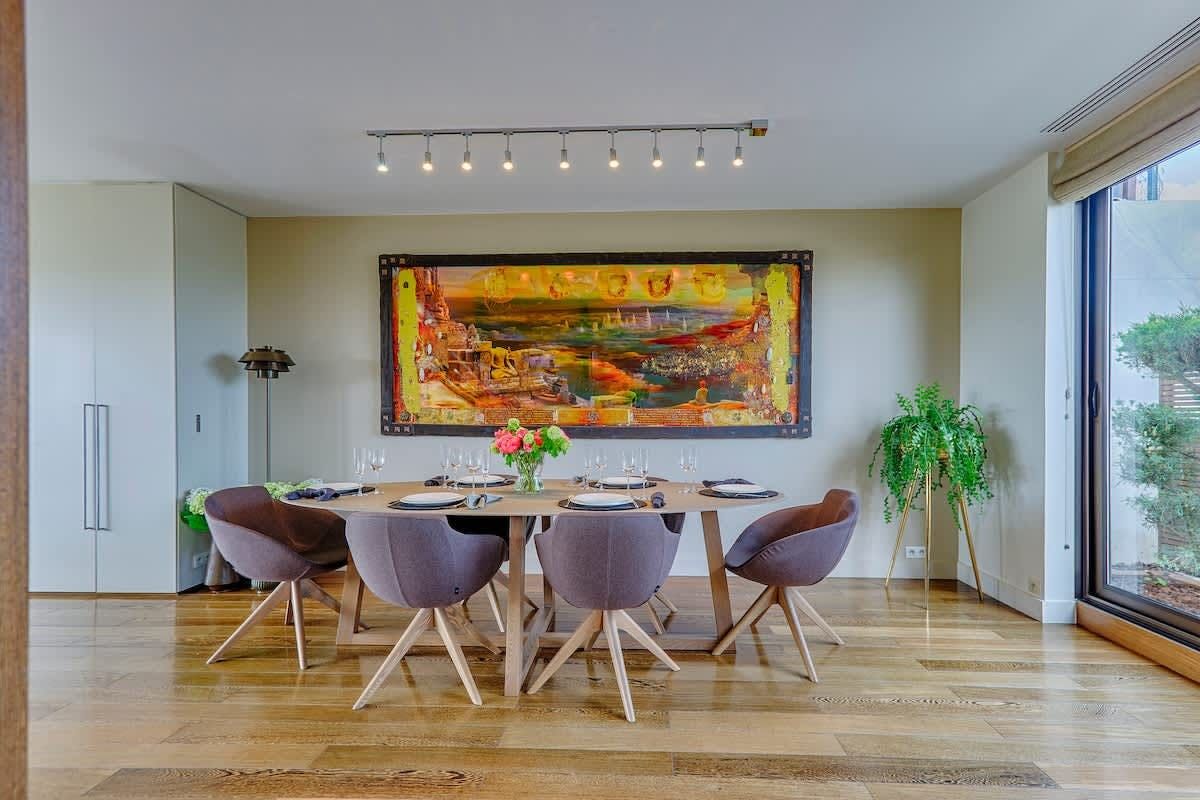 Looking for a quieter base just outside of Paris? Step forward this roomy two-storey apartment located in the upmarket neighbourhood of Neuilly-sur-Seine. With elegant cafés, bistros and the leafy Bois de Boulogne on your doorstep, it's easy to see why affluent Parisians lay down roots here. Excellent Metro and bus links make reaching central Paris simple. But you can just as easily admire the Eiffel Tower from your private terrace – the views are outstanding whatever the time of day. Inside, the layout suits two couples or friends, with two equally sized en-suite bedrooms on the lower level. While upstairs is all about socialising in the free-flowing living and dining setup.