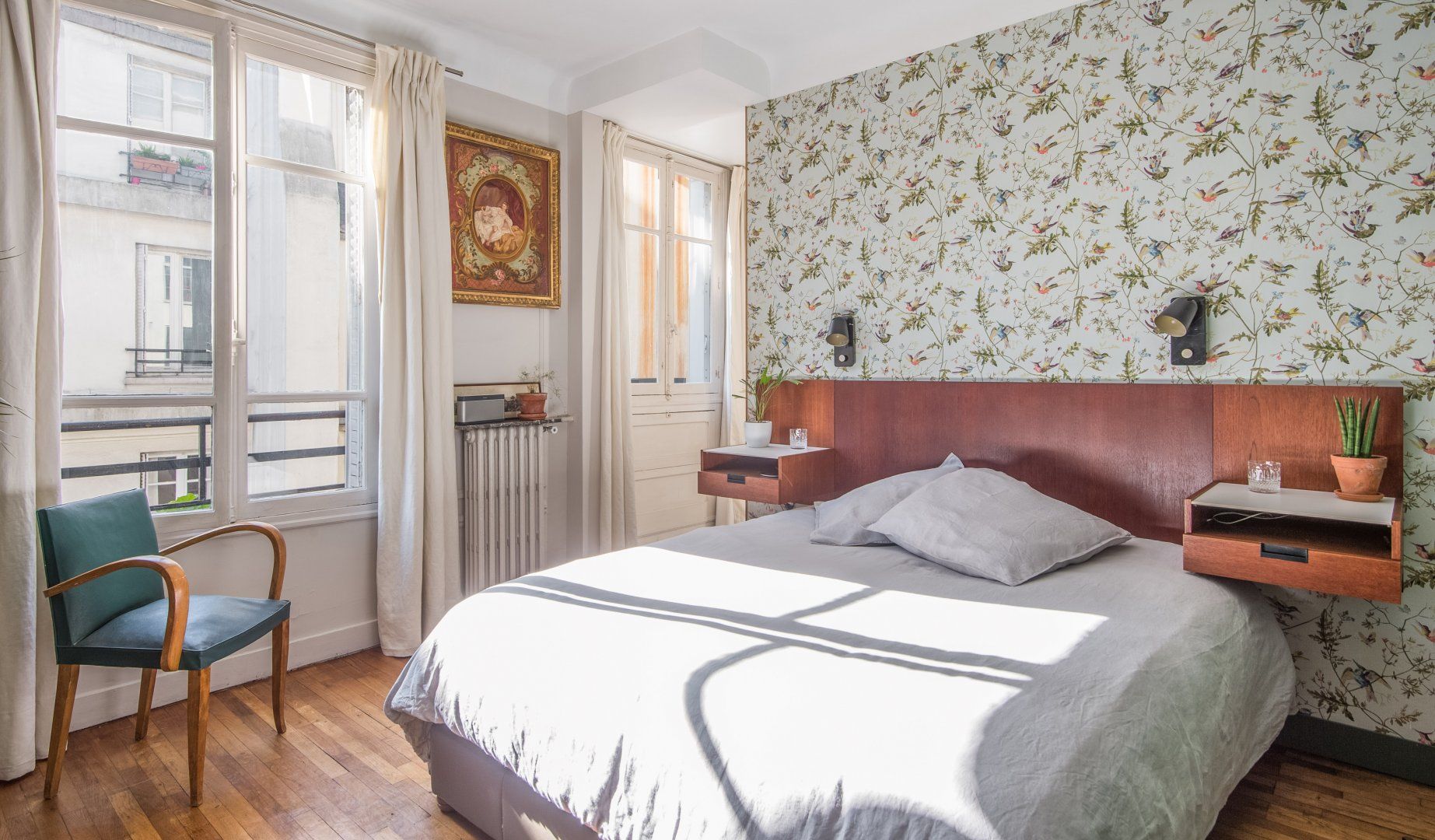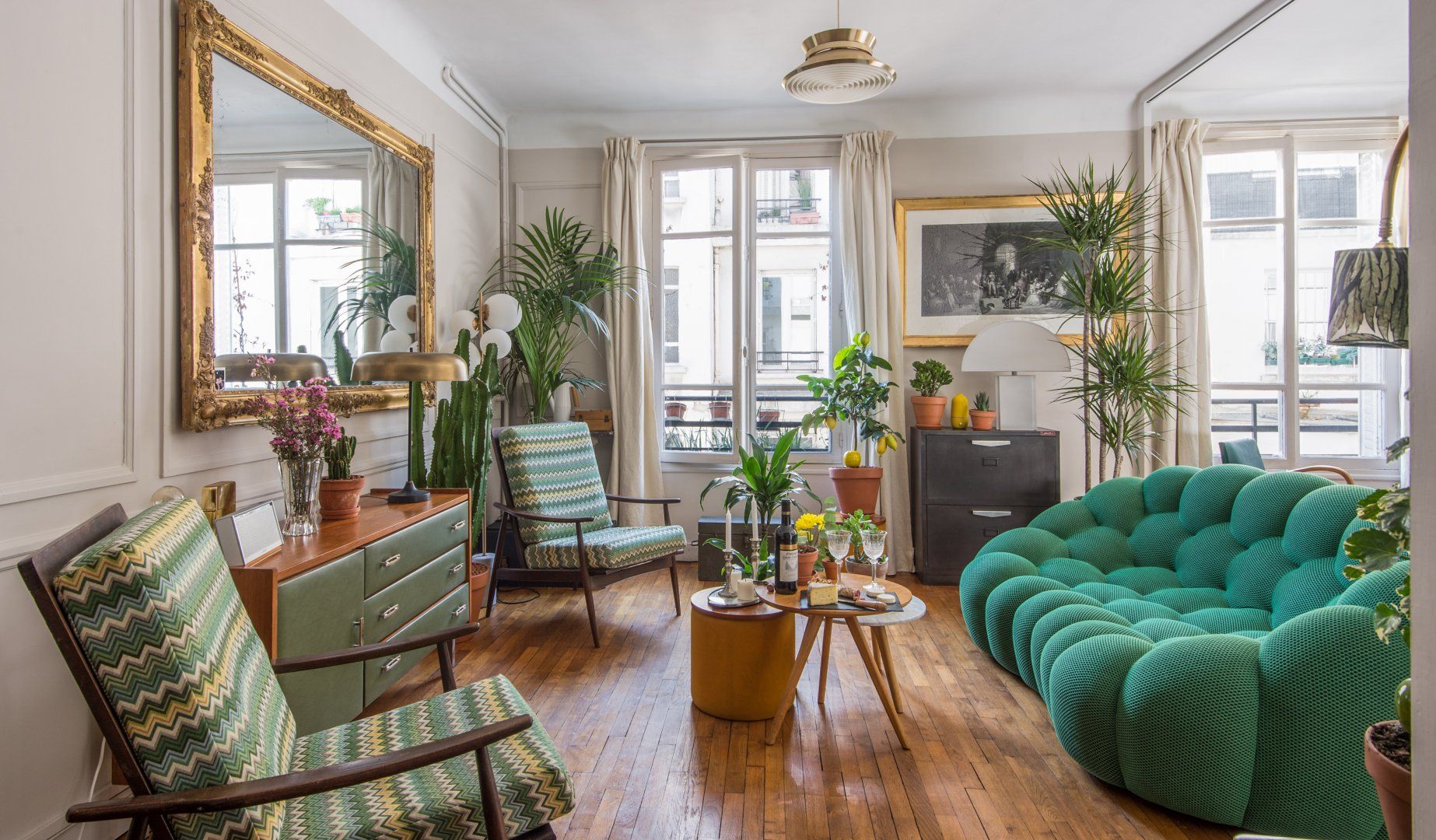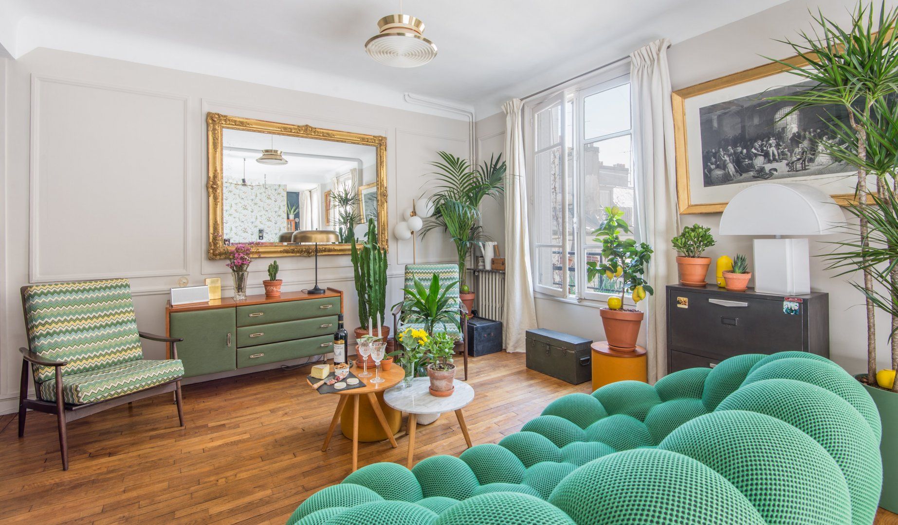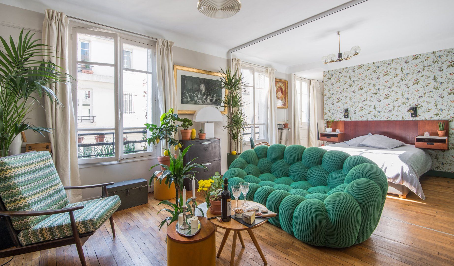 A cool trendy home with a mix of vintage and modern pieces that make a country house in the big city! There's so much to love - the floral wallpaper in the bedroom, the grey cloud wallpaper in the kitchen and that green sofa, a statement design piece if ever we saw one. There isn't a television in this abode, but this only adds to the authentic way back in time experience. Set in the lively district of Grands Boulevards, this is the perfect country retreat, an antidote to the buzzy city of lights.