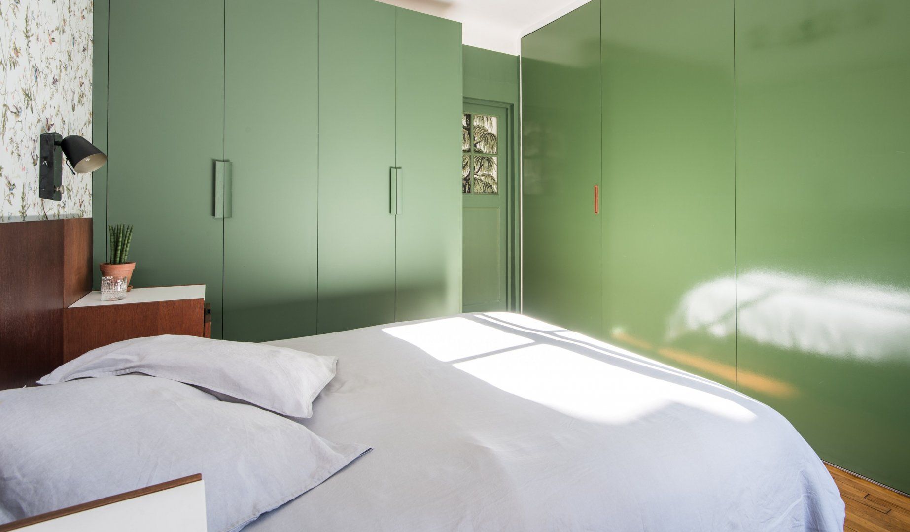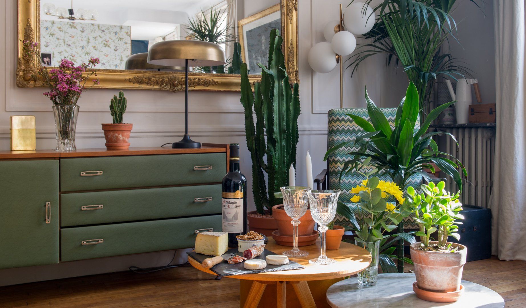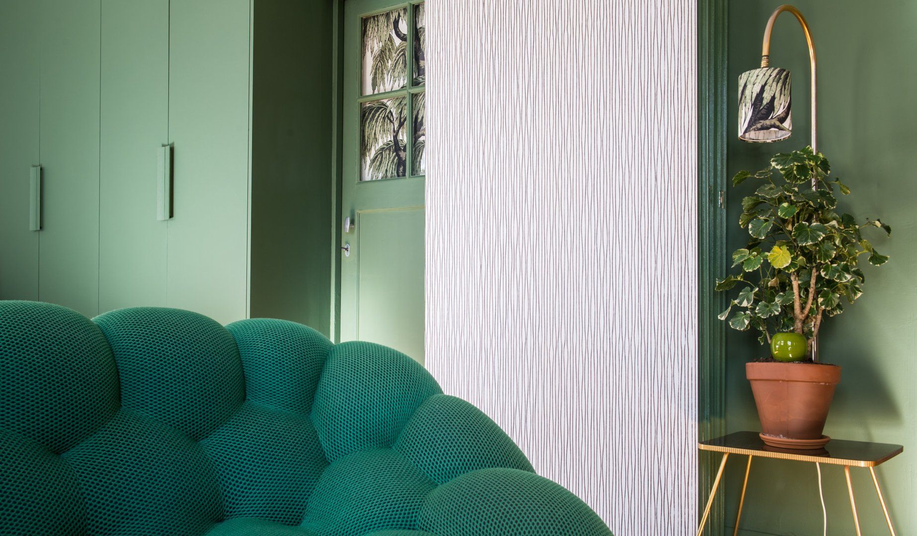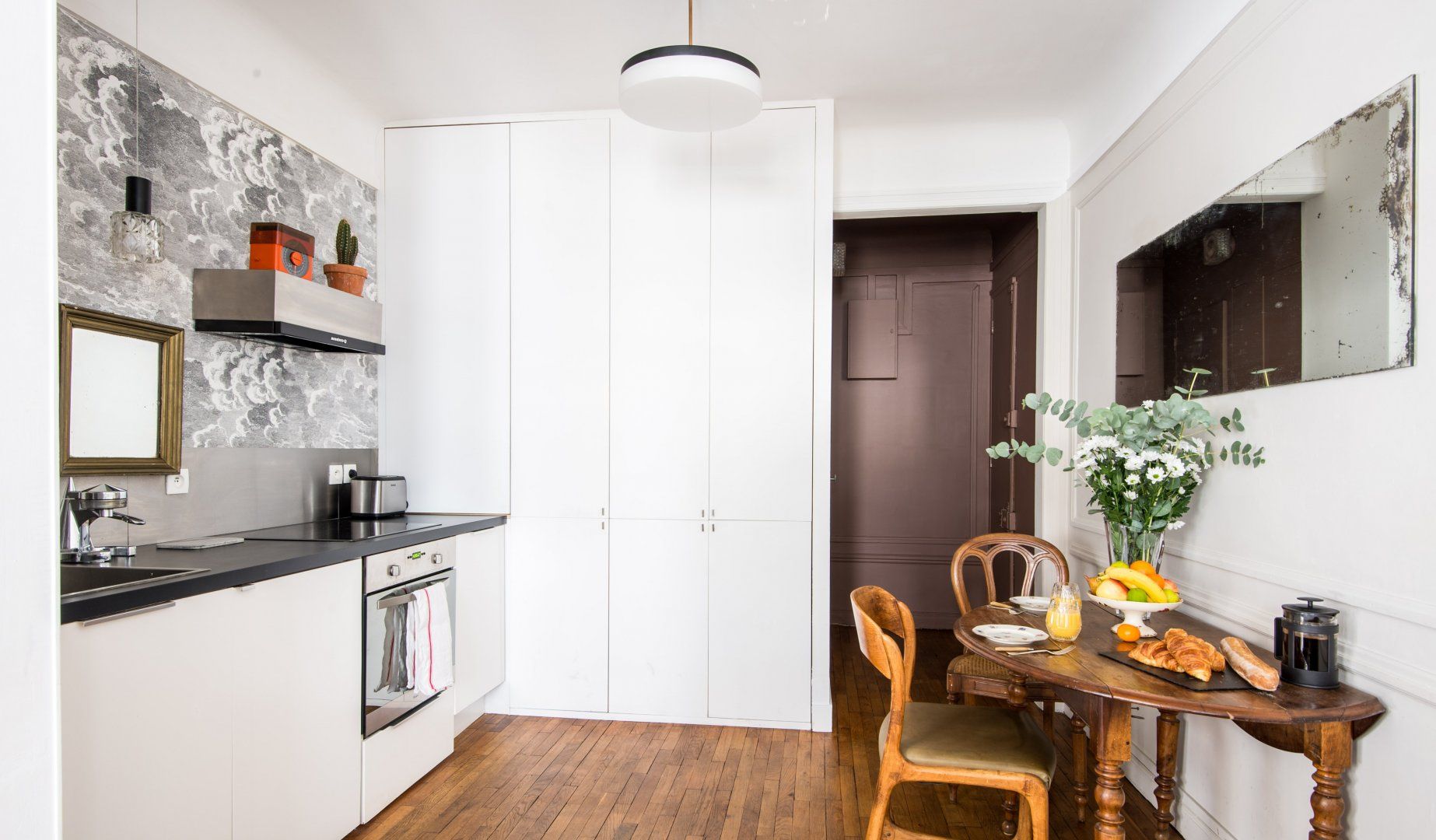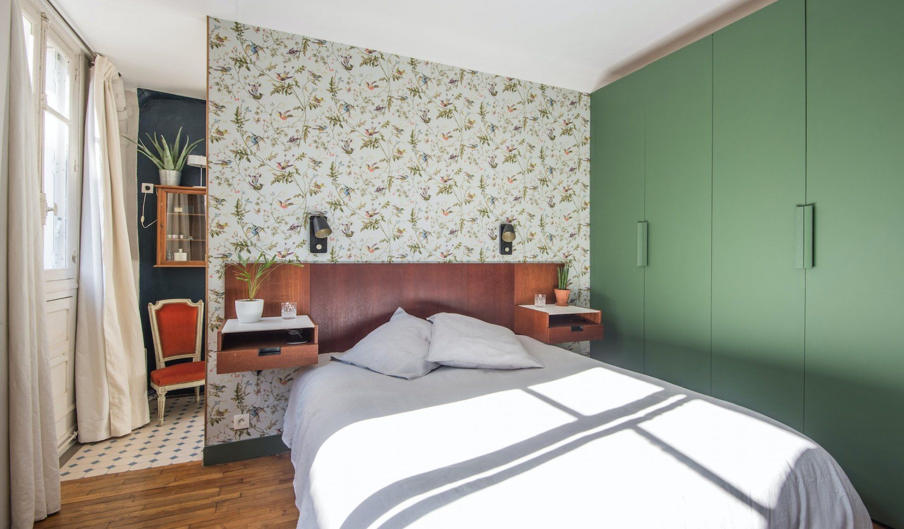 A cool trendy home with a mix of vintage and modern pieces that make a country house in the big city! There's so much to love - the floral wallpaper in the bedroom, the grey cloud wallpaper in the kitchen and that green sofa, a statement design piece if ever we saw one. There isn't a television in this abode, but this only adds to the authentic way back in time experience. Set in the lively district of Grands Boulevards, this is the perfect country retreat, an antidote to the buzzy city of lights.