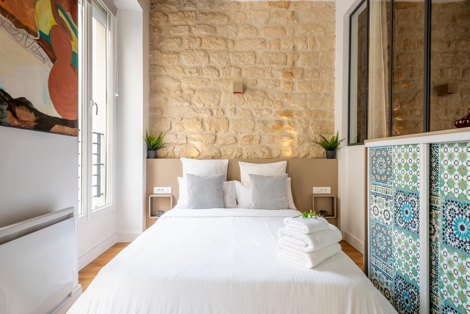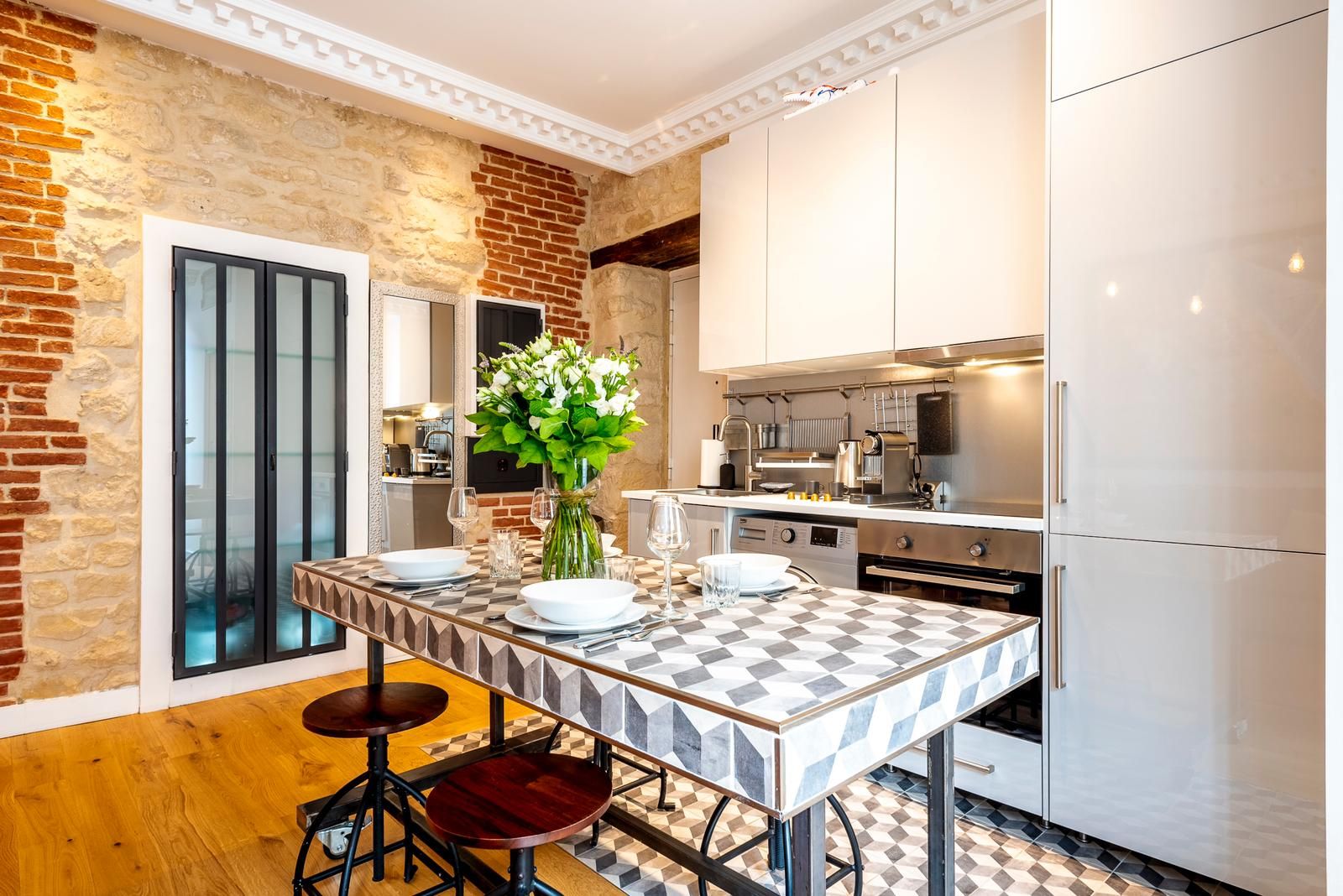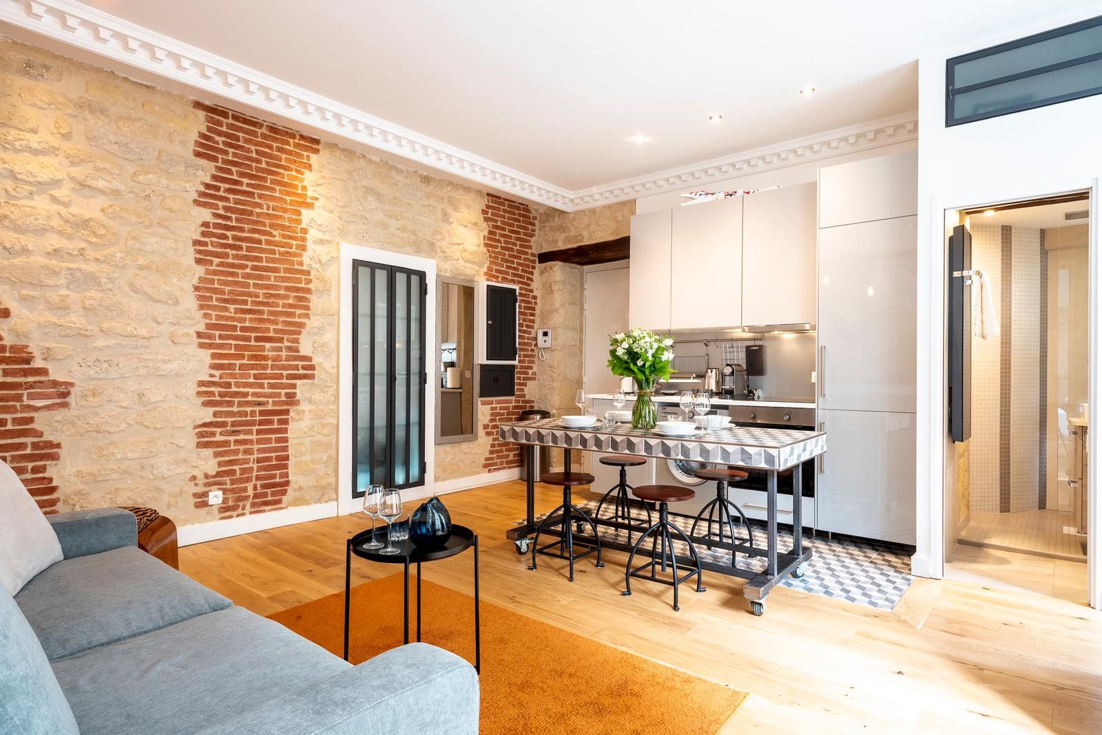 This 2nd arrondissement apartment is in an excellent spot for seeing Paris. It takes less than twenty minutes to walk to the Louvre and Jardin des Tuileries, and there’s a Metro station two minutes away so you can easily explore further afield. There are plenty of restaurants, cafes, and bars nearby, but you’ll also have a kitchen for preparing light bites. This is in the open-plan living and dining space, where two guests will sleep on a sofa bed. We love the style of this pied-à-terre, with its high ceilings and exposed brick and beams.