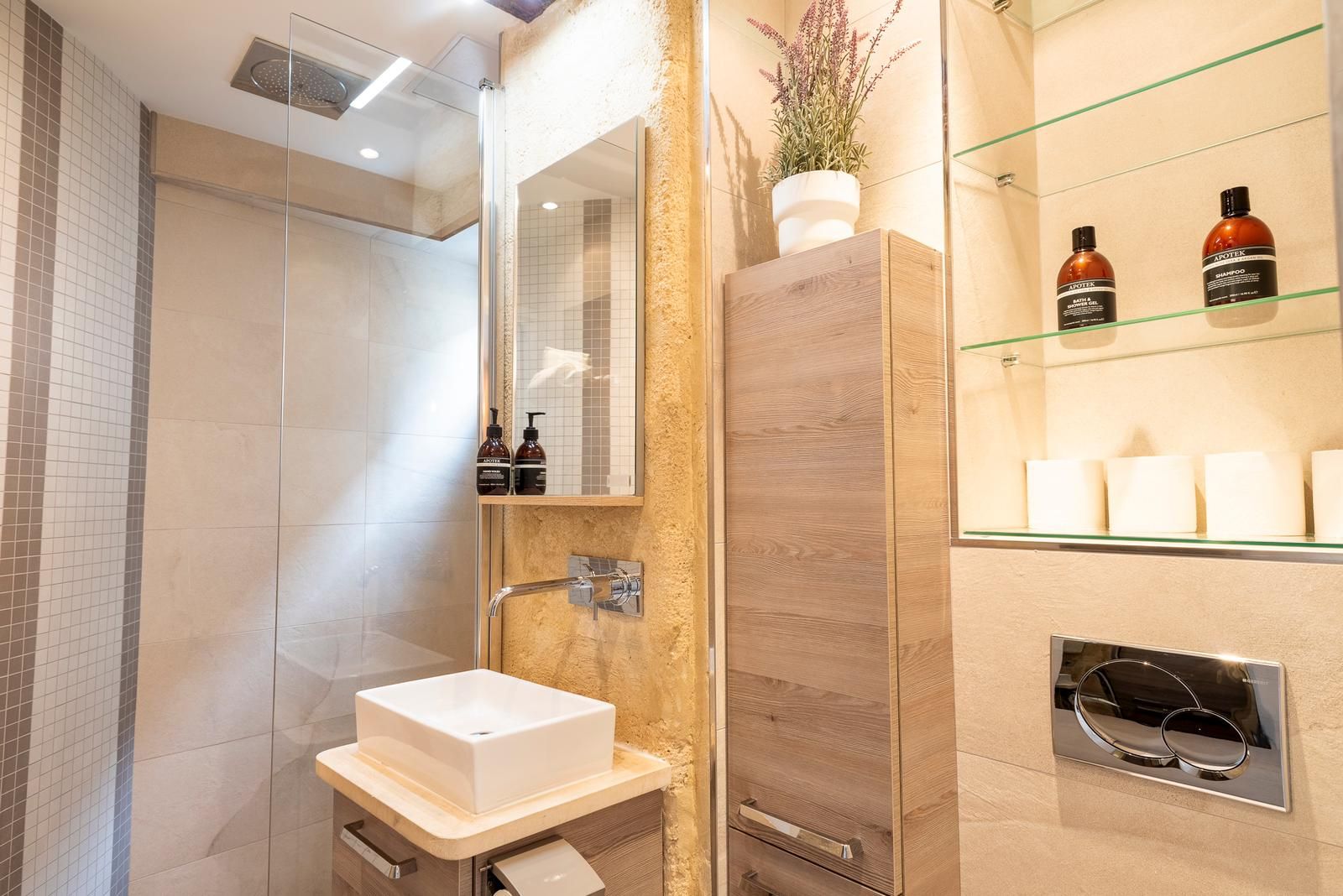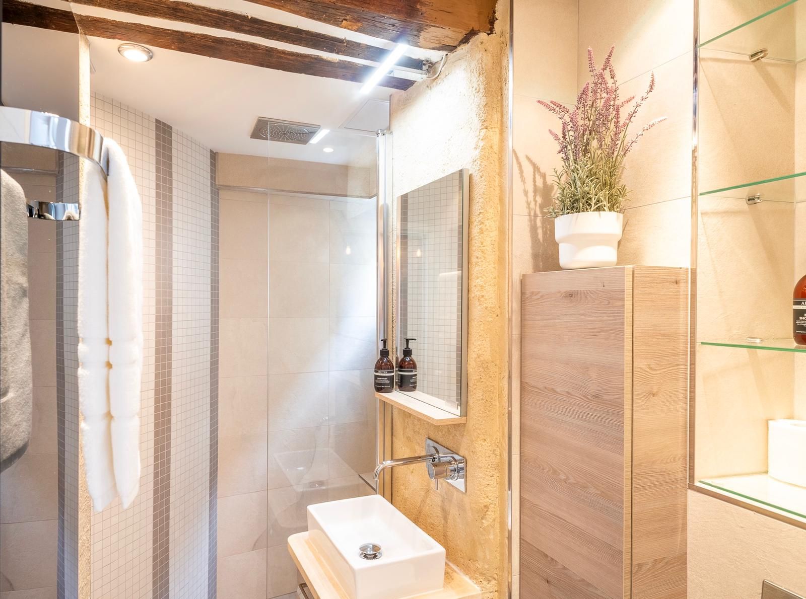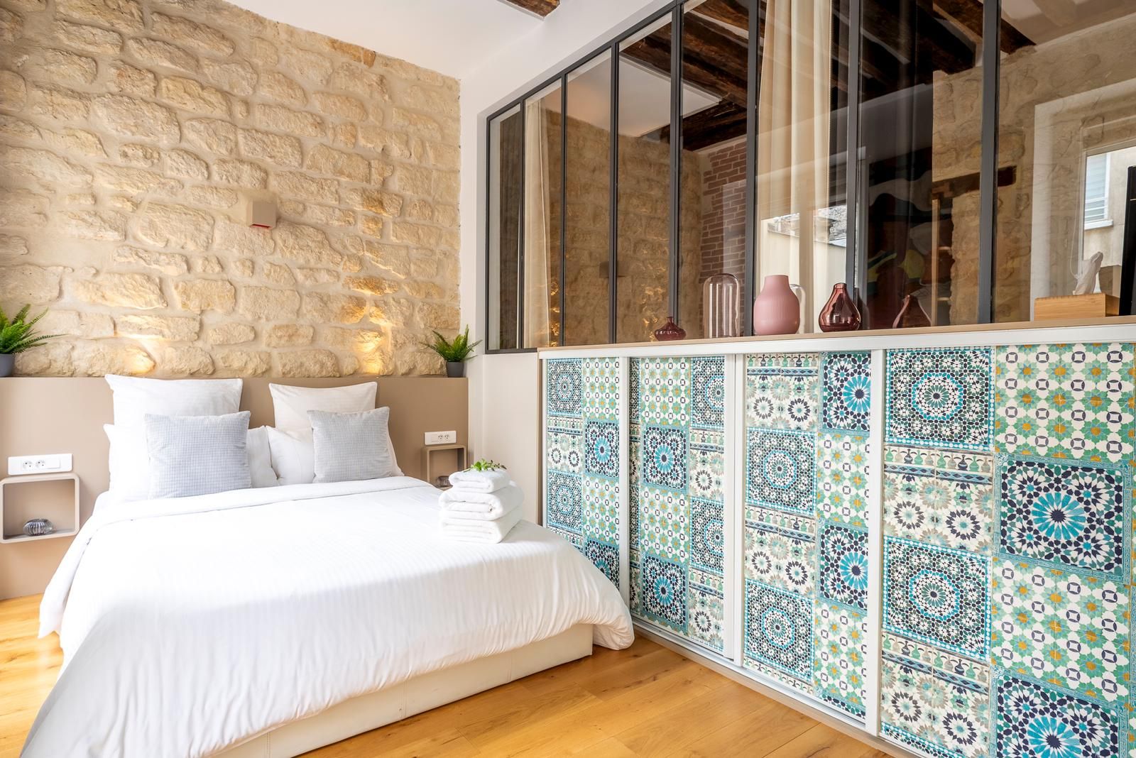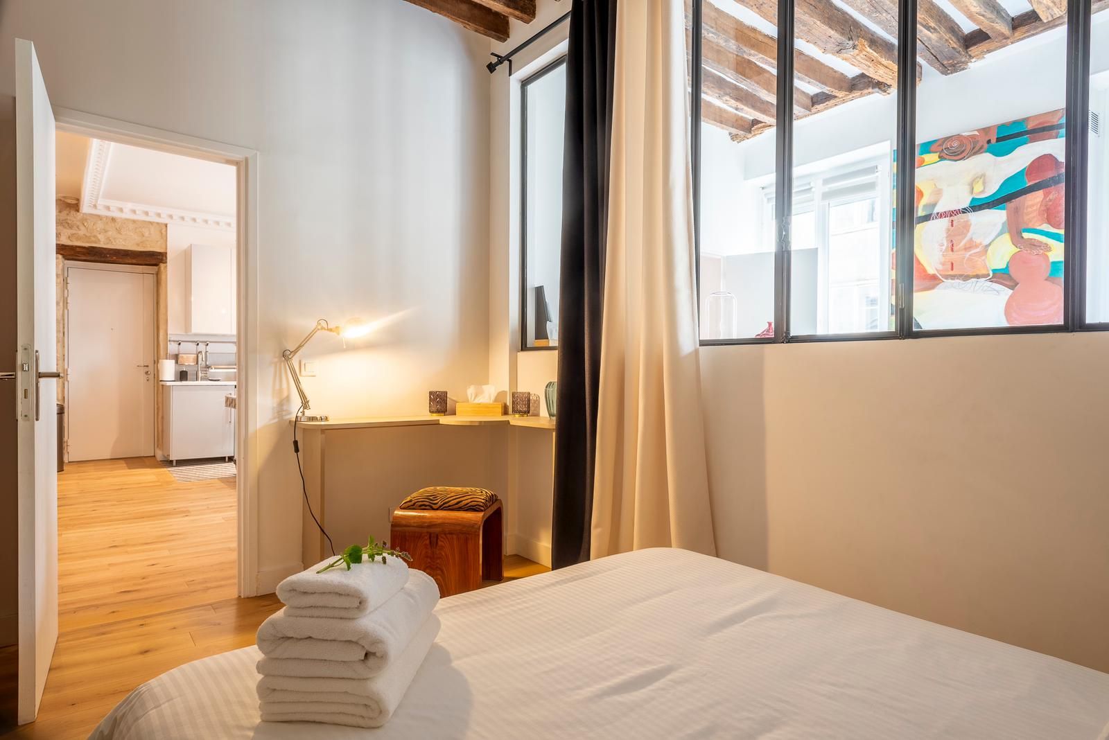 This 2nd arrondissement apartment is in an excellent spot for seeing Paris. It takes less than twenty minutes to walk to the Louvre and Jardin des Tuileries, and there’s a Metro station two minutes away so you can easily explore further afield. There are plenty of restaurants, cafes, and bars nearby, but you’ll also have a kitchen for preparing light bites. This is in the open-plan living and dining space, where two guests will sleep on a sofa bed. We love the style of this pied-à-terre, with its high ceilings and exposed brick and beams.