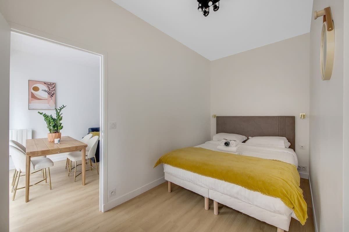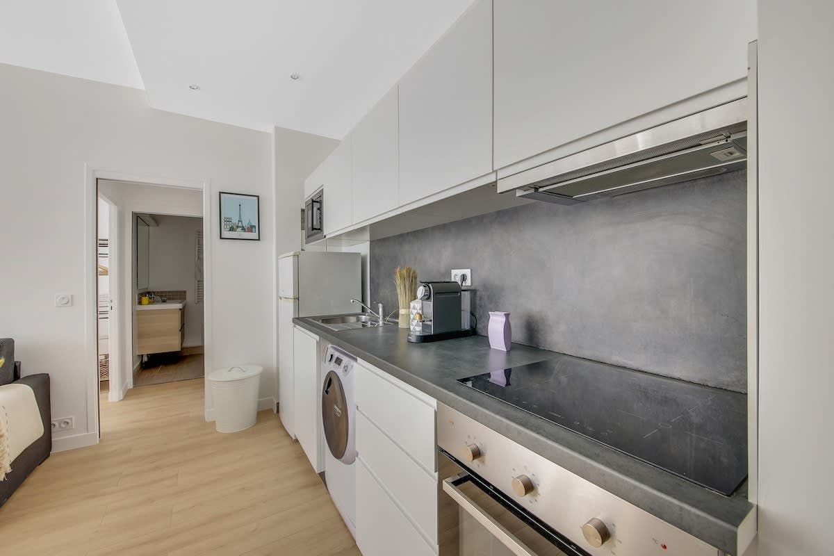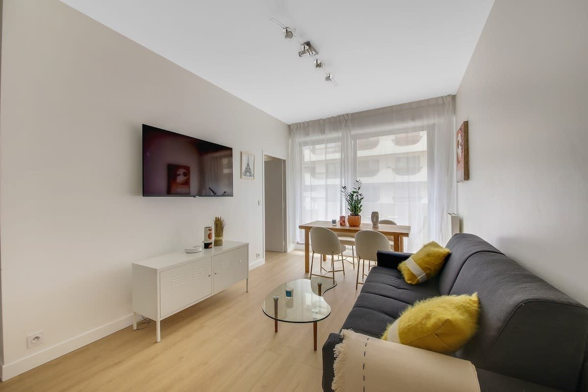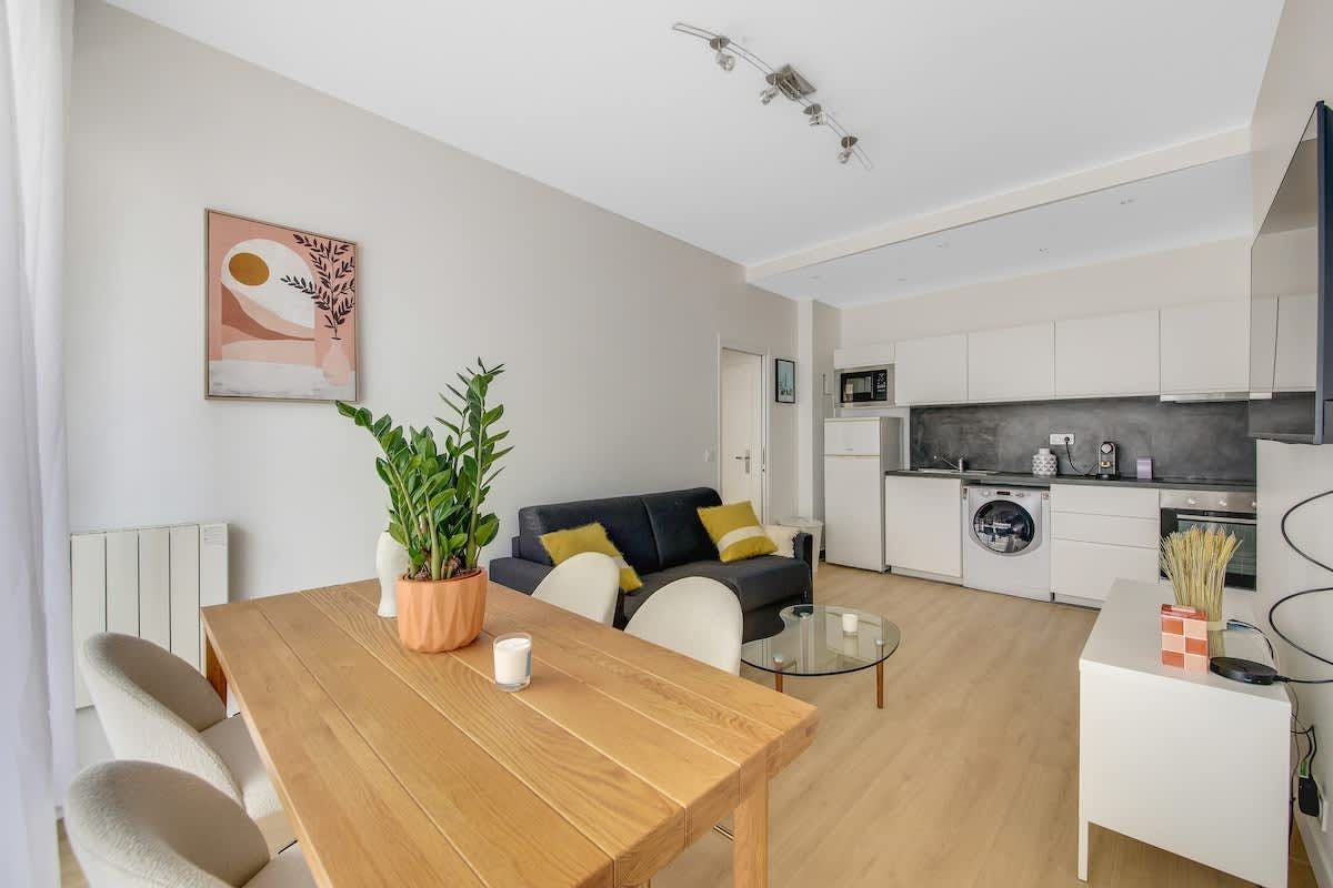 This Parisian apartment is a great find – right in the heart of the 15th arrondissement, with a large balcony as your very own outdoor space. The open-plan kitchen and dining area has enough room for preparing home-cooked meals, gathering around the table (which also doubles up nicely as a desk if you need it), and squeezing two guests onto the sofa bed. When you're ready to explore, you'll find the nearest metro station a two-minute walk away, along with plenty of authentic bars and bistros. If you prefer exploring the city on foot, top attractions like the Eiffel Tower are just a twenty-minute walk away.