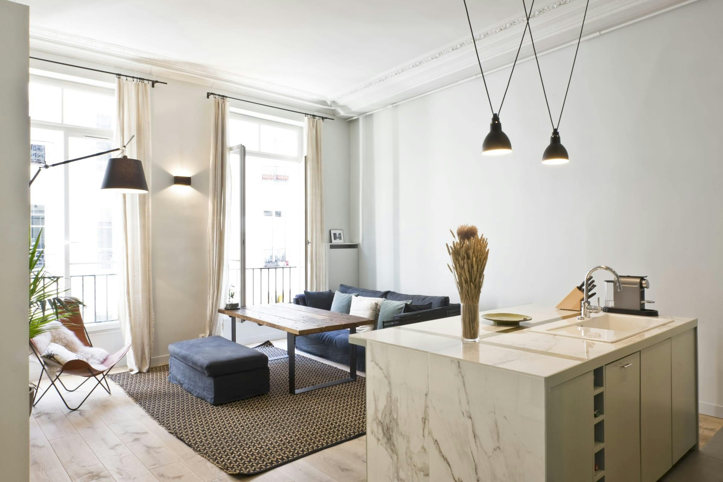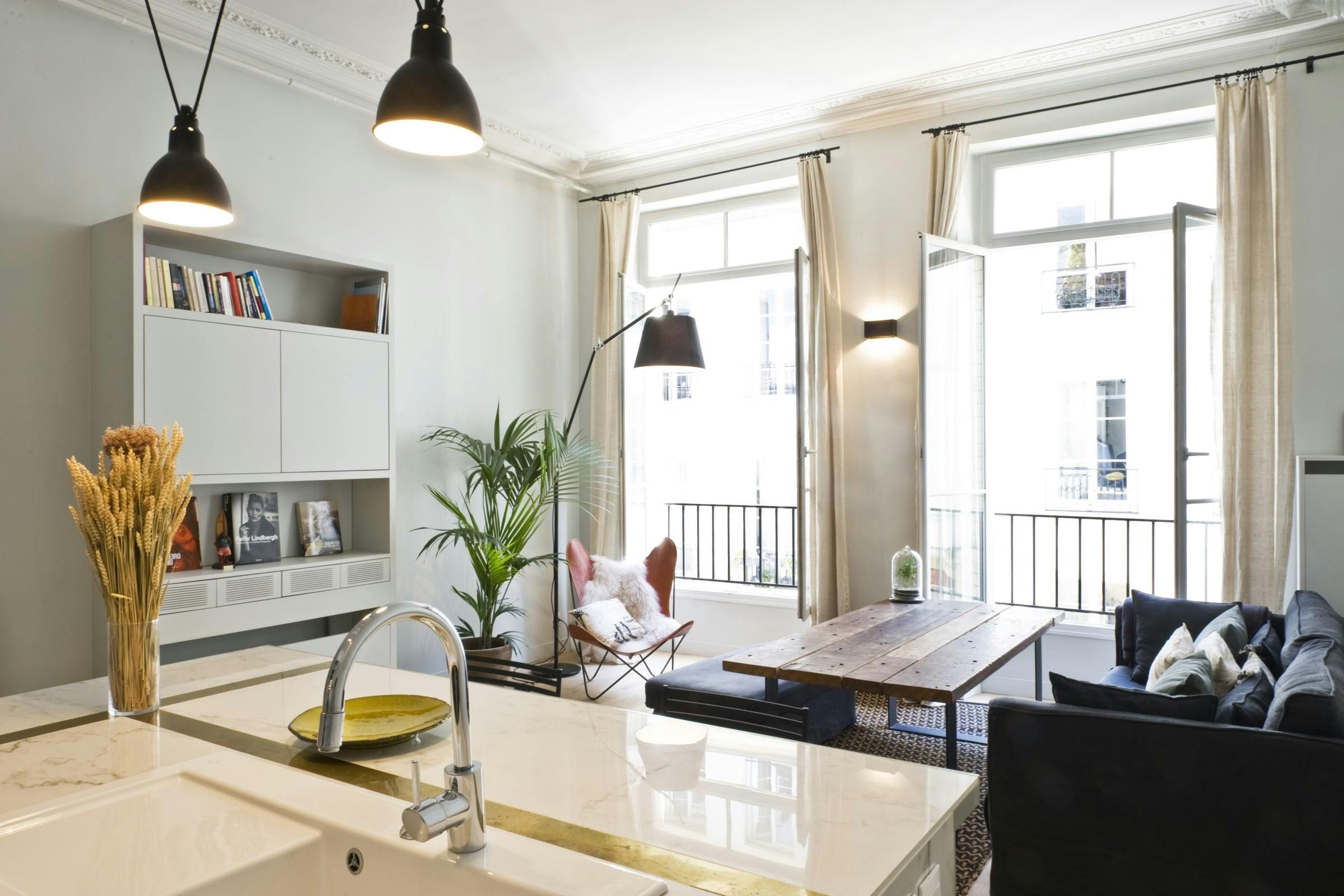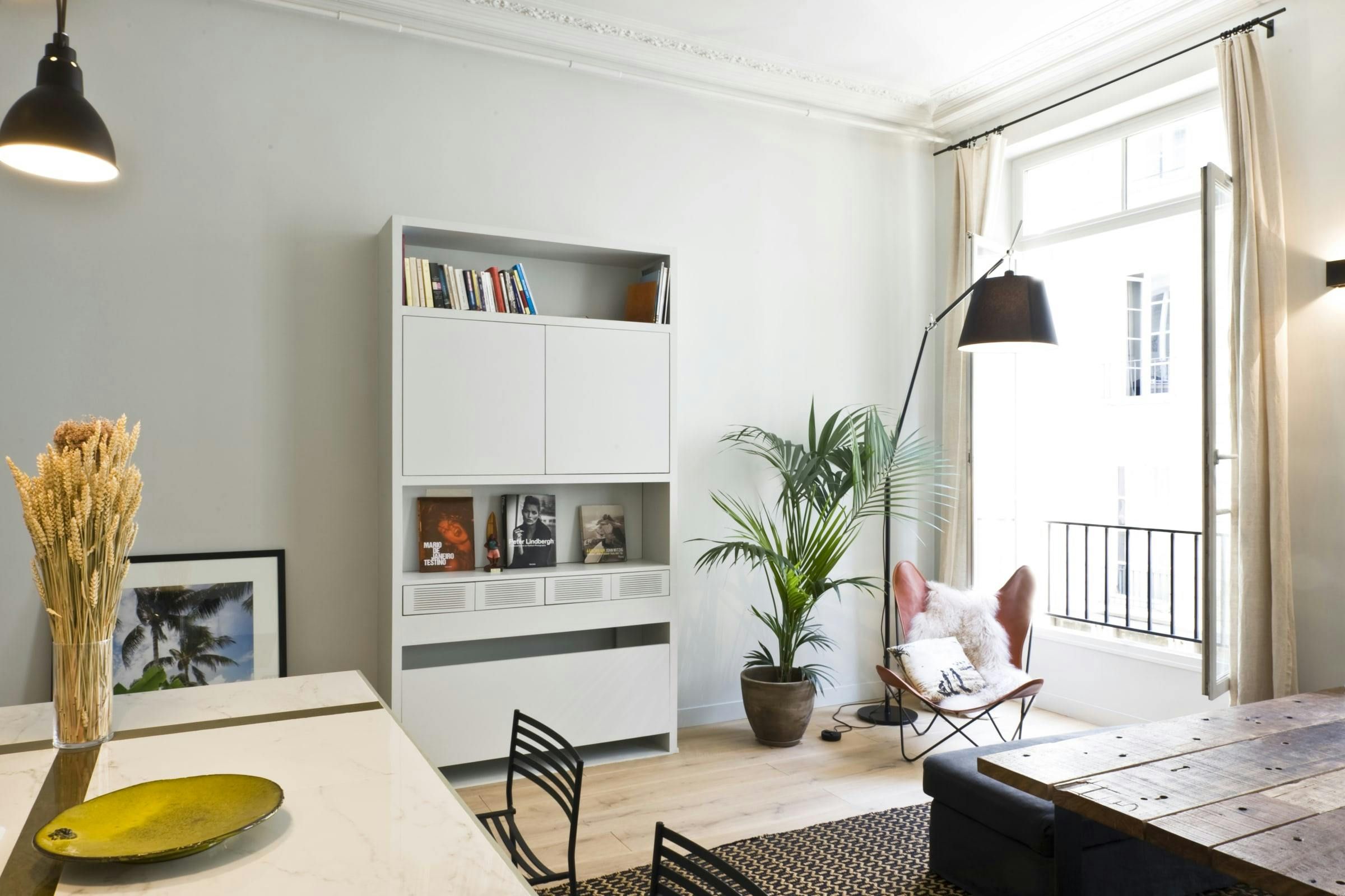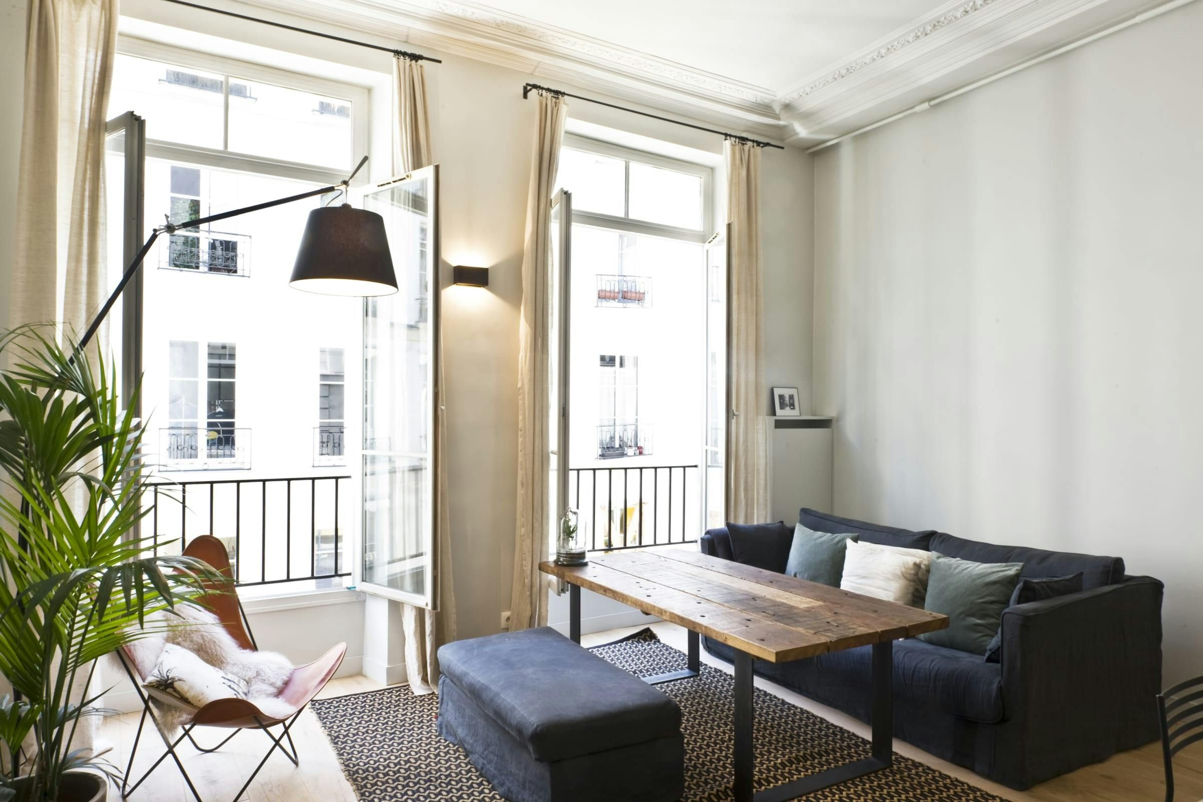 Available to guests studying or travelling for work, this apartment has a great location. You’ll find it on Rue d'Aboukir in the Bonne Nouvelle district, and it’s within walking distance of several cultural attractions. These include the Palais-Royal, the Centre Pompidou and the Louvre Museum. The apartment is located on the second floor (there’s no lift, so get ready for some stairs). We love this home's stylish open-plan living room – a renowned architect refurbished the place. It’s a great home from home to relax after a busy day.