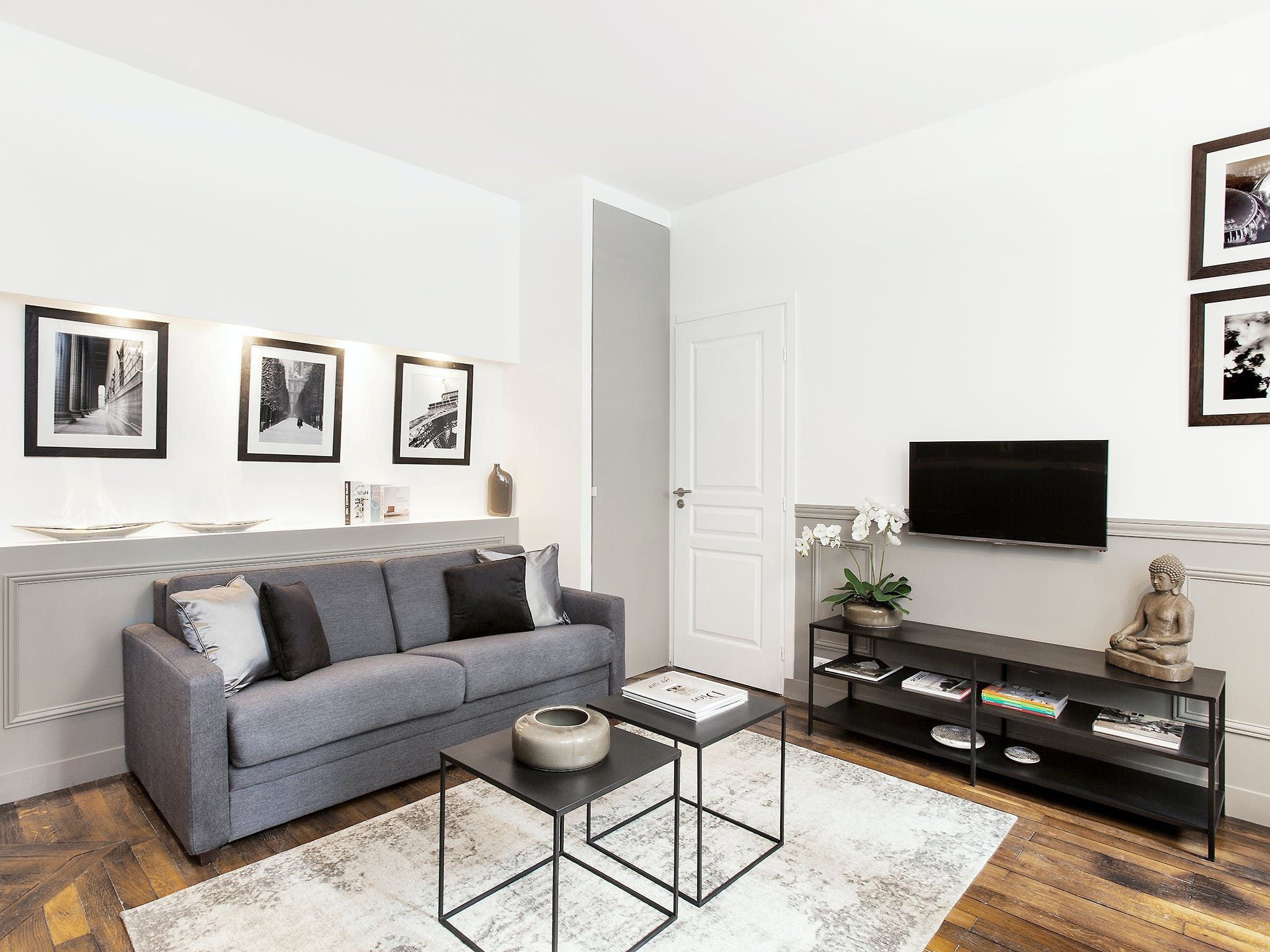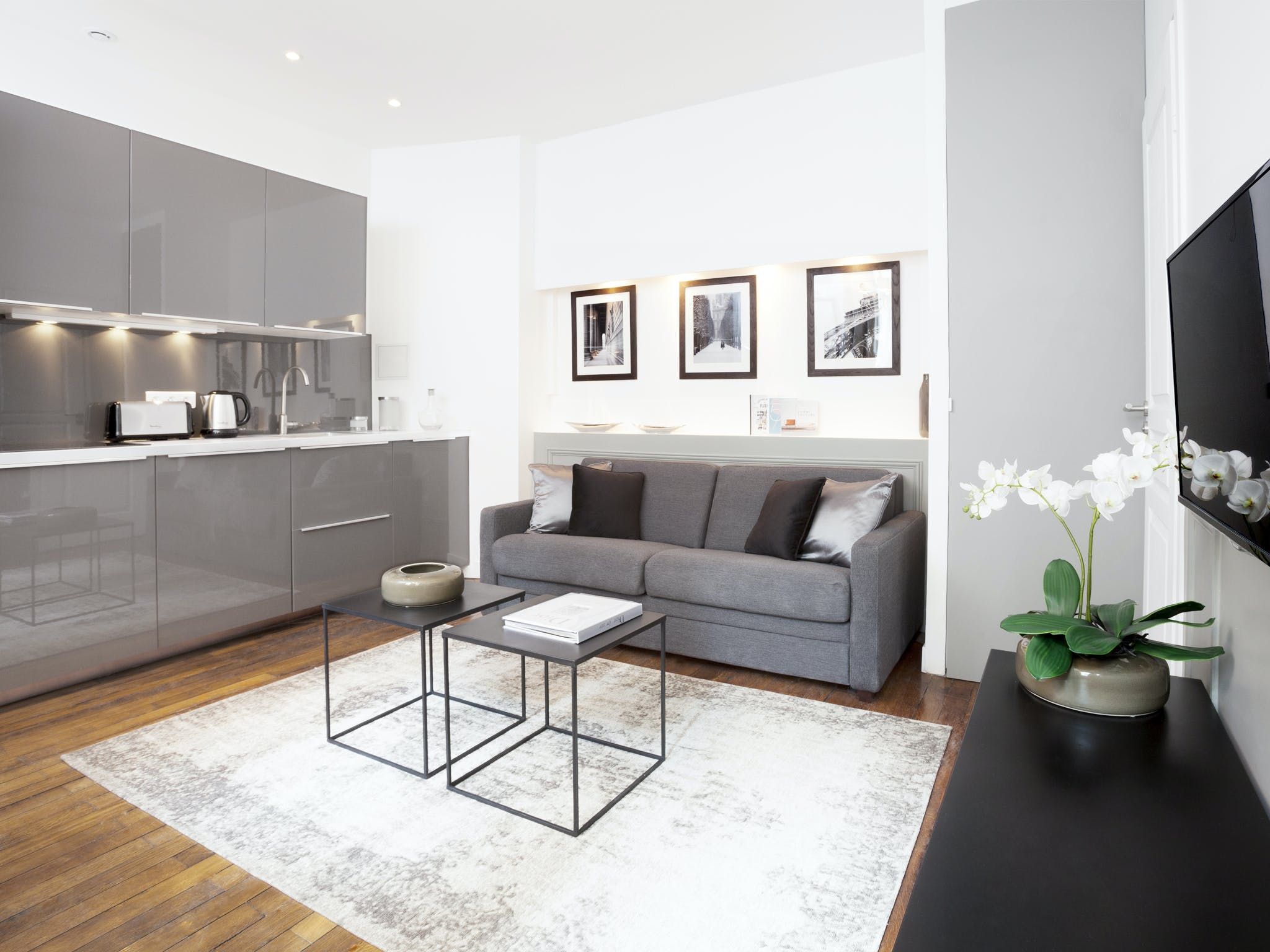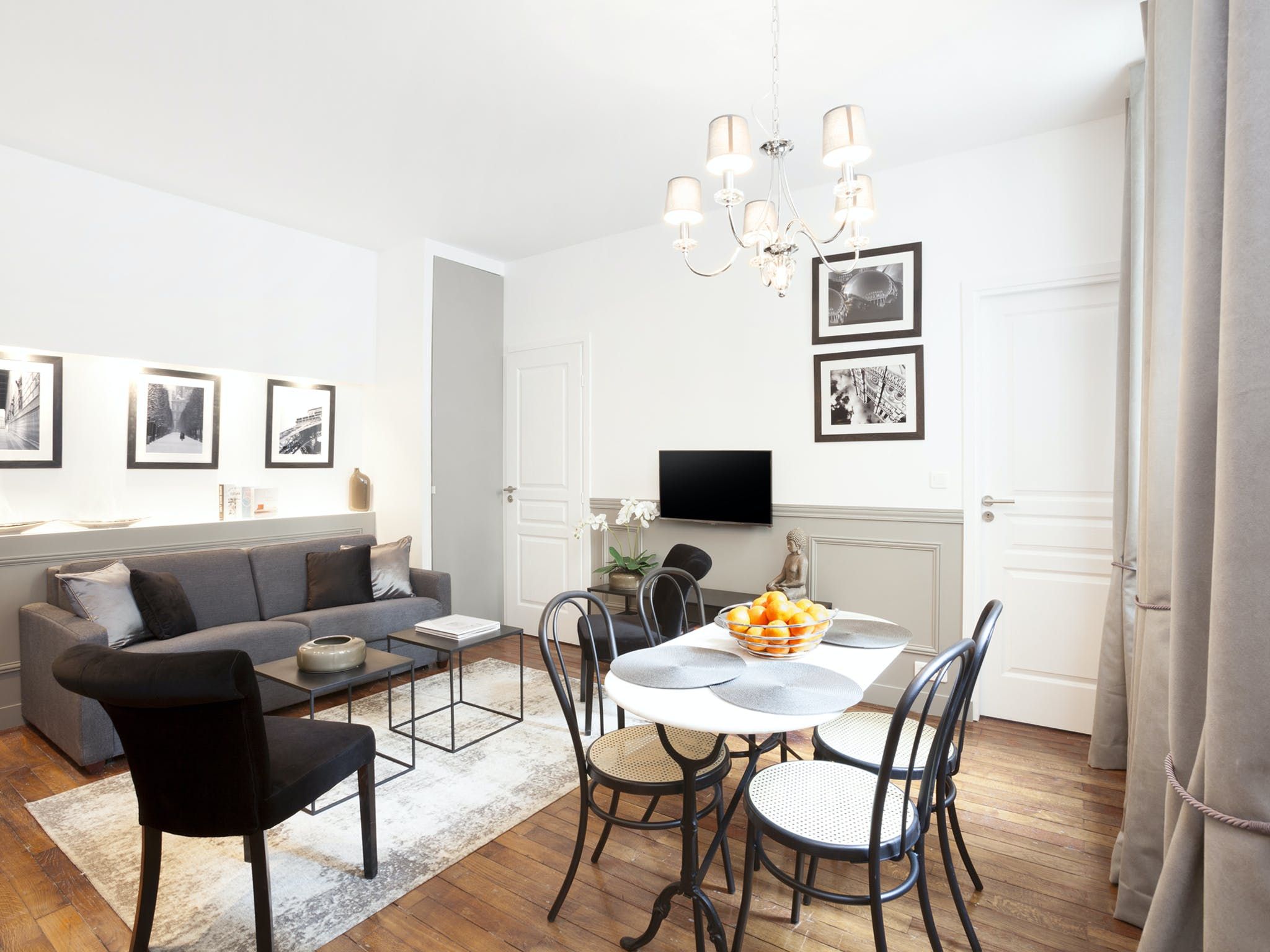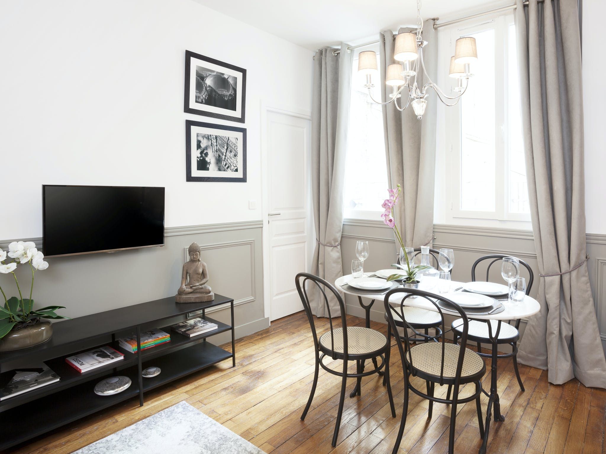 Located just a seven-minute walk from Paris’ Grands Boulevards, this elegant apartment exudes style and sophistication with its black, white and grey colour palette as well as its arty photographic prints on the walls. We love the nods to traditional Parisian culture here – like the chandelier and the bistro-style dining table – while decorative touches like the orchids and Buddha statue add a modern worldliness to the proceedings. The two comfortable bedrooms are equally chic with one boasting a desk should you need to catch up on work and both over-looking a traditional Parisian courtyard. Outside of your home, you’ve got plenty to see and do within easy walking distance, including the Louvre (twenty minutes), the vibrant Marais district (fifteen minutes), the Opéra Garnier (twenty-five minutes) and the irresistible Musée du Chocolat (five minutes).