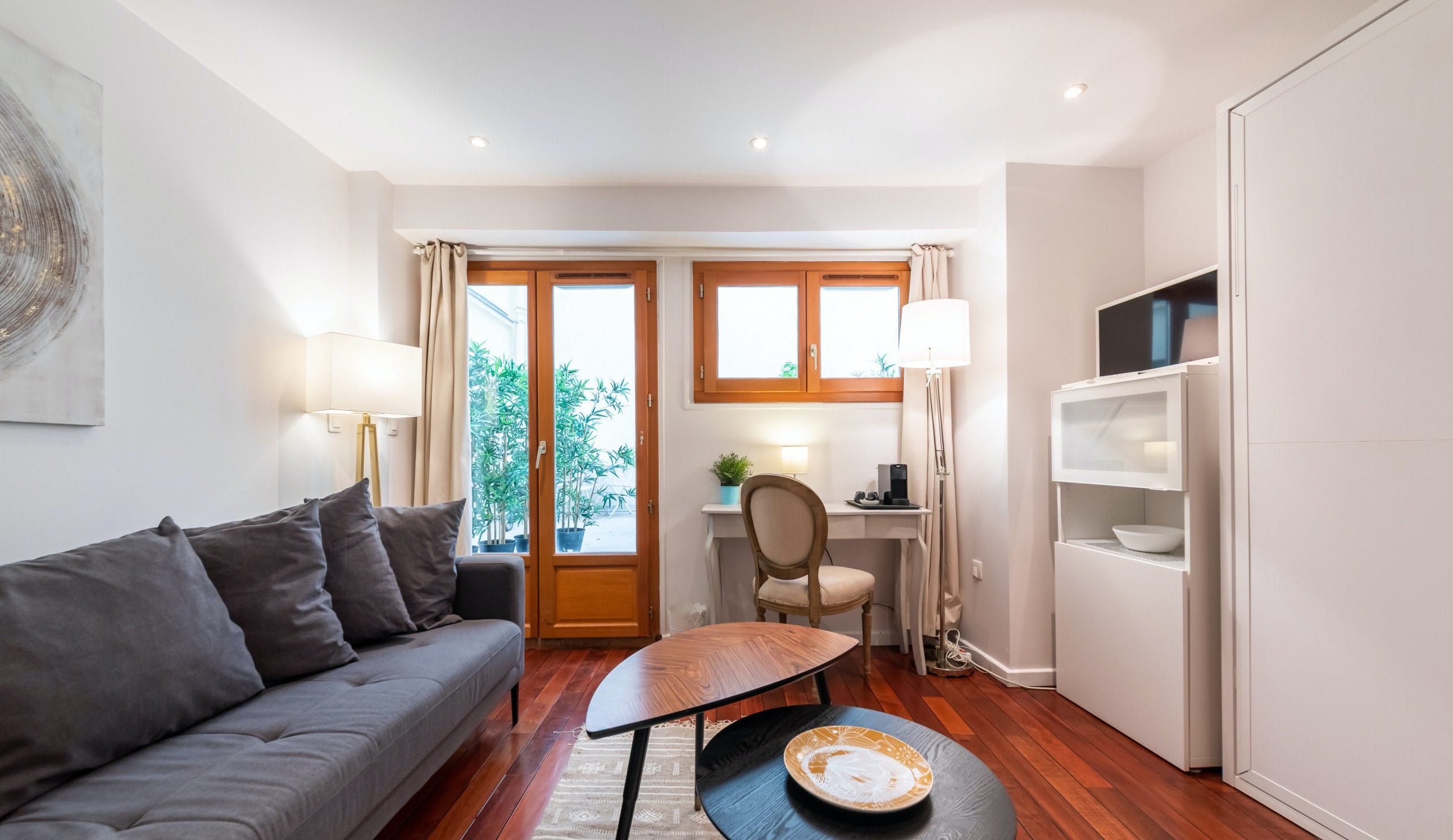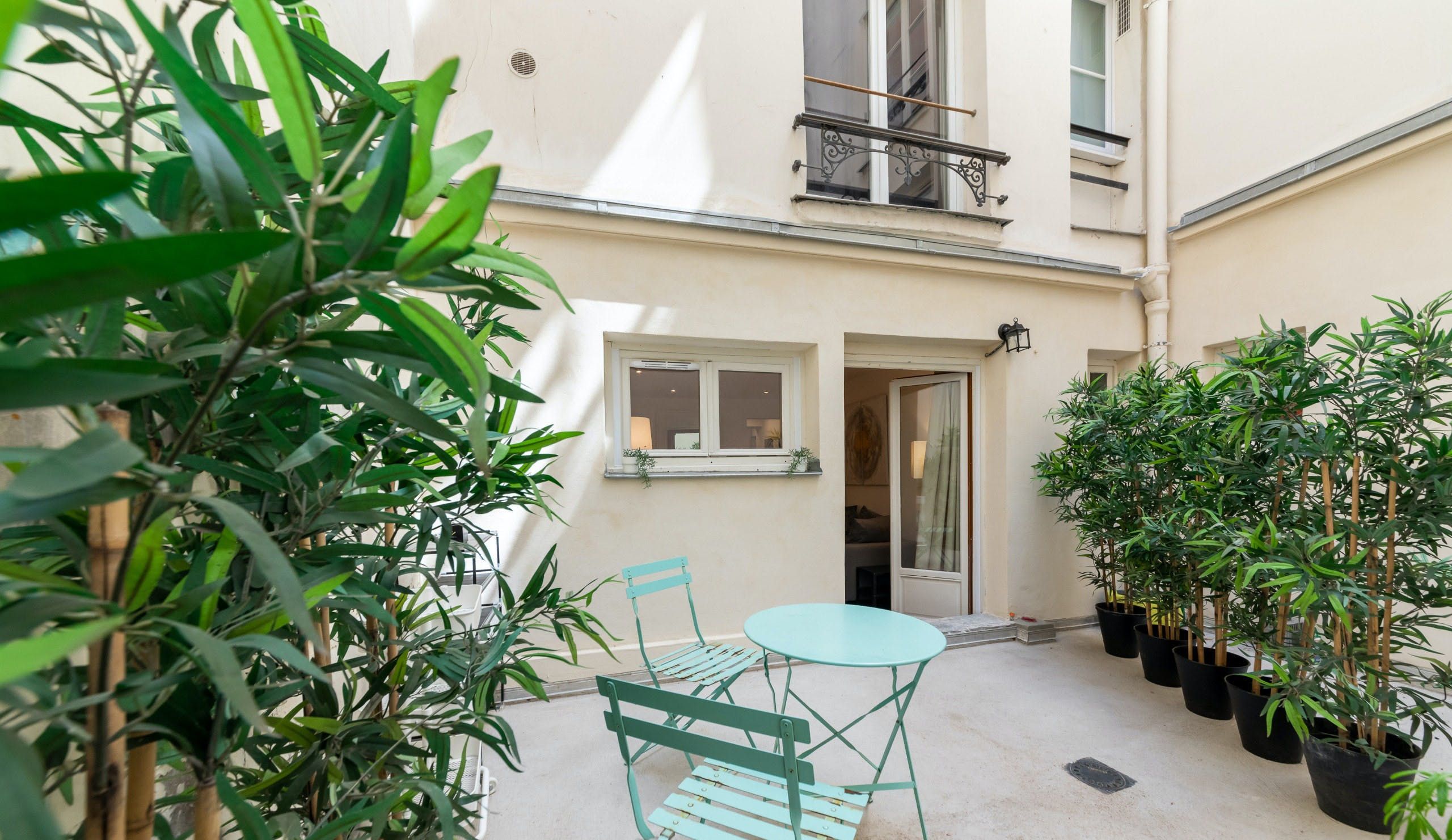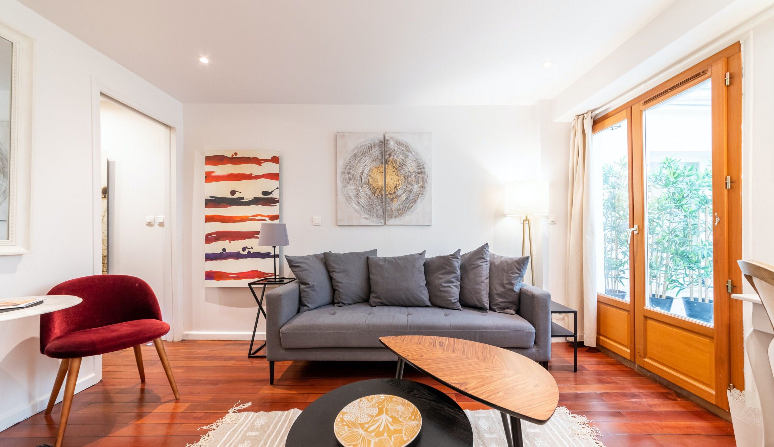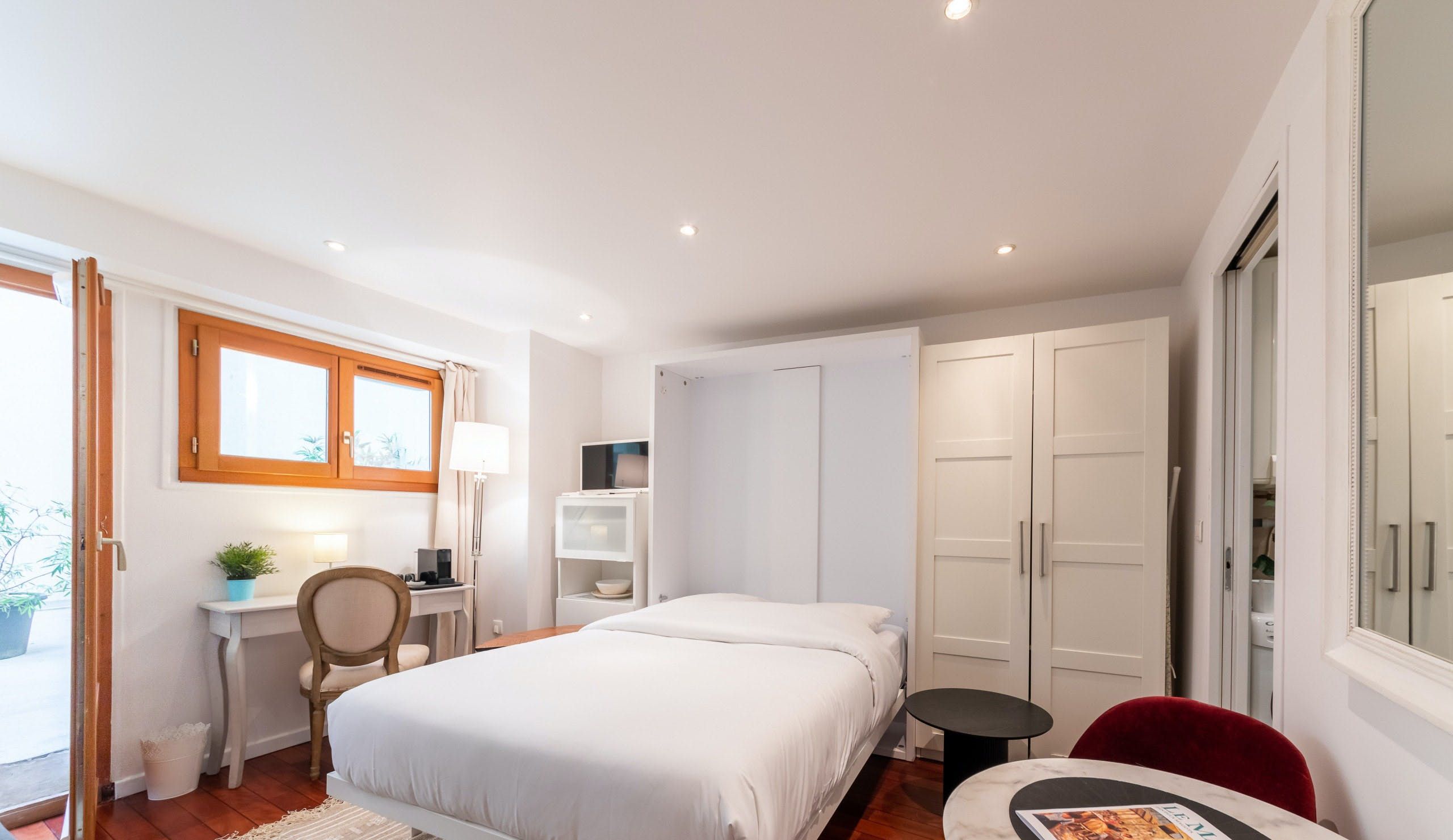 This cosy ground-floor apartment lies at the heart of Paris, perfect for those who want to get to know the capital a little more intimately. Enjoy natural sunlight from morning til dusk, with large windows in the doors to the communal terrace, where you’ll enjoy a morning coffee or a good book on the outdoor seating. Whip up a light lunch or some snacks in the kitchen, and eat on the couch while enjoying a movie or at the dining table as you discuss the day or make plans for your week. Those hoping to get some remote work or study done during their stay can take advantage of the dedicated desk, perfect for setting up a laptop and getting productive. In the evening, pull down the Murphy bed and transform the living space into a cosy bedroom where you're sure to get a great night's sleep.