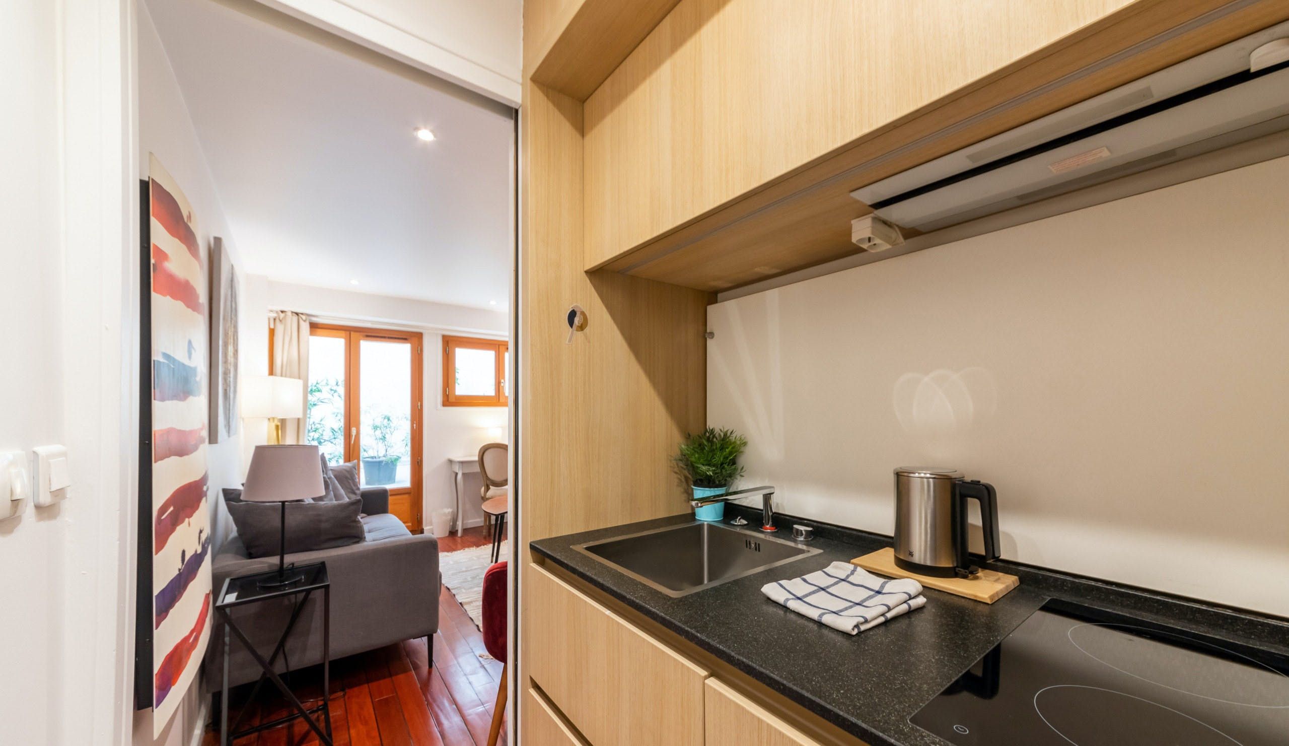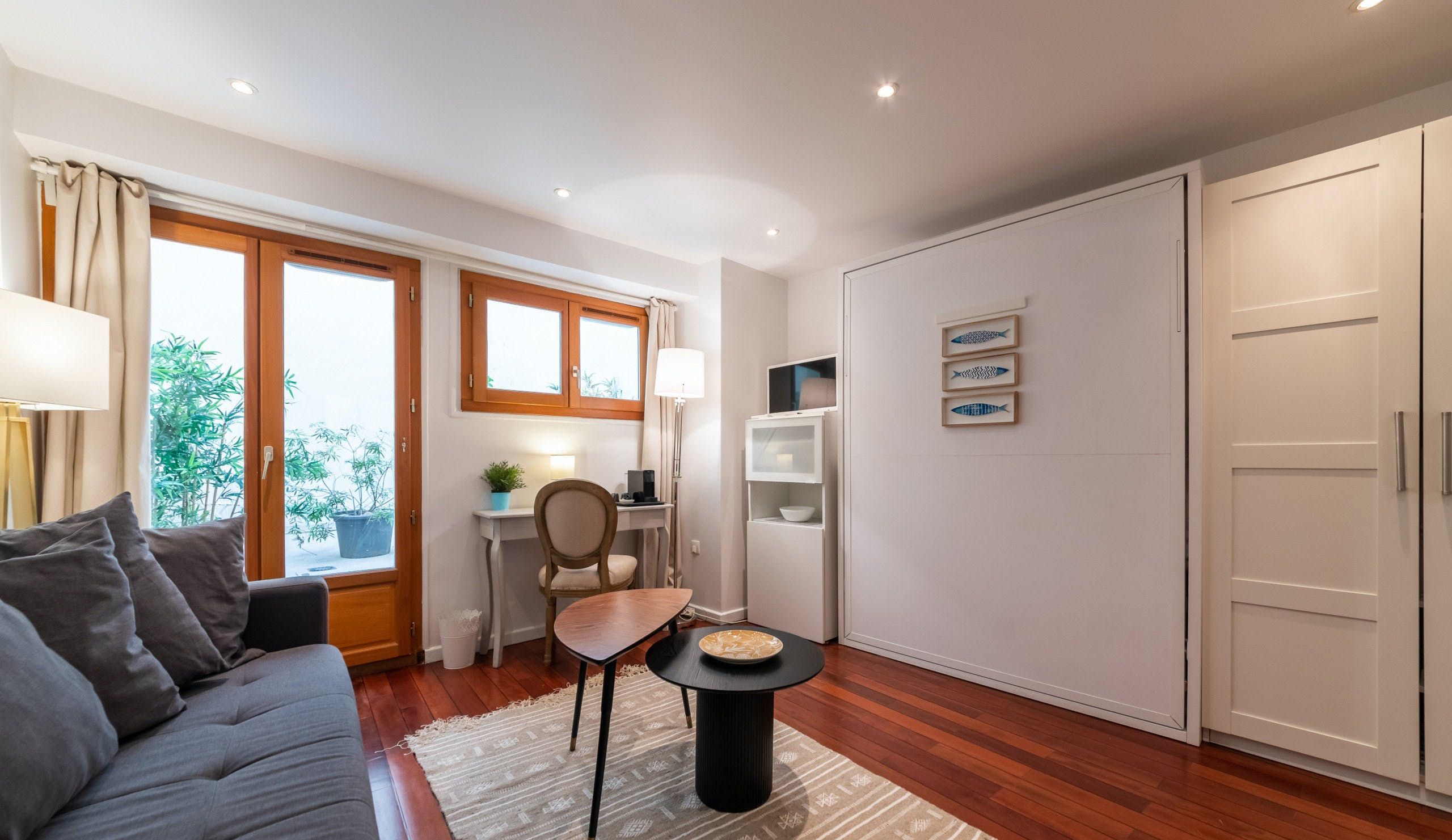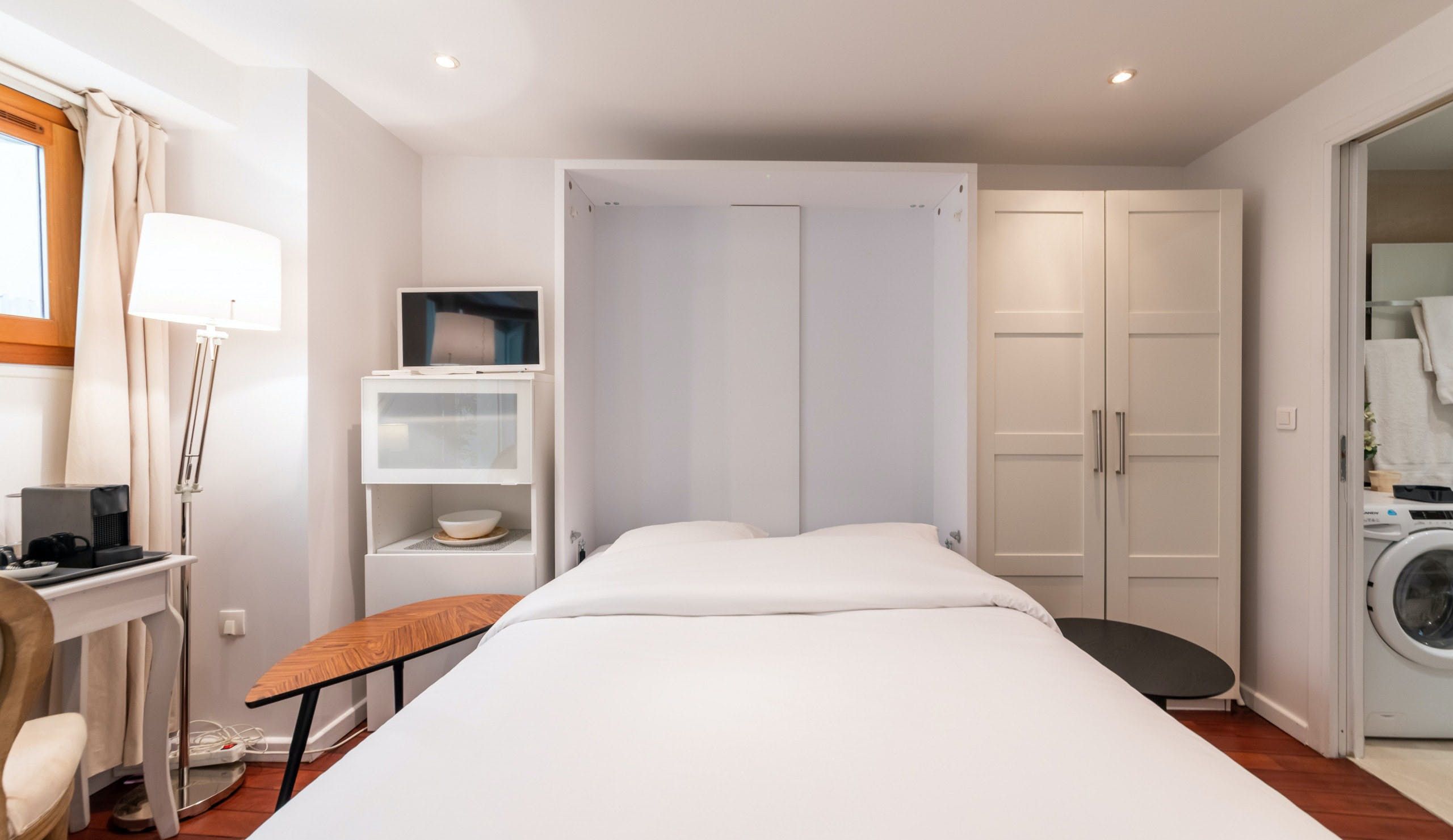 This cosy ground-floor apartment lies at the heart of Paris, perfect for those who want to get to know the capital a little more intimately. Enjoy natural sunlight from morning til dusk, with large windows in the doors to the communal terrace, where you’ll enjoy a morning coffee or a good book on the outdoor seating. Whip up a light lunch or some snacks in the kitchen, and eat on the couch while enjoying a movie or at the dining table as you discuss the day or make plans for your week. Those hoping to get some remote work or study done during their stay can take advantage of the dedicated desk, perfect for setting up a laptop and getting productive. In the evening, pull down the Murphy bed and transform the living space into a cosy bedroom where you're sure to get a great night's sleep.