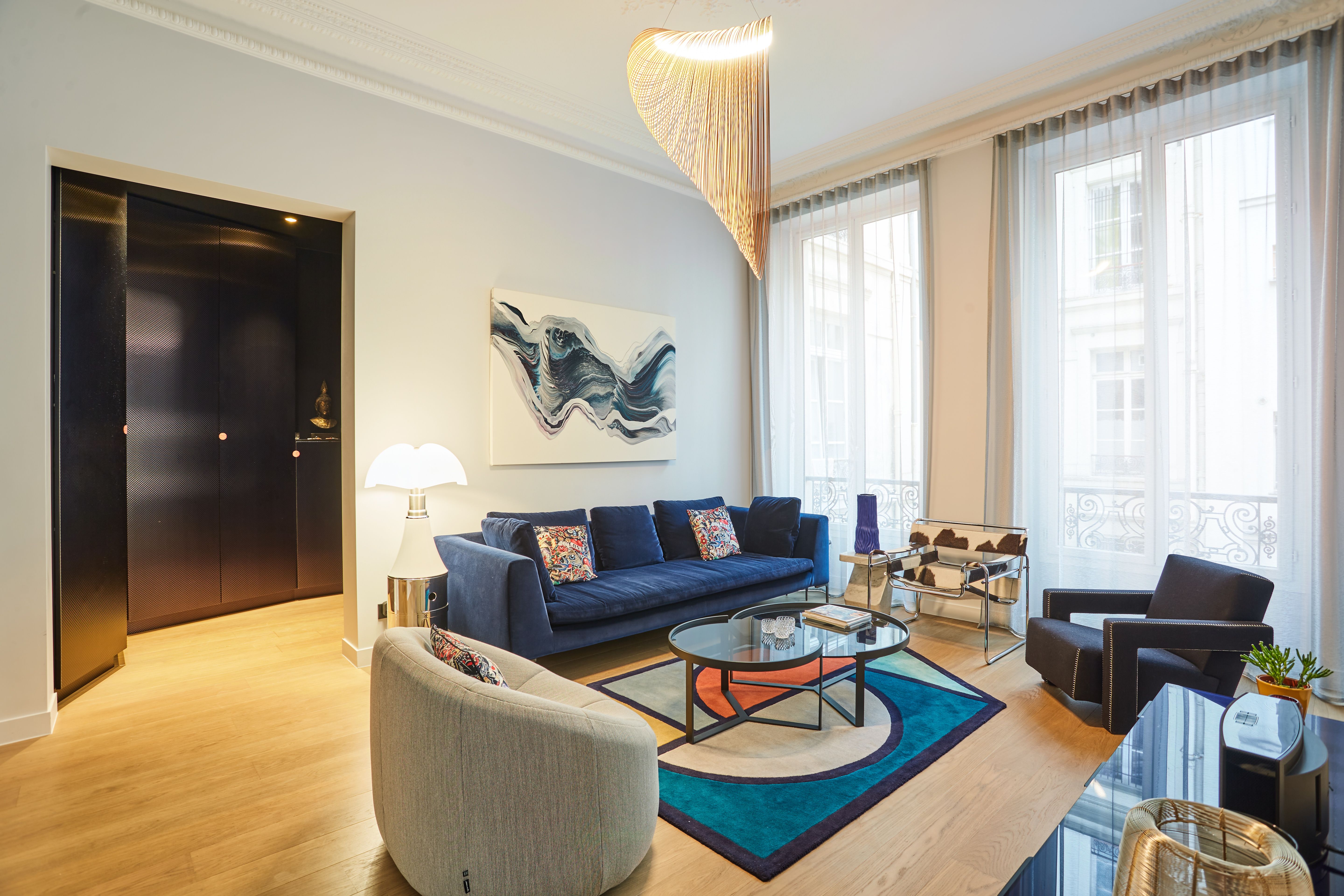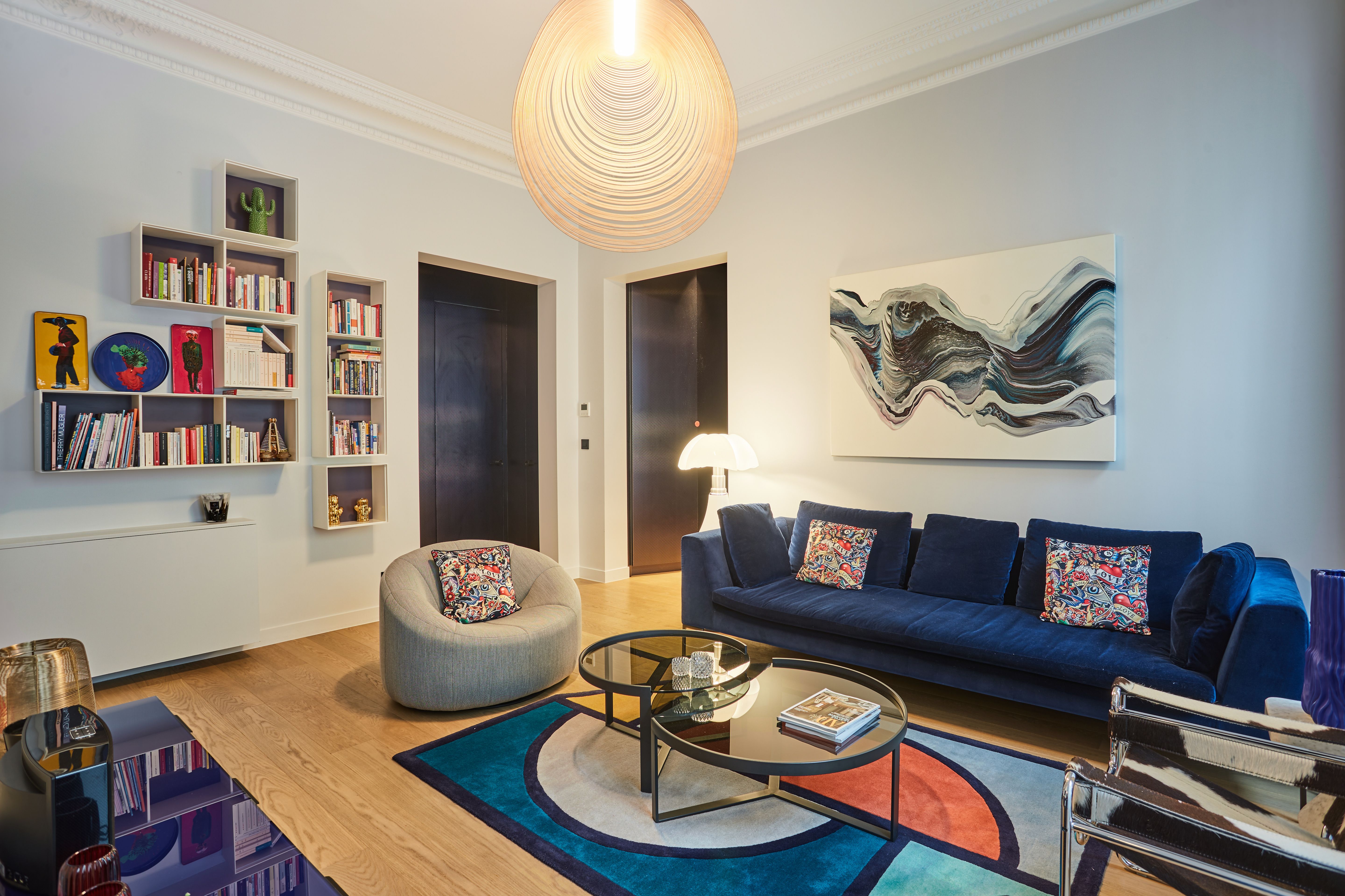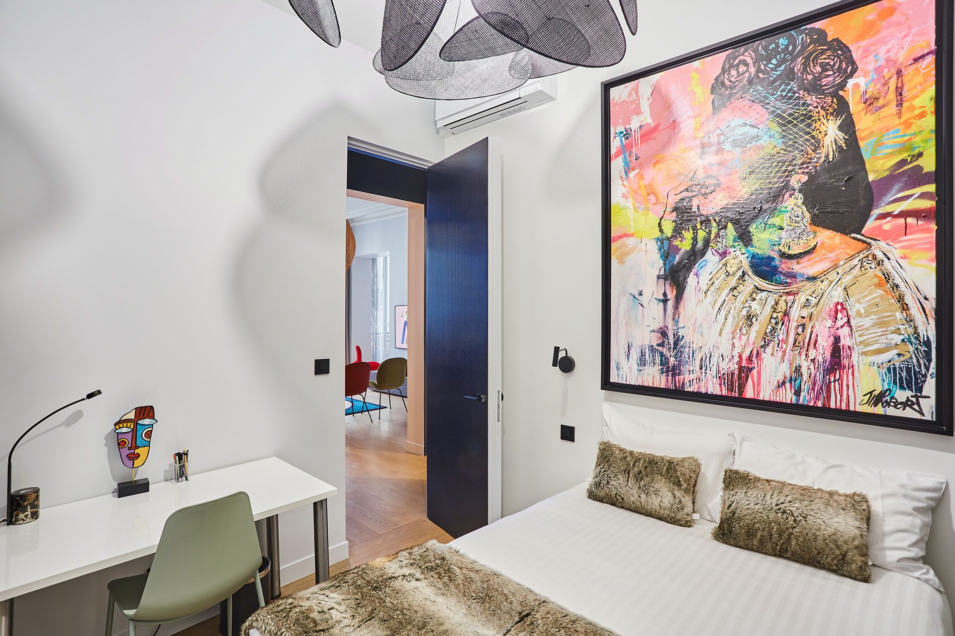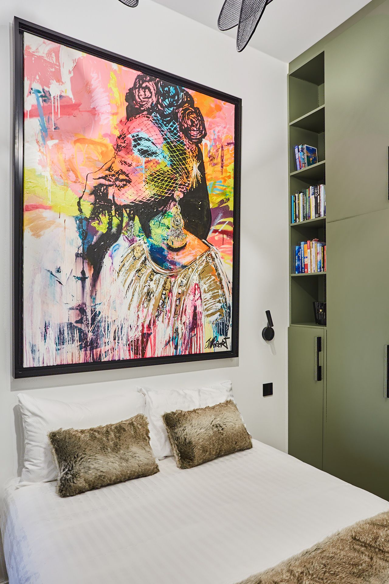 Between the buzzing centre of Paris and the super chic Le Marais neighbourhood, this art-filled apartment is ideal for creative types. It’s a ten-minute walk to the world-class collection of the Louvre, and thirteen minutes to Notre Dame. But stick around in Le Marais, and you’ll find niche museums, bijou boutiques and galleries, and trendy bars. The apartment itself is in a handsome Haussmann building of big windows and wrought-iron balconies. Stepping inside feels like stepping into one of the chichi galleries of Le Marais as big, bold contemporary artworks adorn the white walls in high-ceiling rooms. The French windows in the living room look out over an internal courtyard, so it’s blissfully quiet – perfect if you want to curl up on the velvet sofa with a book from the mini-library. The kitchen is all sleek modernism, with a quartz island and sunny breakfast table for a morning coffee and croissant.