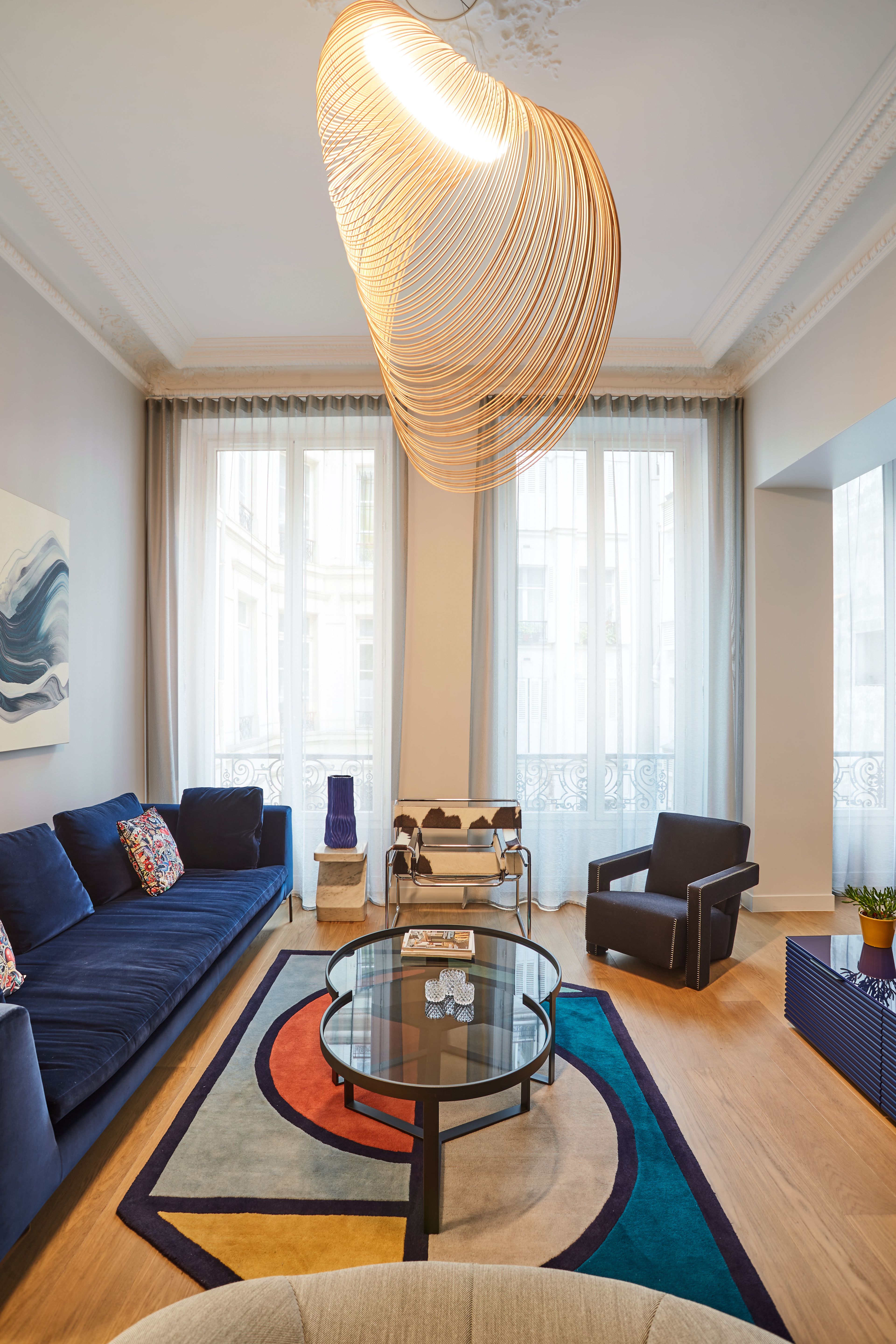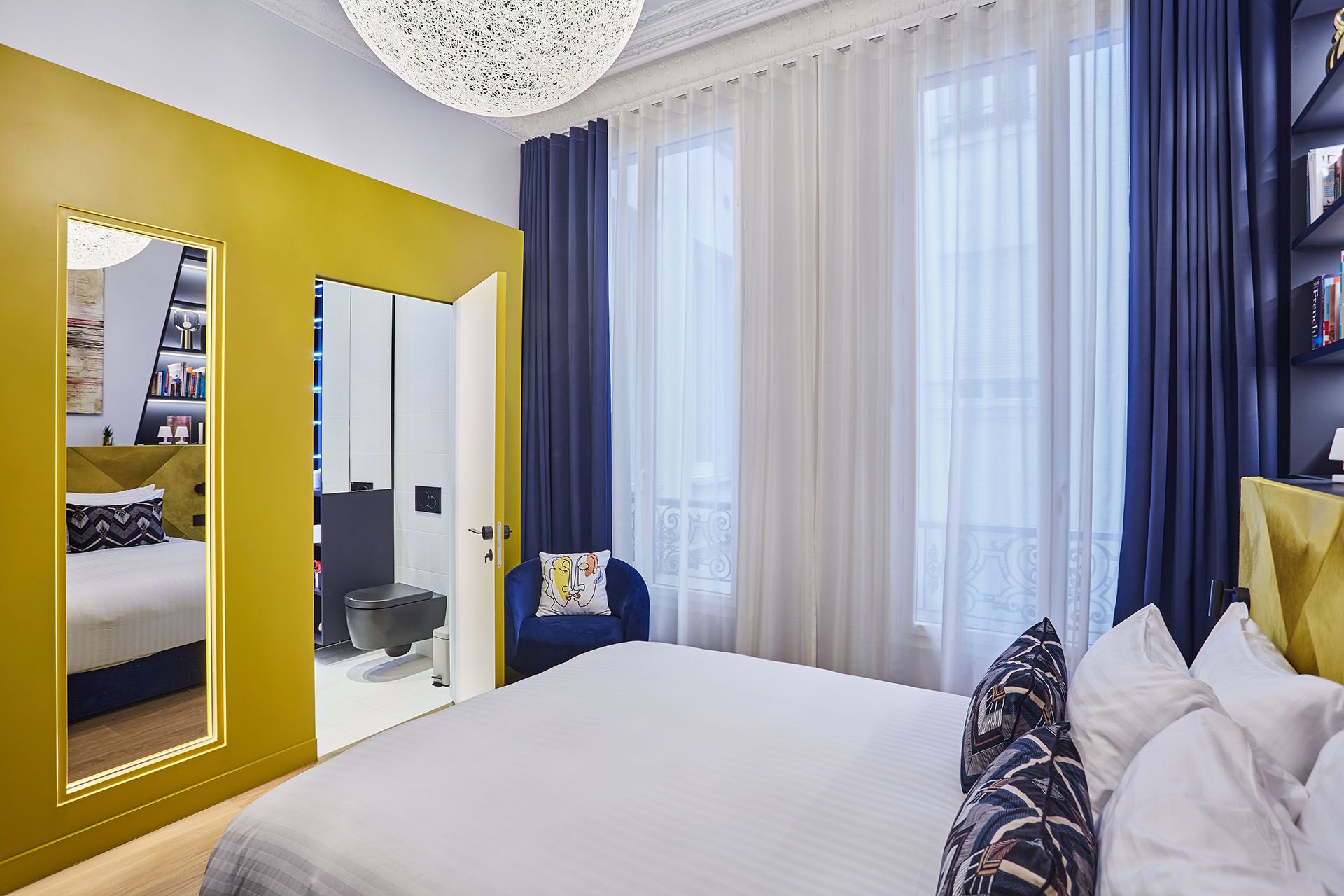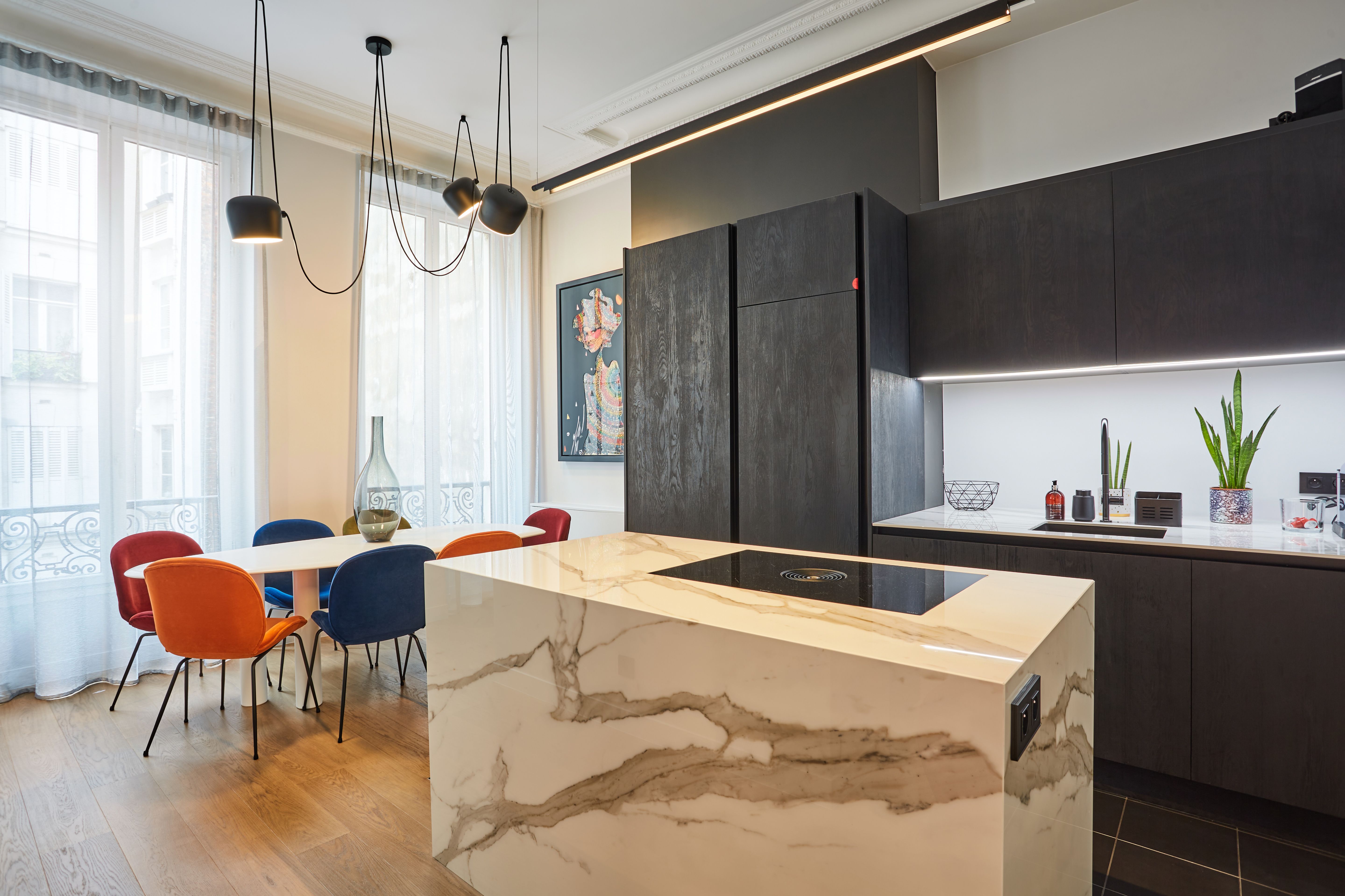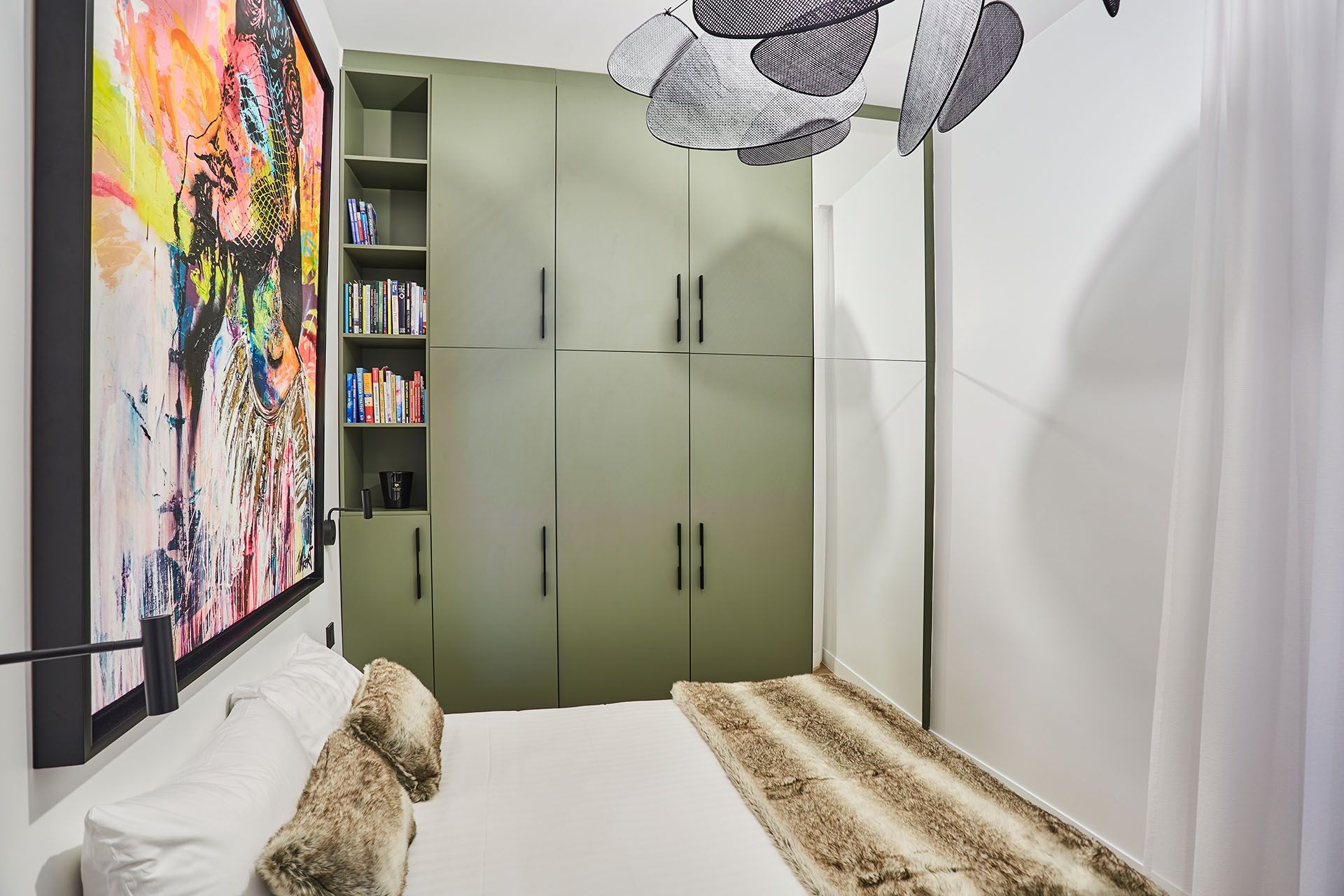 Between the buzzing centre of Paris and the super chic Le Marais neighbourhood, this art-filled apartment is ideal for creative types. It’s a ten-minute walk to the world-class collection of the Louvre, and thirteen minutes to Notre Dame. But stick around in Le Marais, and you’ll find niche museums, bijou boutiques and galleries, and trendy bars. The apartment itself is in a handsome Haussmann building of big windows and wrought-iron balconies. Stepping inside feels like stepping into one of the chichi galleries of Le Marais as big, bold contemporary artworks adorn the white walls in high-ceiling rooms. The French windows in the living room look out over an internal courtyard, so it’s blissfully quiet – perfect if you want to curl up on the velvet sofa with a book from the mini-library. The kitchen is all sleek modernism, with a quartz island and sunny breakfast table for a morning coffee and croissant.