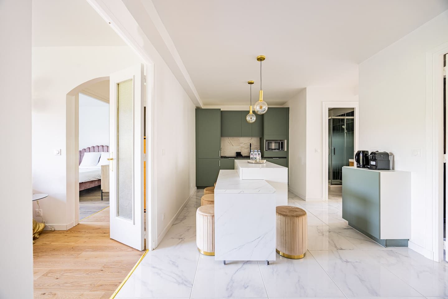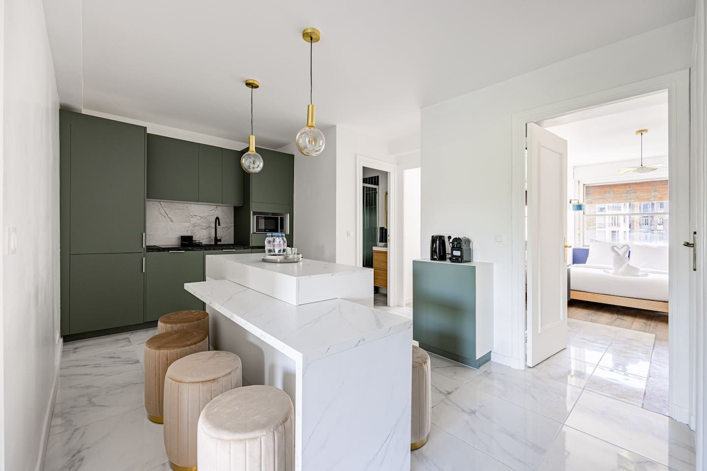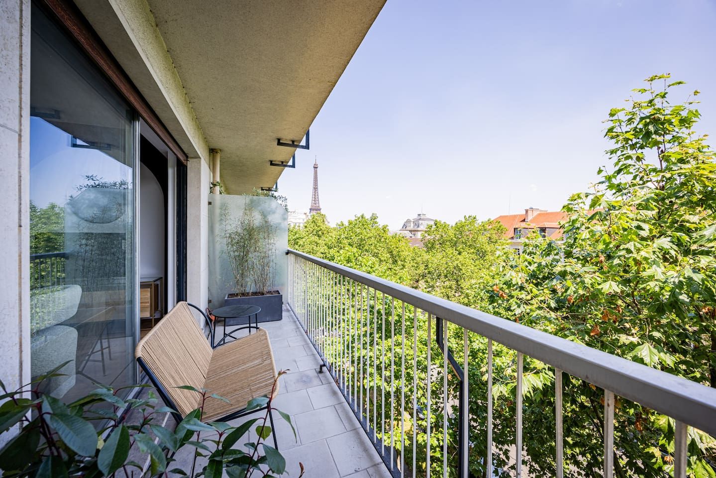 With views of the Eiffel Tower from the large balcony, this apartment is a real find. Off this outdoor space, you’ll find the bright living room, which also sleeps two guests on a sofa bed at full occupancy. There’s a good-sized kitchen here, too, but there’s no oven. There are plenty of restaurants and cafes on your doorstep, though. And there are some key attractions a short stroll away, including the Champ de Mars and the Eiffel Tower. Hôtel des Invalides and the Musée Rodin are also within walking distance of this great home.