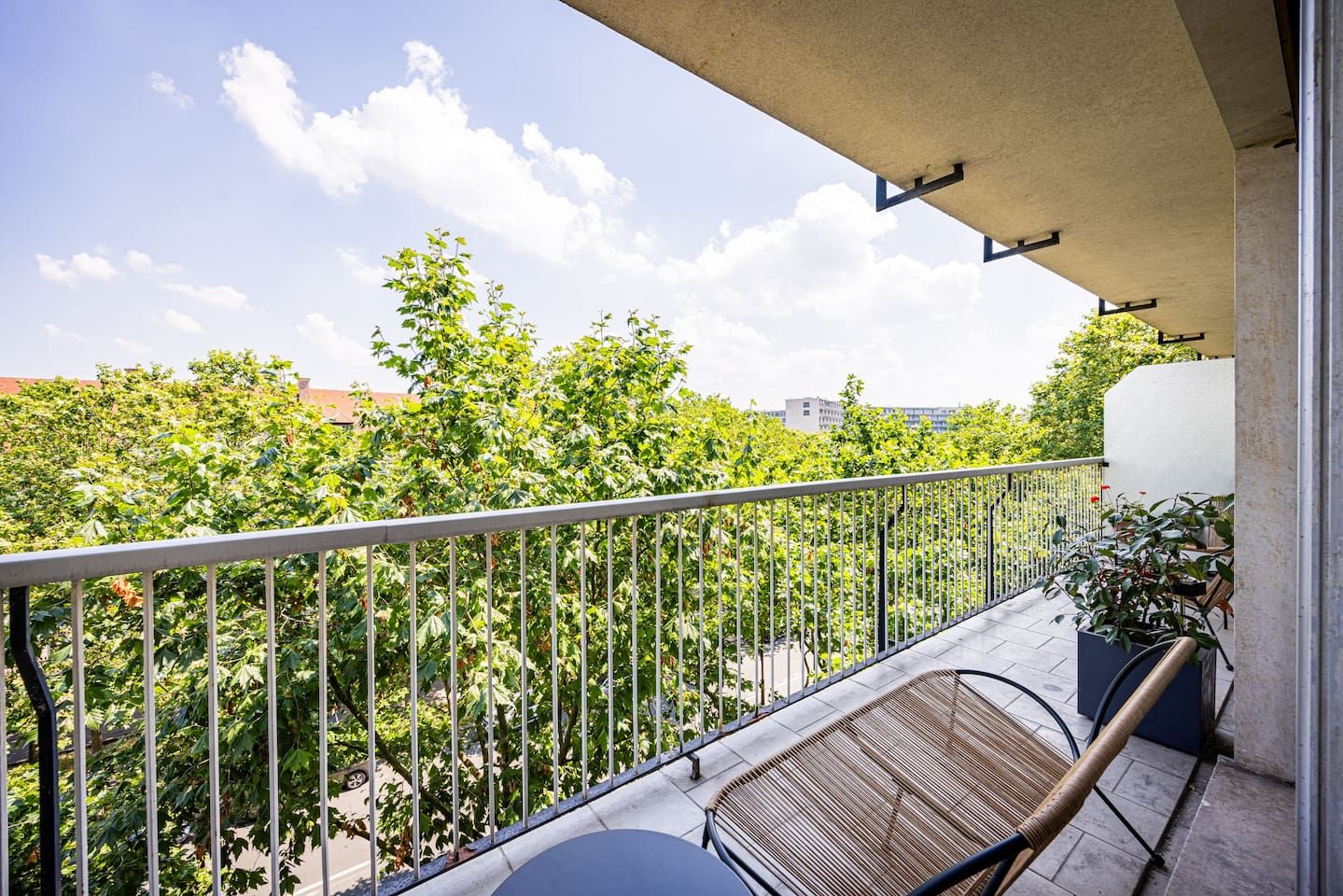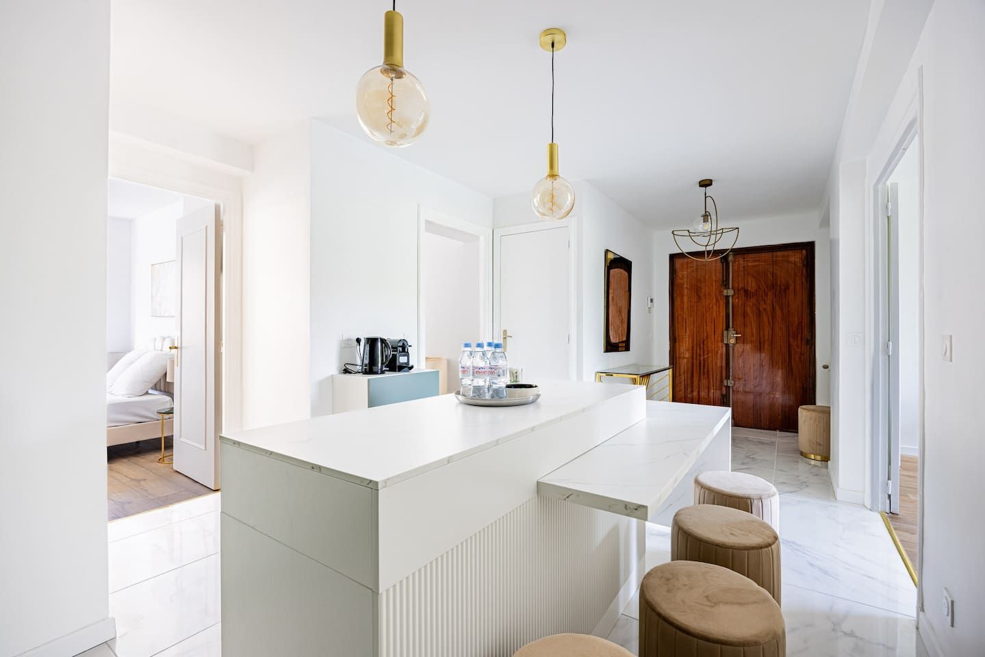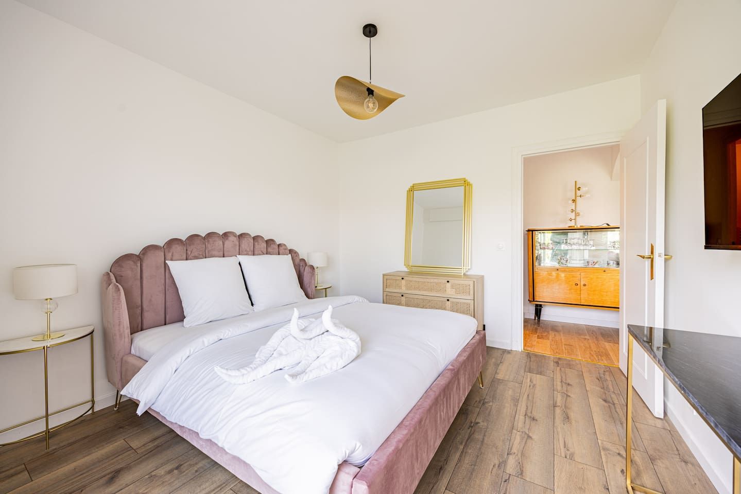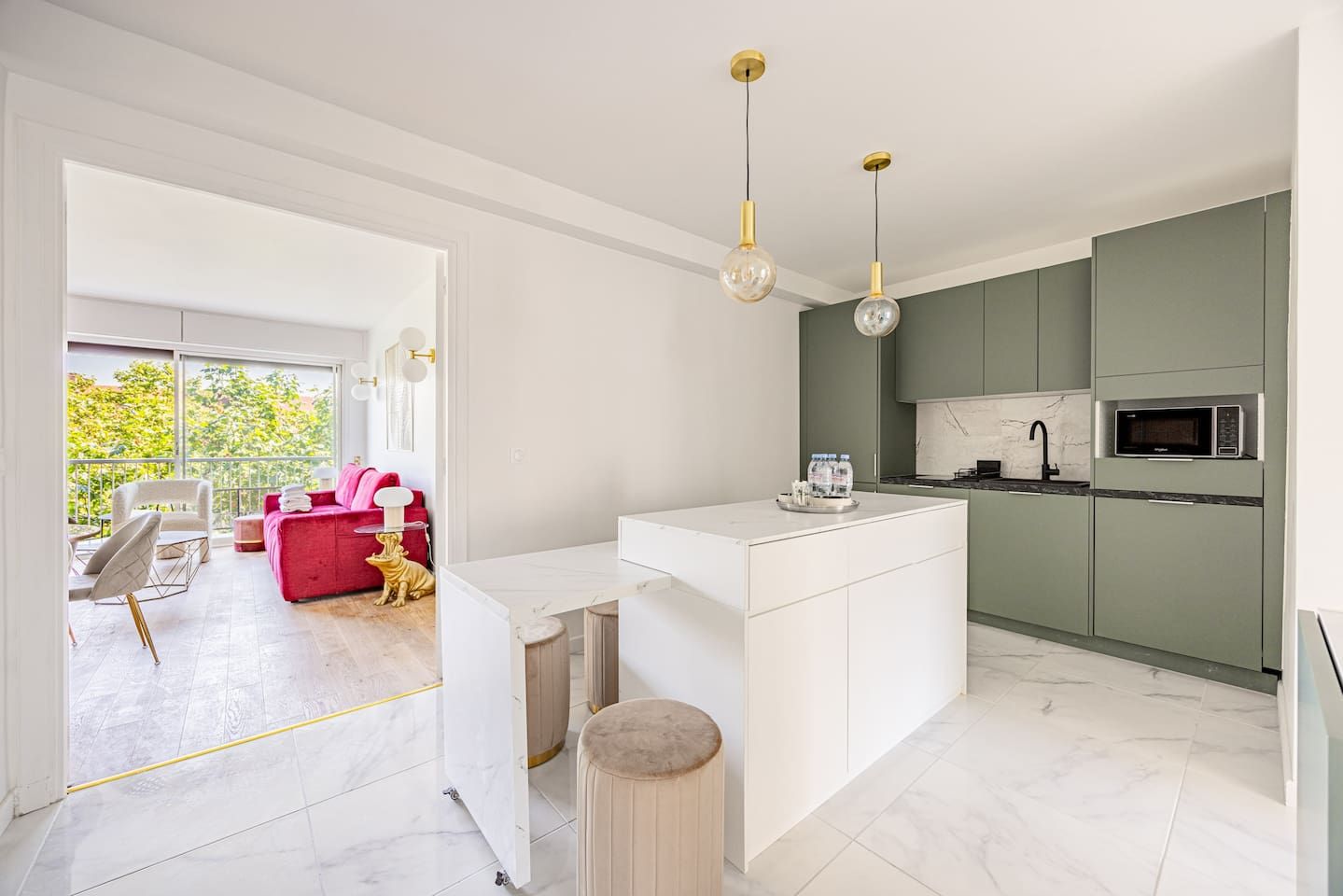With views of the Eiffel Tower from the large balcony, this apartment is a real find. Off this outdoor space, you’ll find the bright living room, which also sleeps two guests on a sofa bed at full occupancy. There’s a good-sized kitchen here, too, but there’s no oven. There are plenty of restaurants and cafes on your doorstep, though. And there are some key attractions a short stroll away, including the Champ de Mars and the Eiffel Tower. Hôtel des Invalides and the Musée Rodin are also within walking distance of this great home.