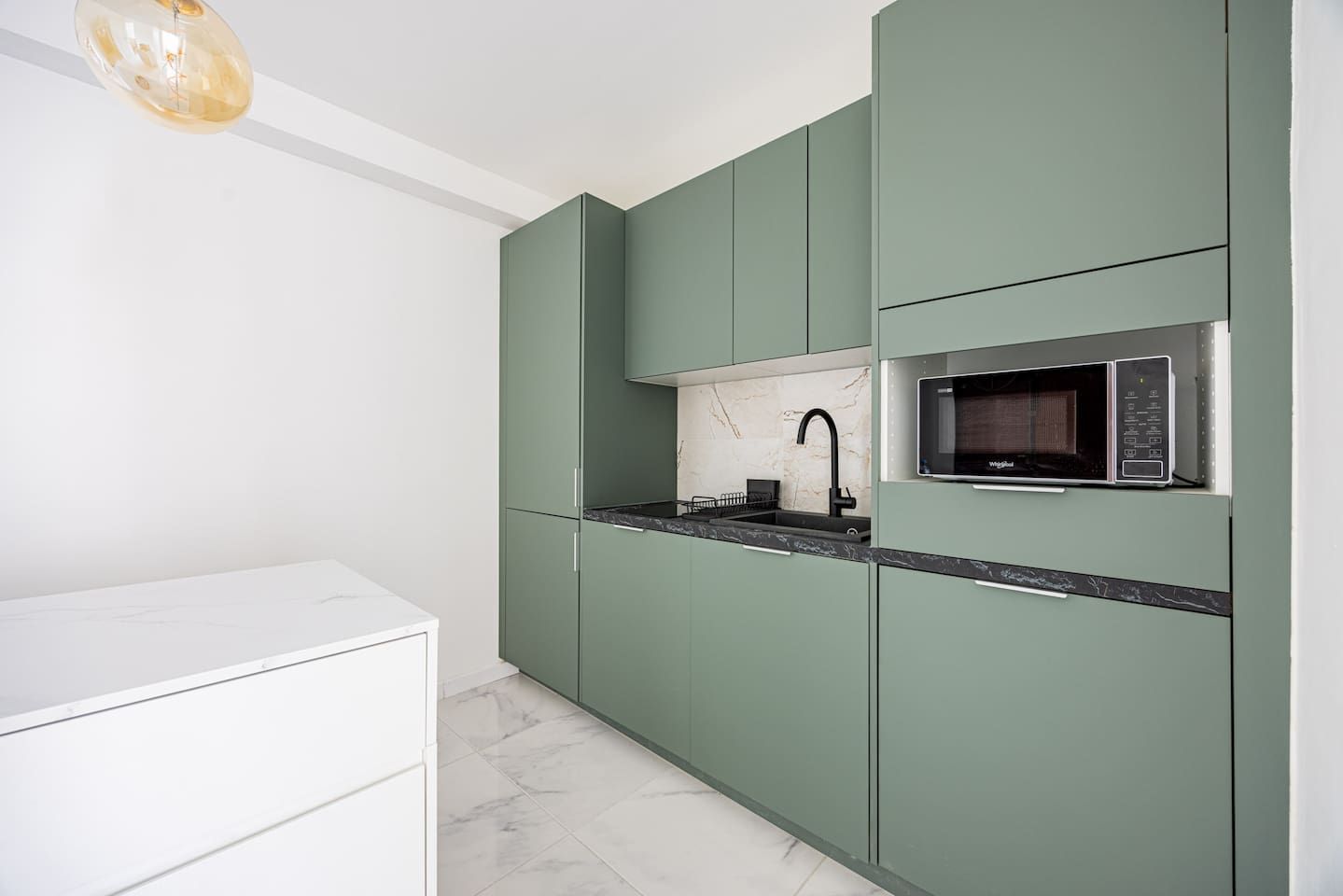 *The kitchen has no oven, but there’s a microwave and a hob.