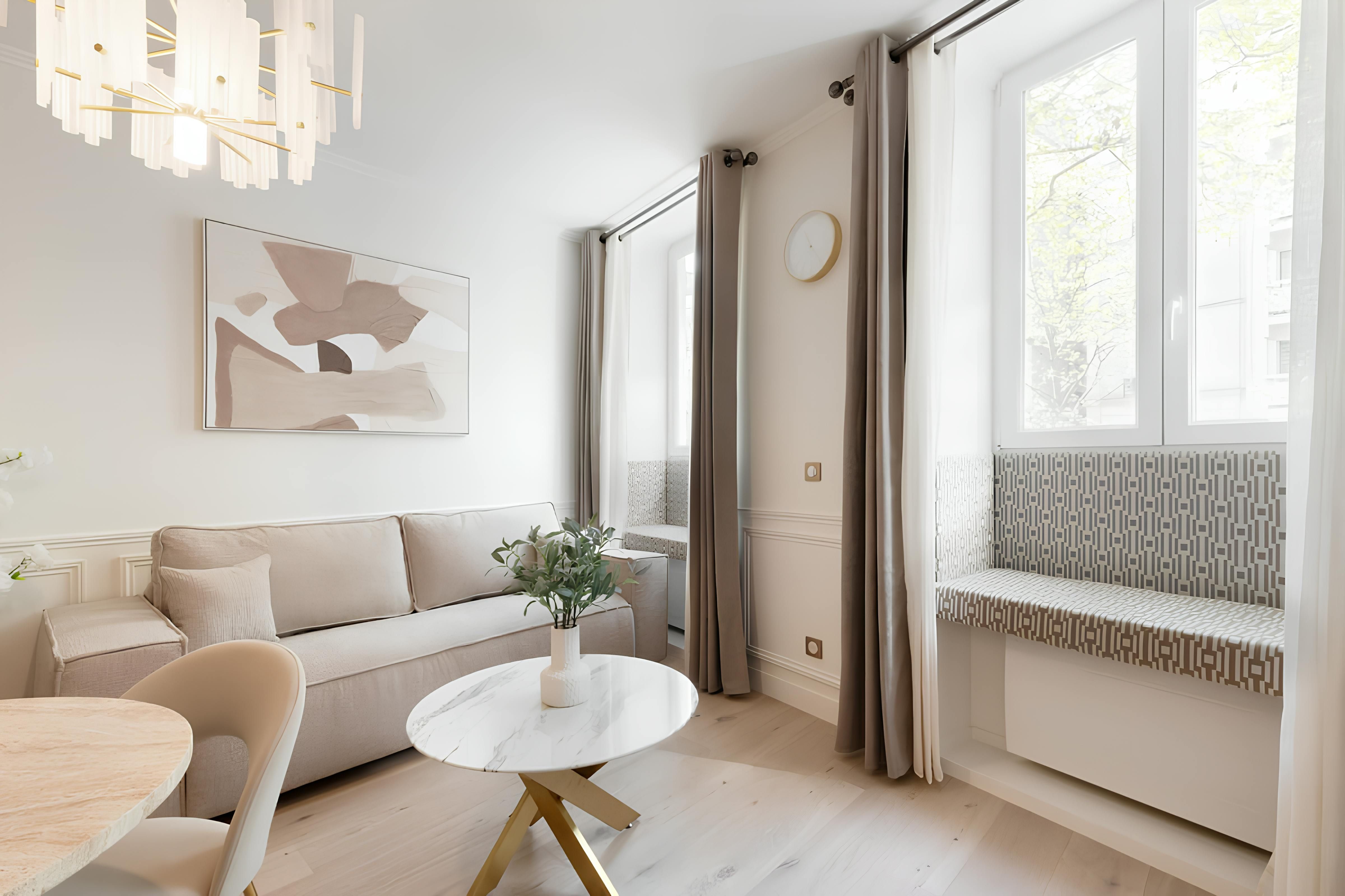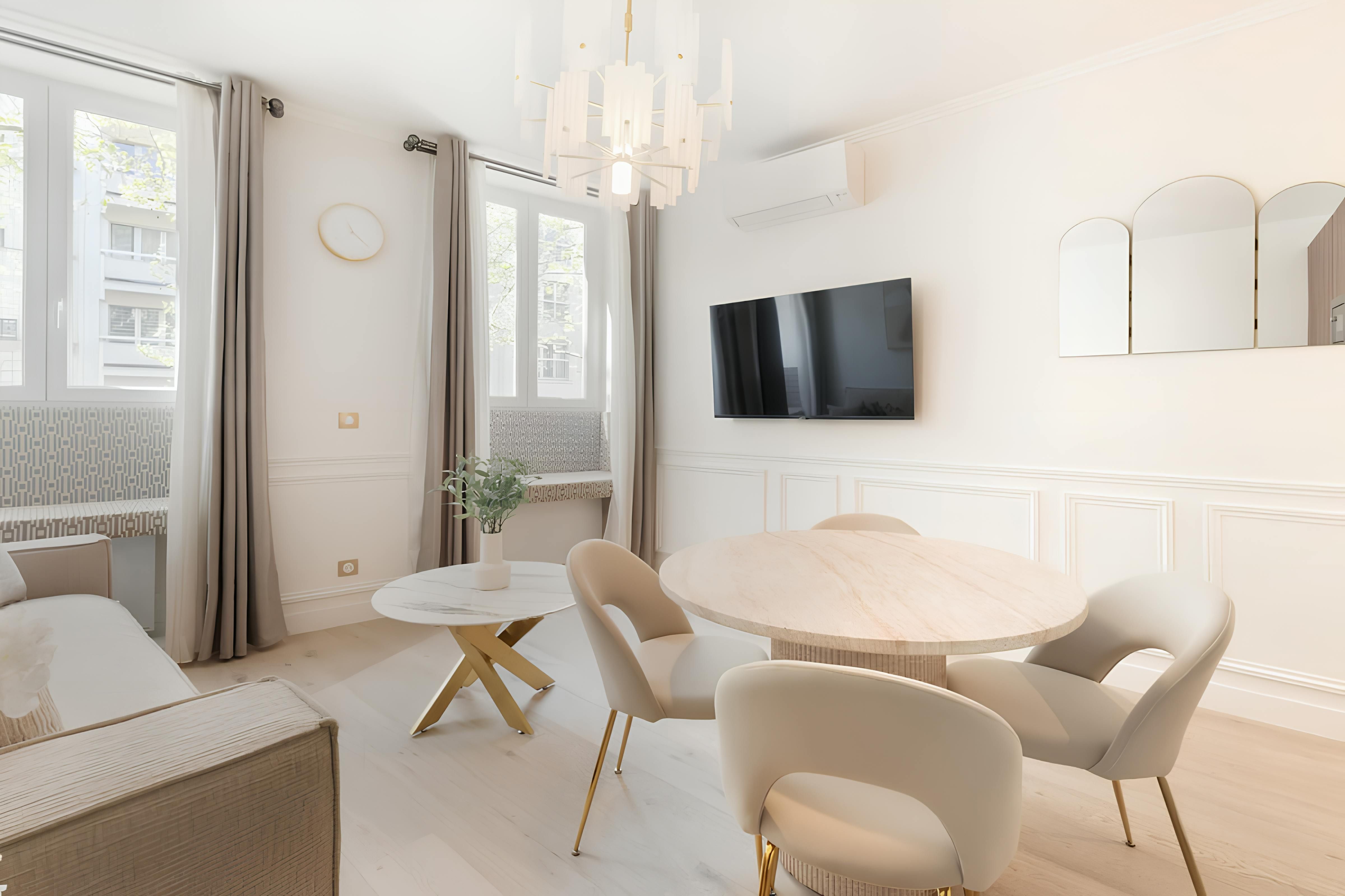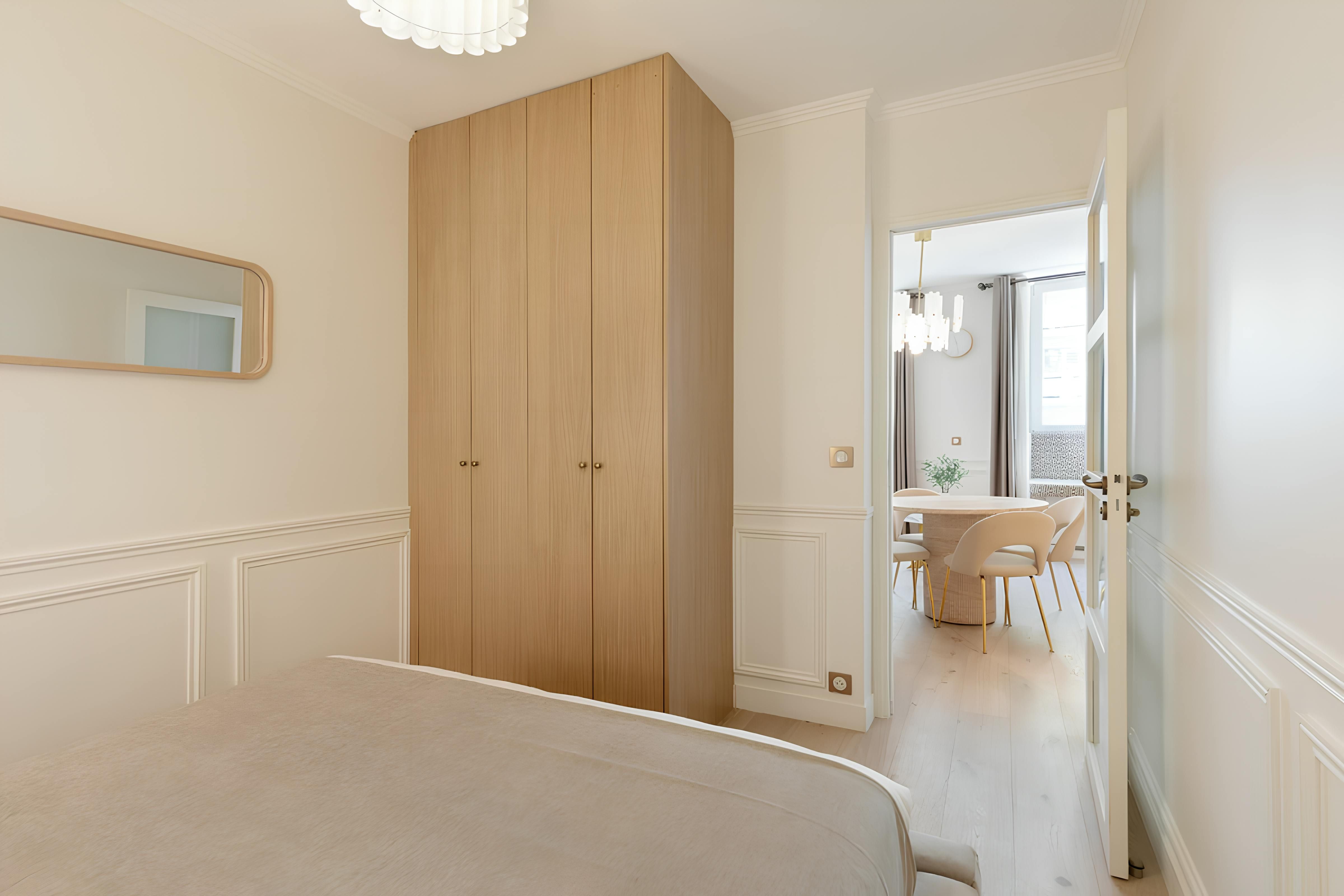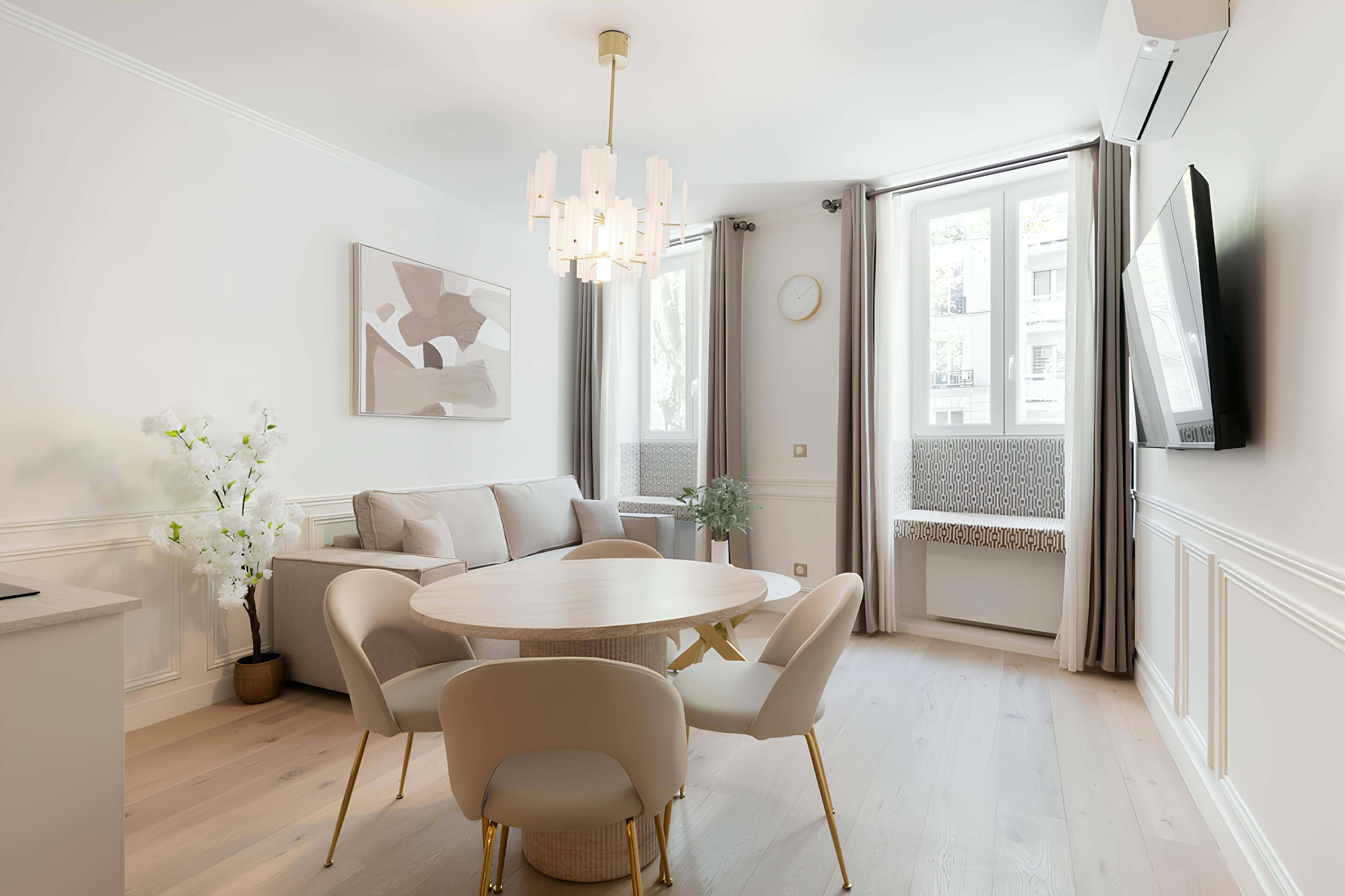 Elegant but comfortable, this apartment is a great Parisian base. It’s modern and practical, with a kitchenette and an open-plan living and dining space. This is where two guests will sleep on a sofa bed – if you want more space, a maximum occupancy of two might be more suitable. The apartment is cleaned each day, which helps to keep things organised. This home is next to Parc Clichy Batignolles, with Brochant Metro station a few minutes away, giving you easy access to the rest of Paris.