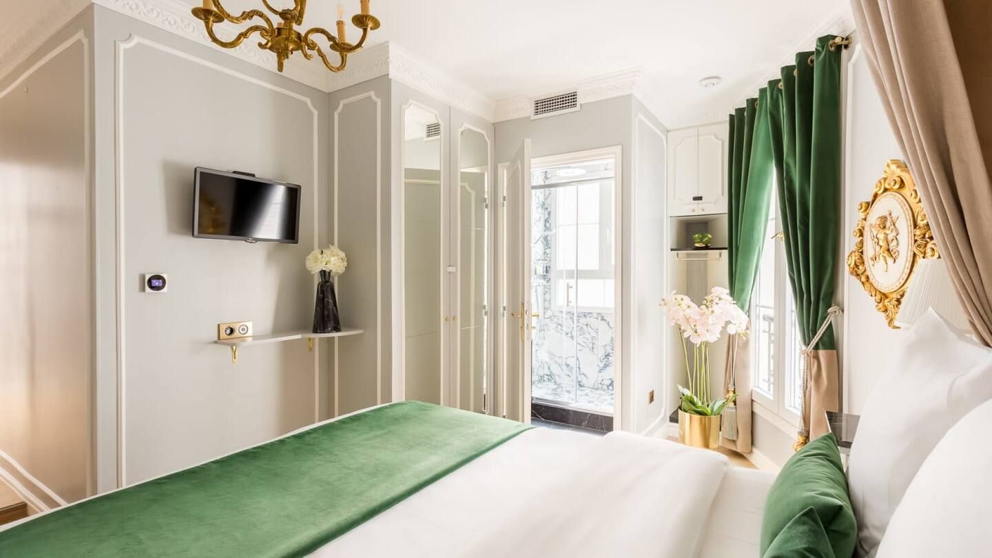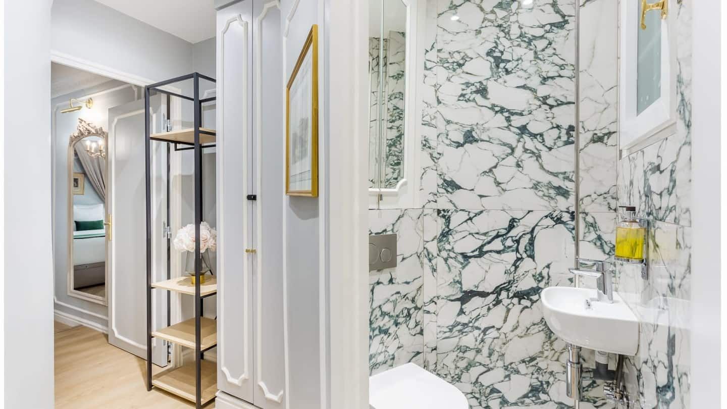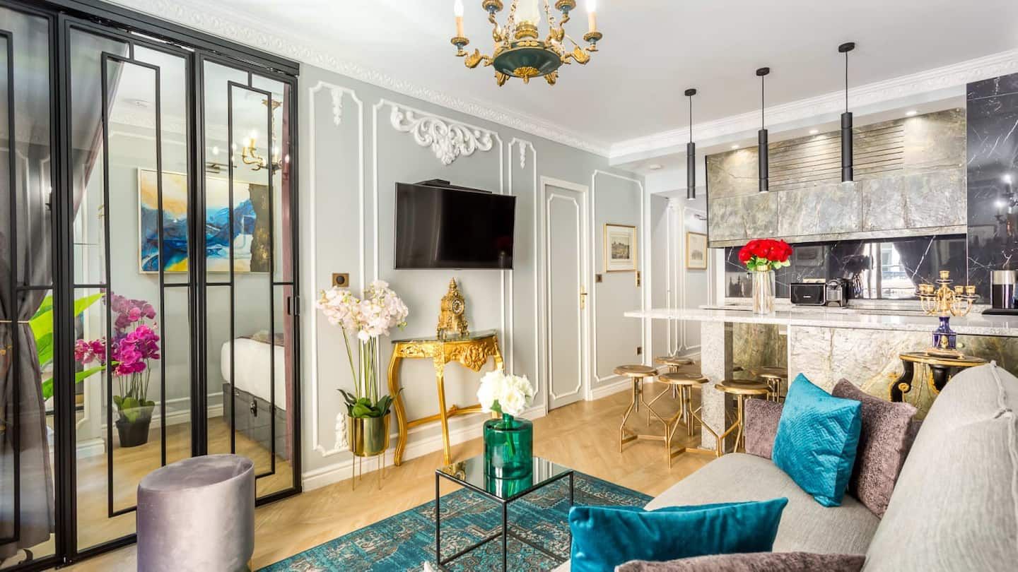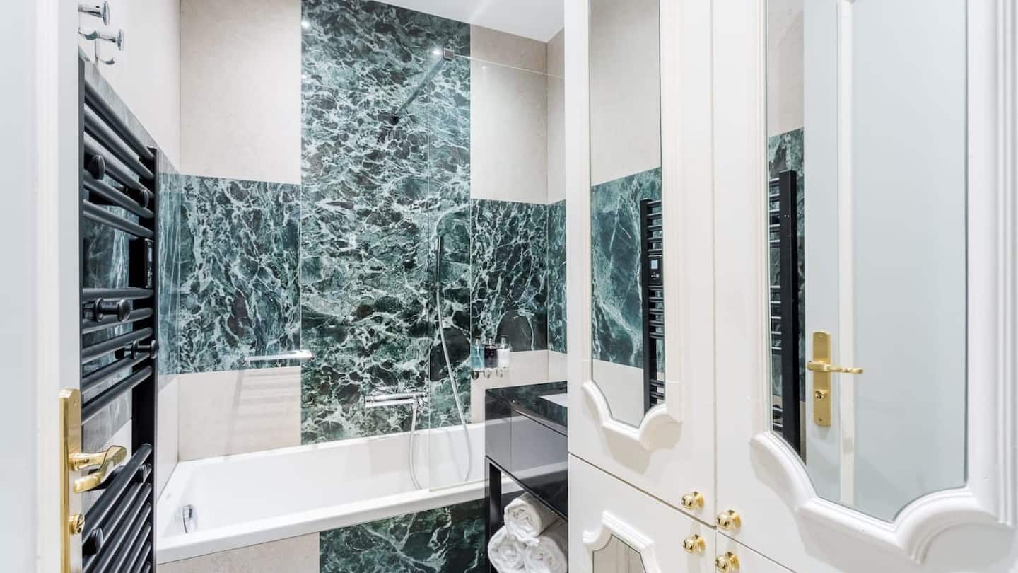 Exuding elegance and sophistication, this stunning apartment housed in a heritage building dating back to 1784 under the reign of King Louis XVI has been charmingly renovated by an esteemed Parisian architect to make for a luxurious home in the heart of the city of love. Just fifty metres from the Champs-Élysées, you really couldn't be better placed for shopping, sightseeing and flat white sipping in the sunshine – there's a host of classy cafés dotted below. Tick some of the most beloved sights in Paris off your bucket list. Ascend to the top of the Iron Lady with a ten-minute stroll to the Eiffel Tower, and visit the Arc de Triomphe only a couple of kilometres from your door. Back inside, from the moment you enter you'll feel the graceful ambience surrounding this palatial interior, benefitting from gold-trimmed furnishings, ornate mouldings and dazzling chandeliers. After a restful night's sleep in the mint green master bedroom that's fit for royalty, sit down for your morning croissants and coffee at the marble-topped breakfast bar. Speaking of, you'll notice the striking marble-clad bathrooms (all three of them) – there's no queuing for the shower here. Everything has been done with class and comfort in mind within this diamond of an apartment.